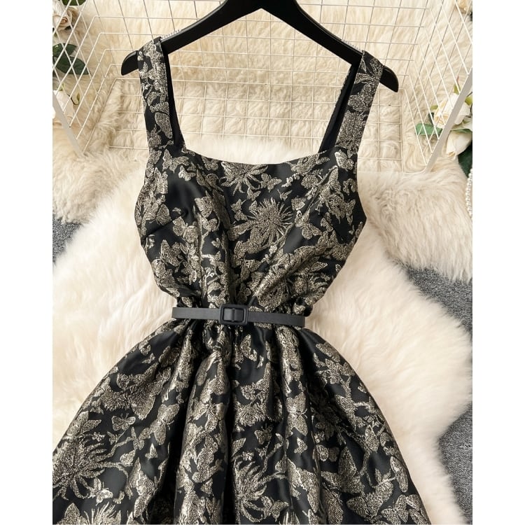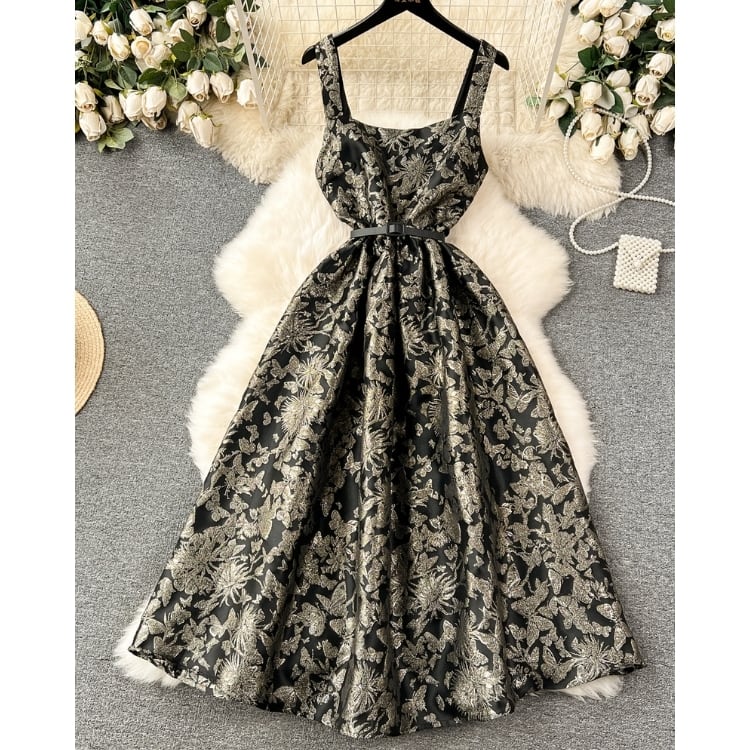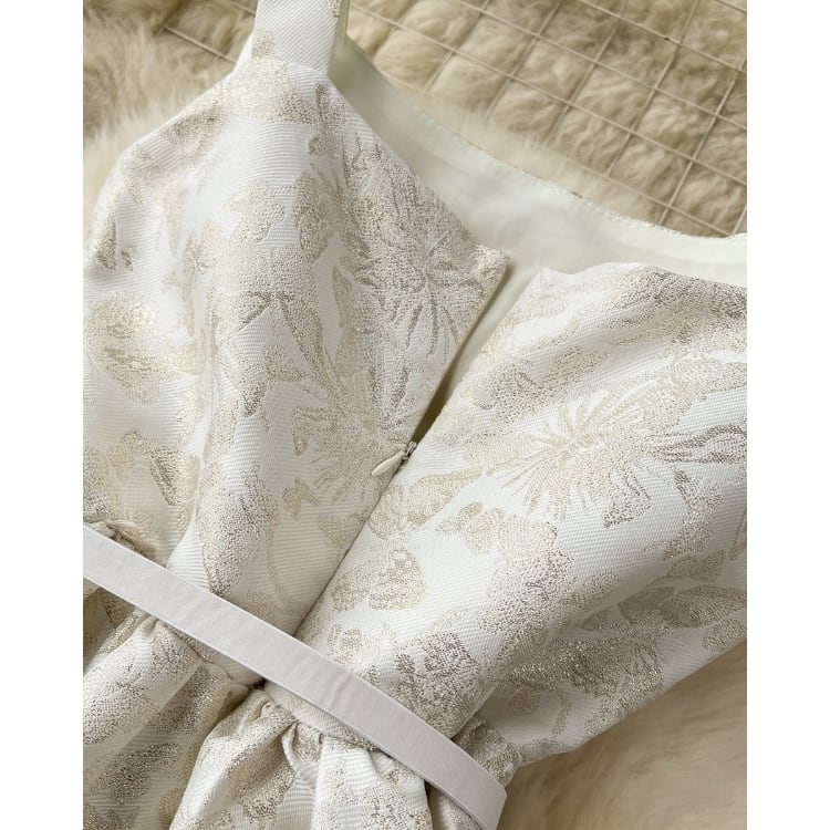 陰影のあるフラワーデザインが際立つ、シックで華やかなワンピースです。