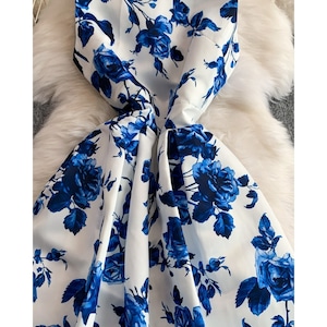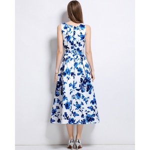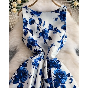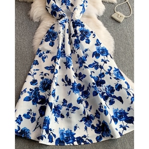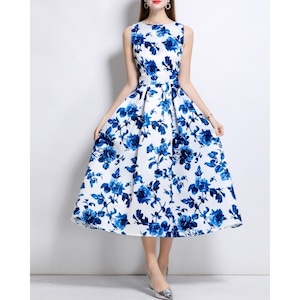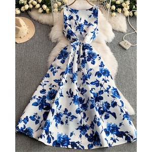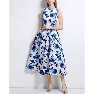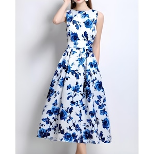 清涼感のあるブルーフラワーモチーフが映え、凛とした華やかさを纏えるワンピースです。