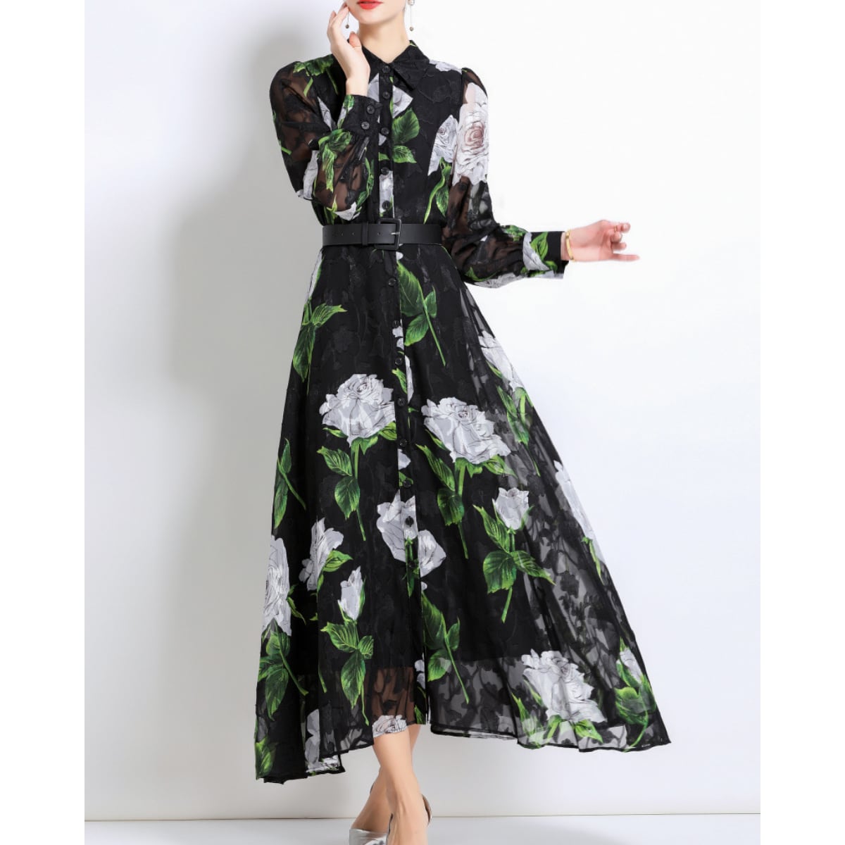 大胆に描かれたフラワーモチーフが印象的で、凛とした美しさを放つロングワンピースです。