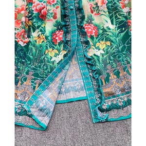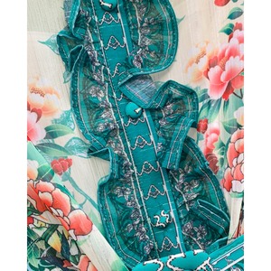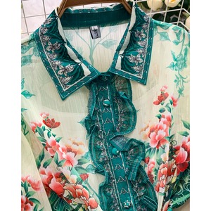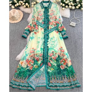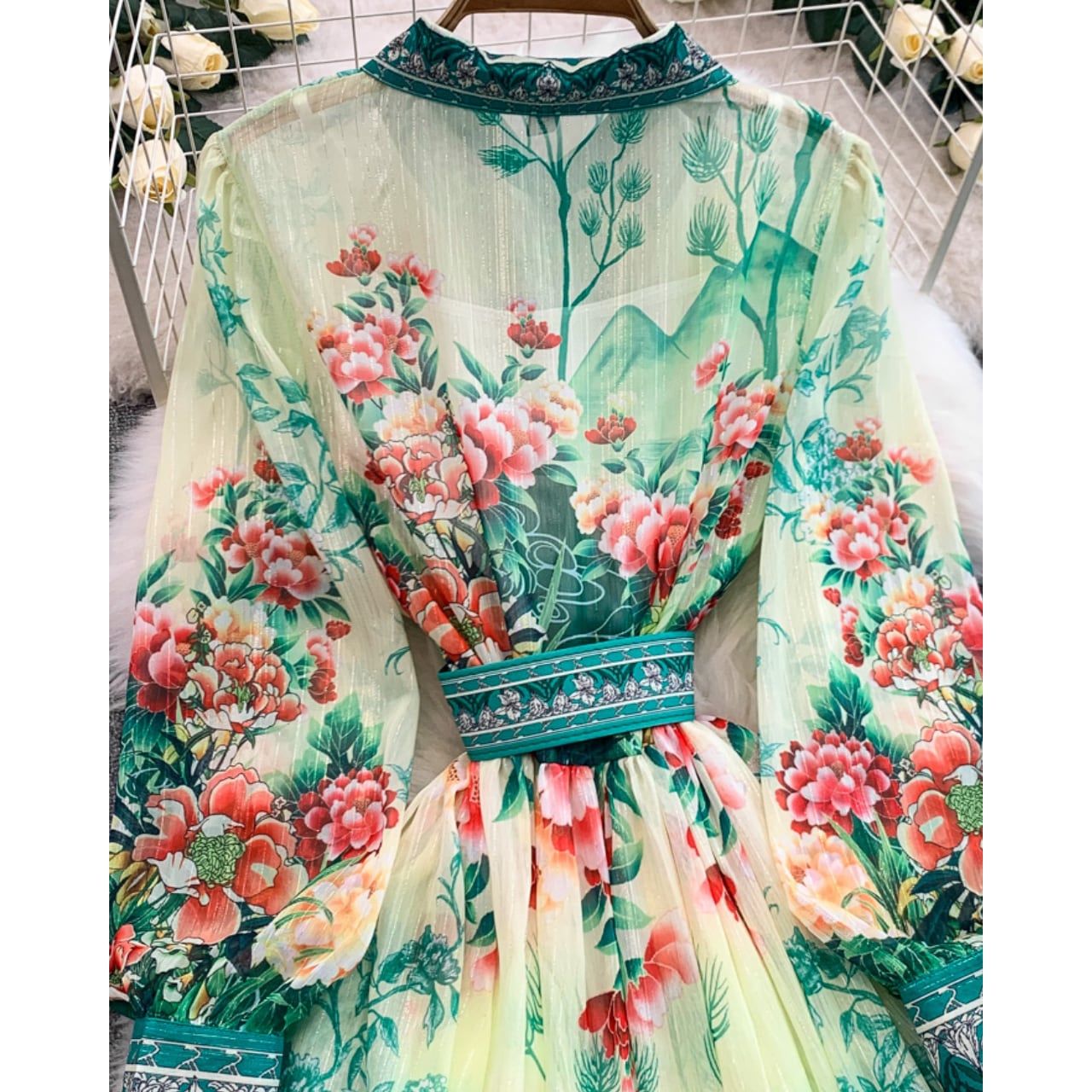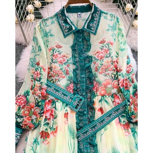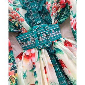 全面に広がる華やかなフラワーモチーフが、視線を惹きつける存在感のあるワンピースです。