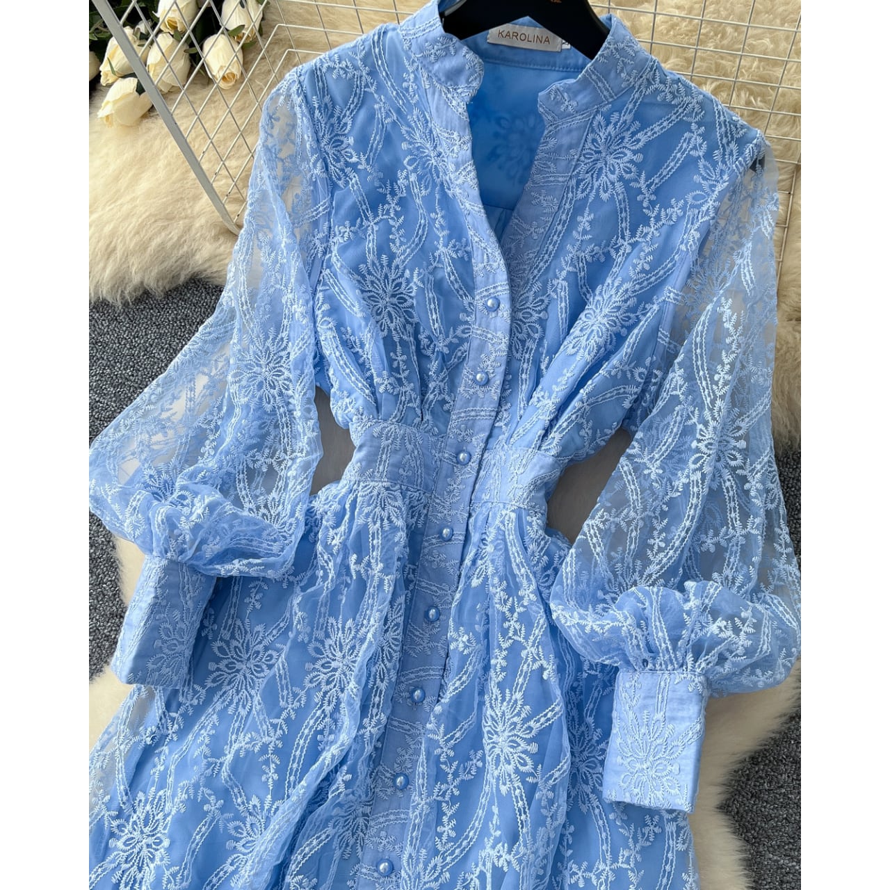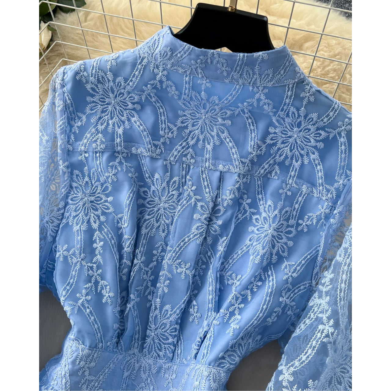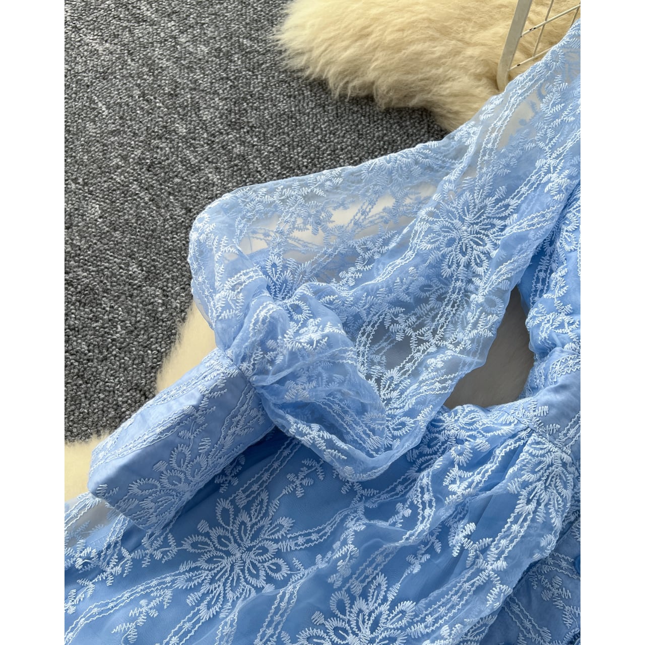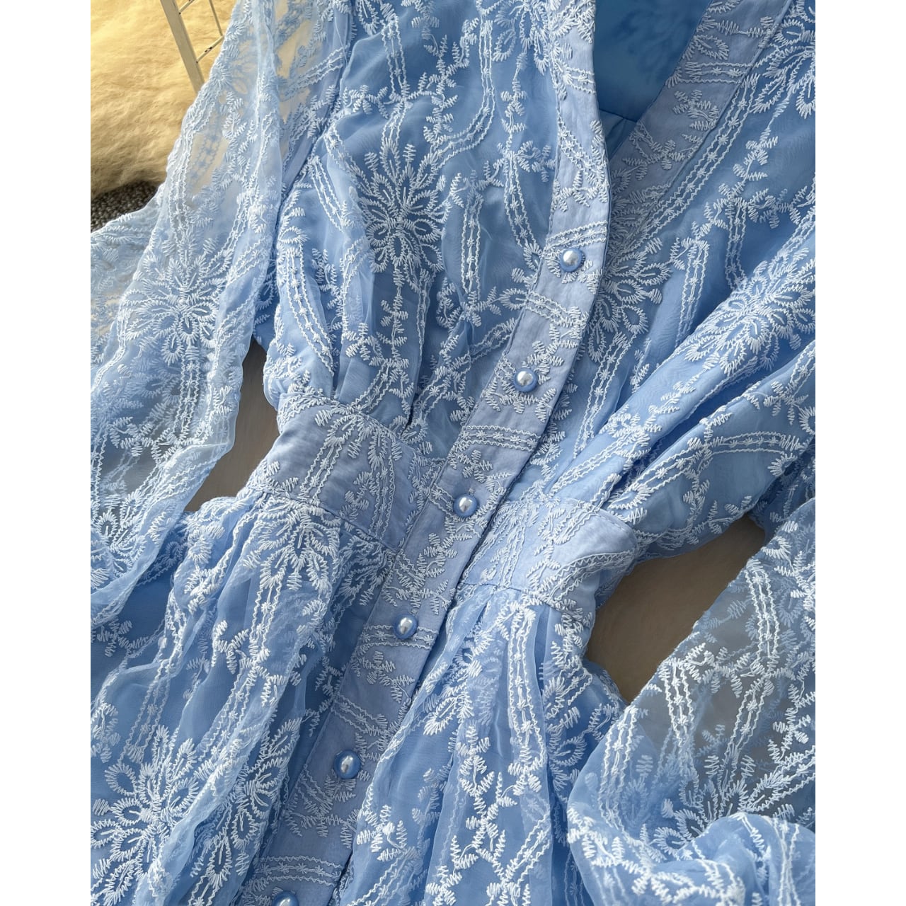 繊細な模様が全体に広がる、透明感と気品を併せ持つワンピースです。