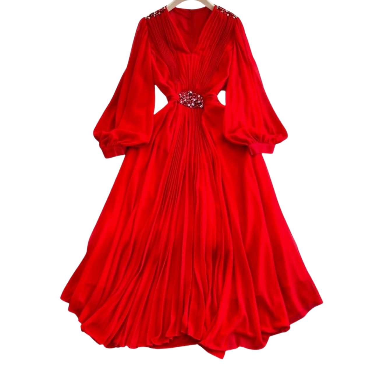 ウエストのビジューが煌めき、視線を惹きつけるエレガントな一着。
