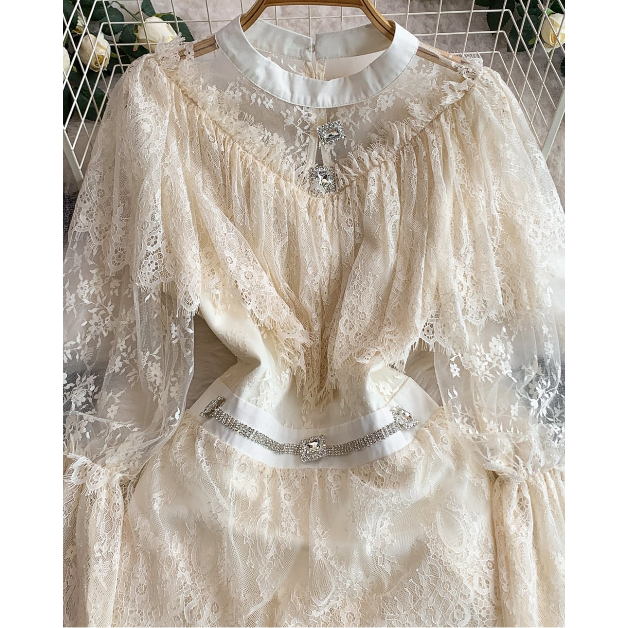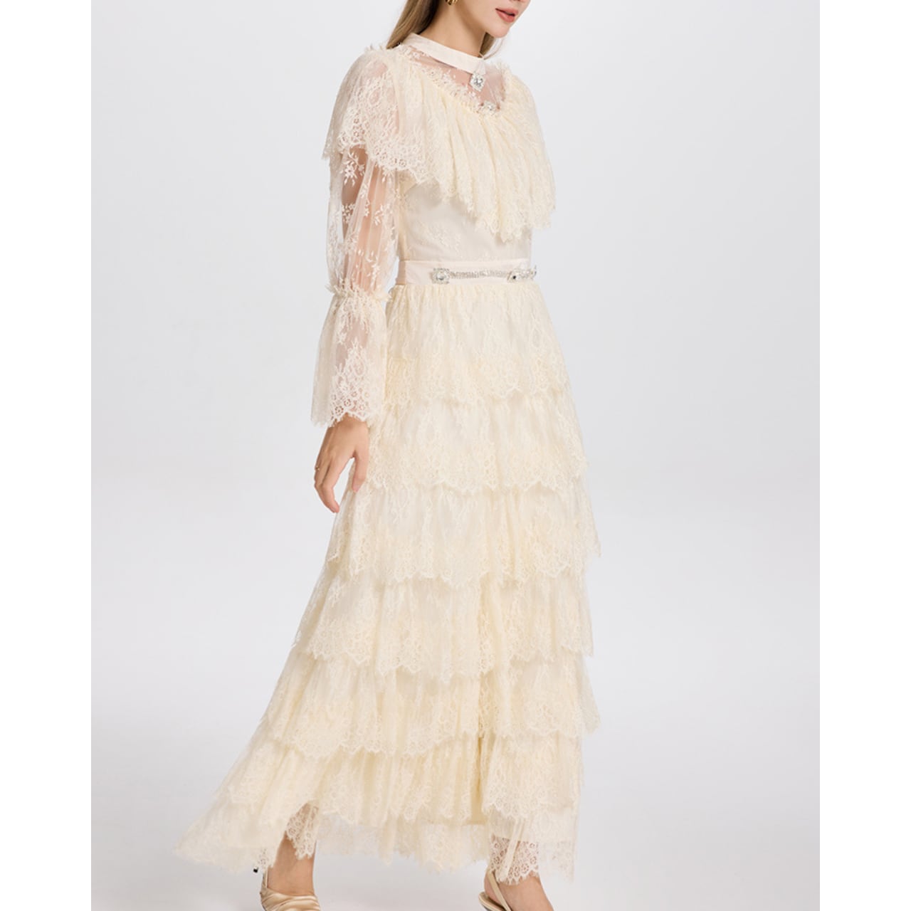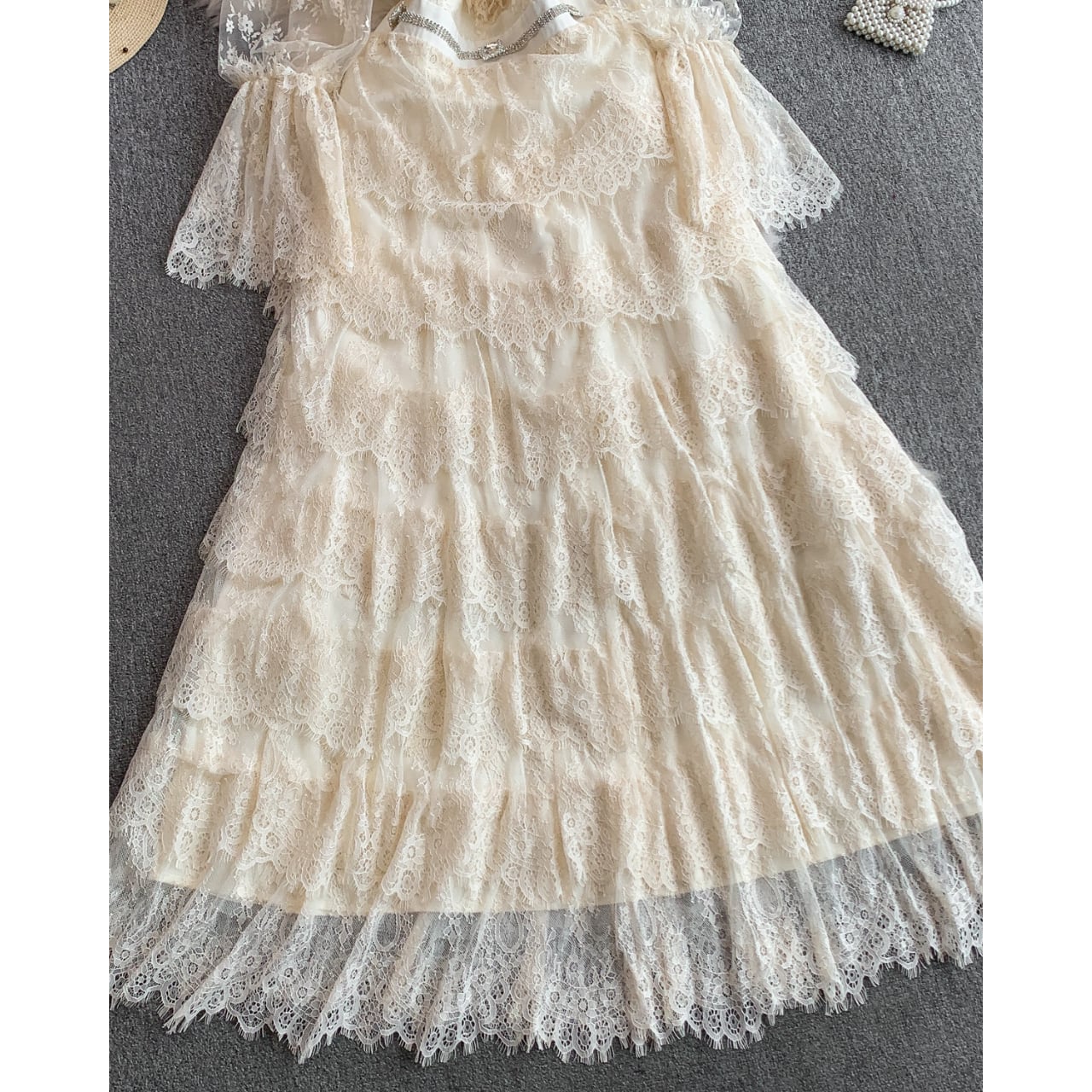 やわらかなアイボリーレースがふんわりと重なり、花びらのように広がるティアードワンピース。