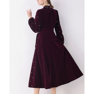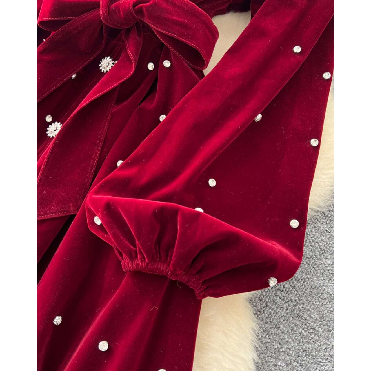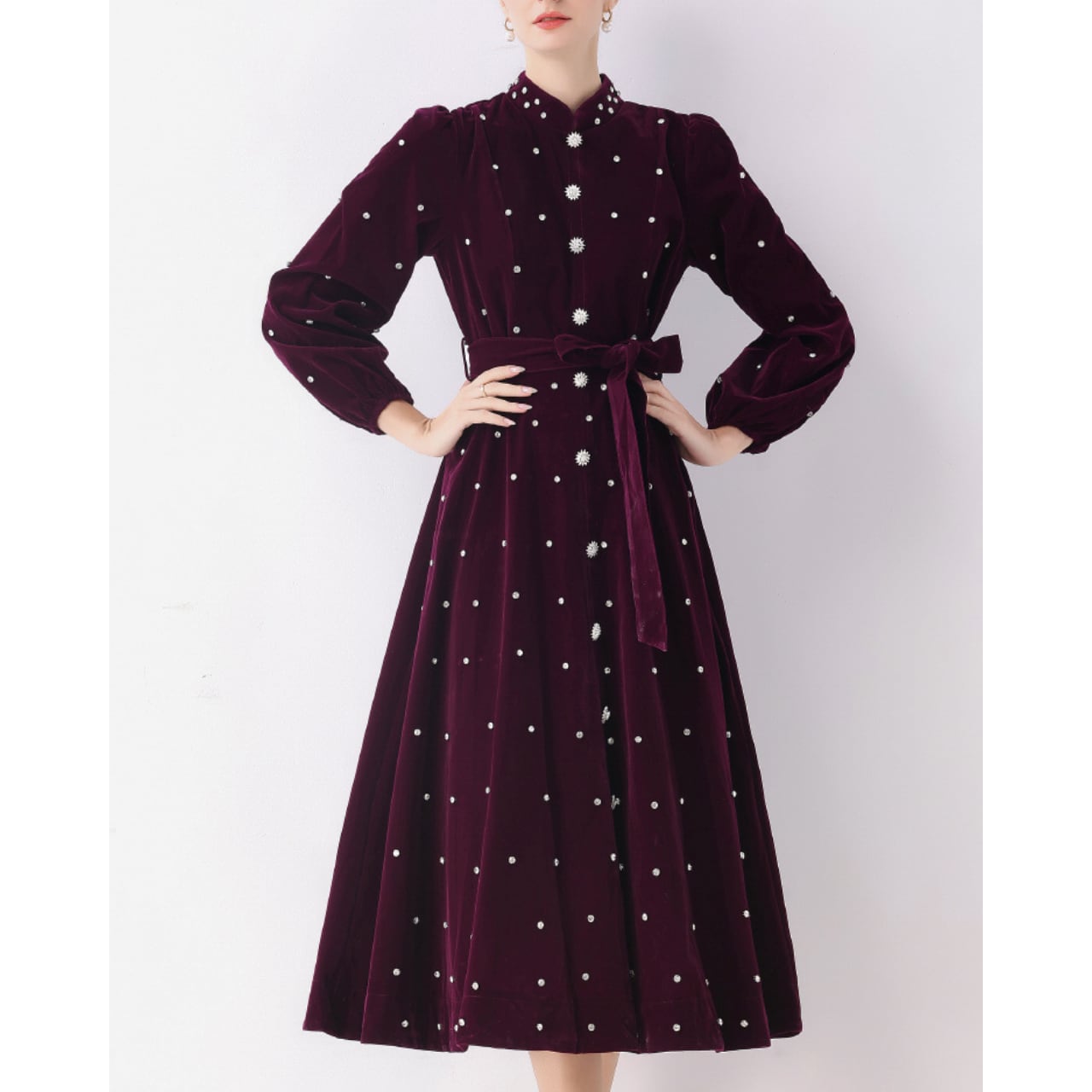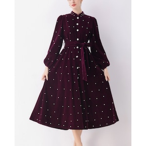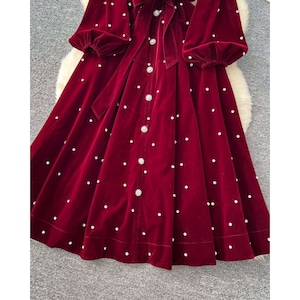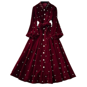 深みのあるレッドカラーにパールを散りばめた、エレガントなクラシックワンピース。