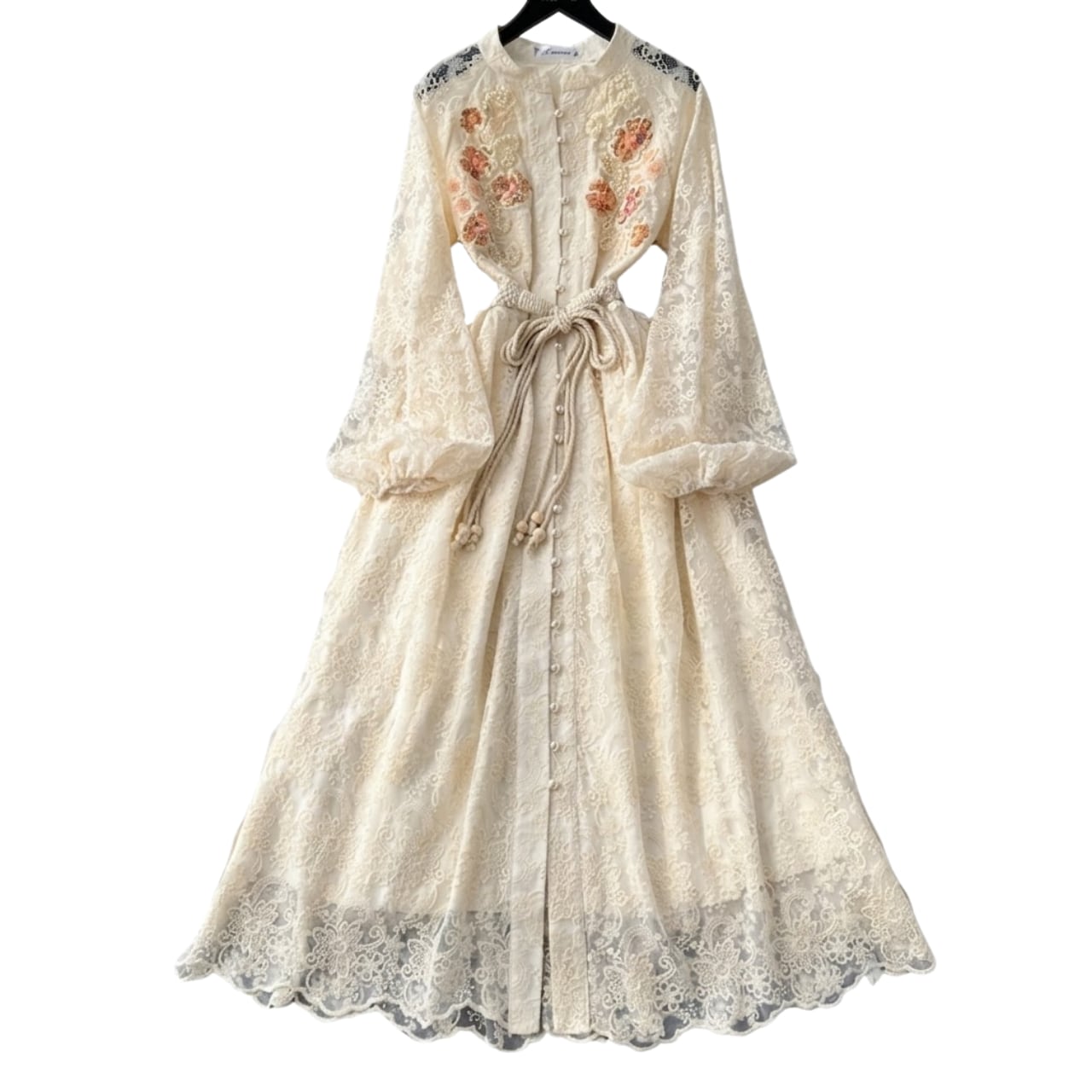 繊細なレースに立体的な花刺繍をあしらった、優雅なロマンティックワンピース。