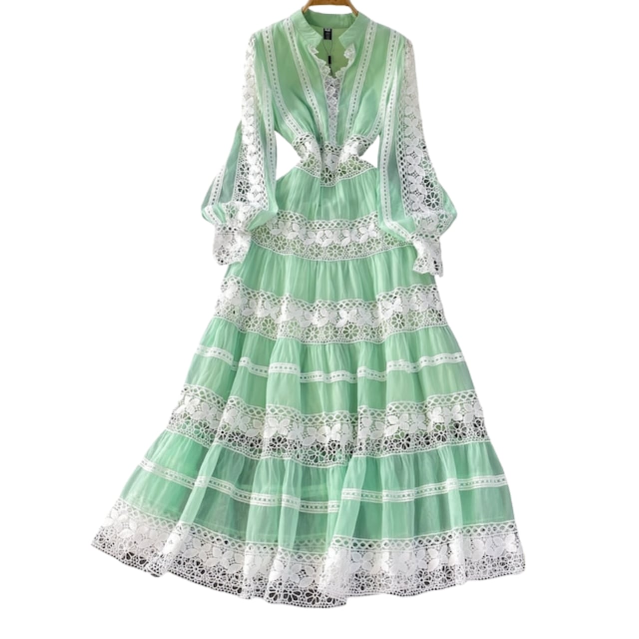 繊細な装飾を贅沢に重ねたデザインが、清楚さと華やかさを併せ持つエレガントなワンピース。