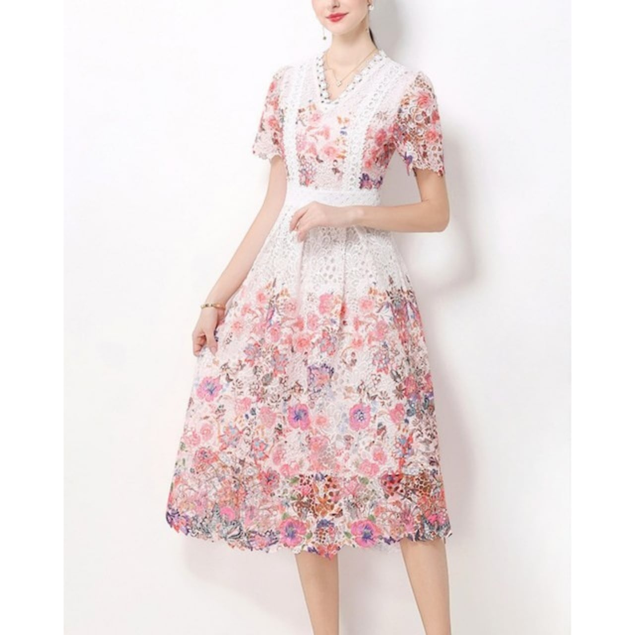 全3色 / フラワー刺繍レース切替Vネックワンピース L2052