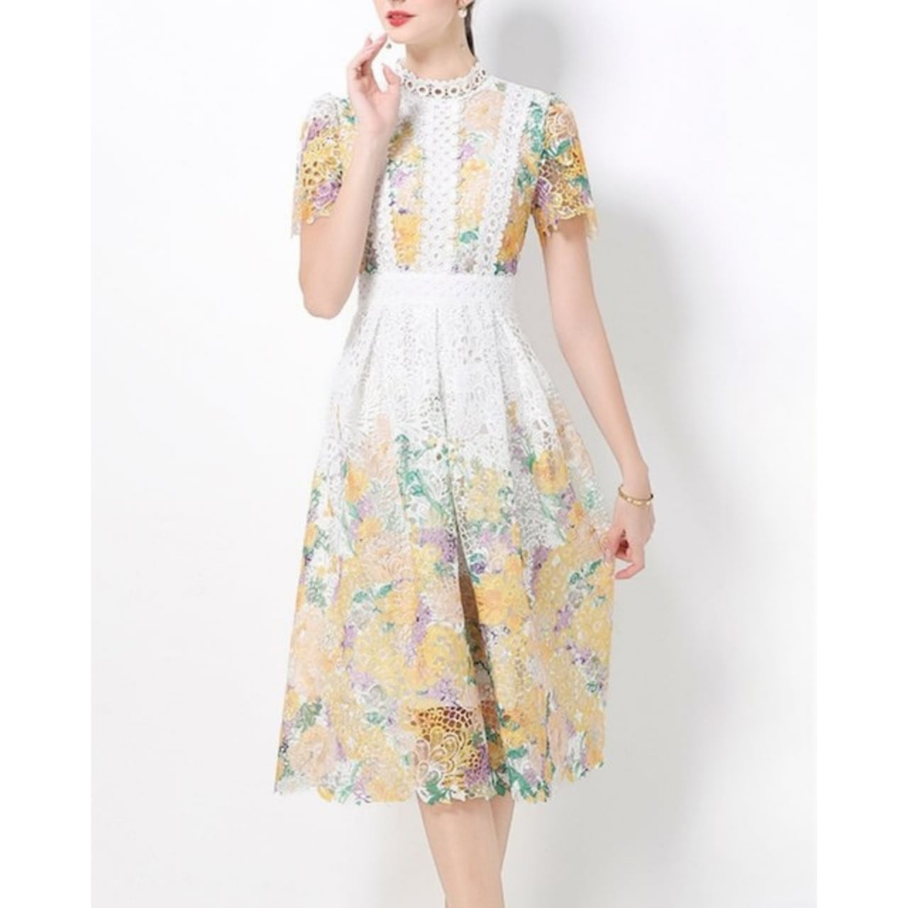 繊細なレースとフラワーモチーフが重なり、可憐さと上品さを併せ持つワンピースです。