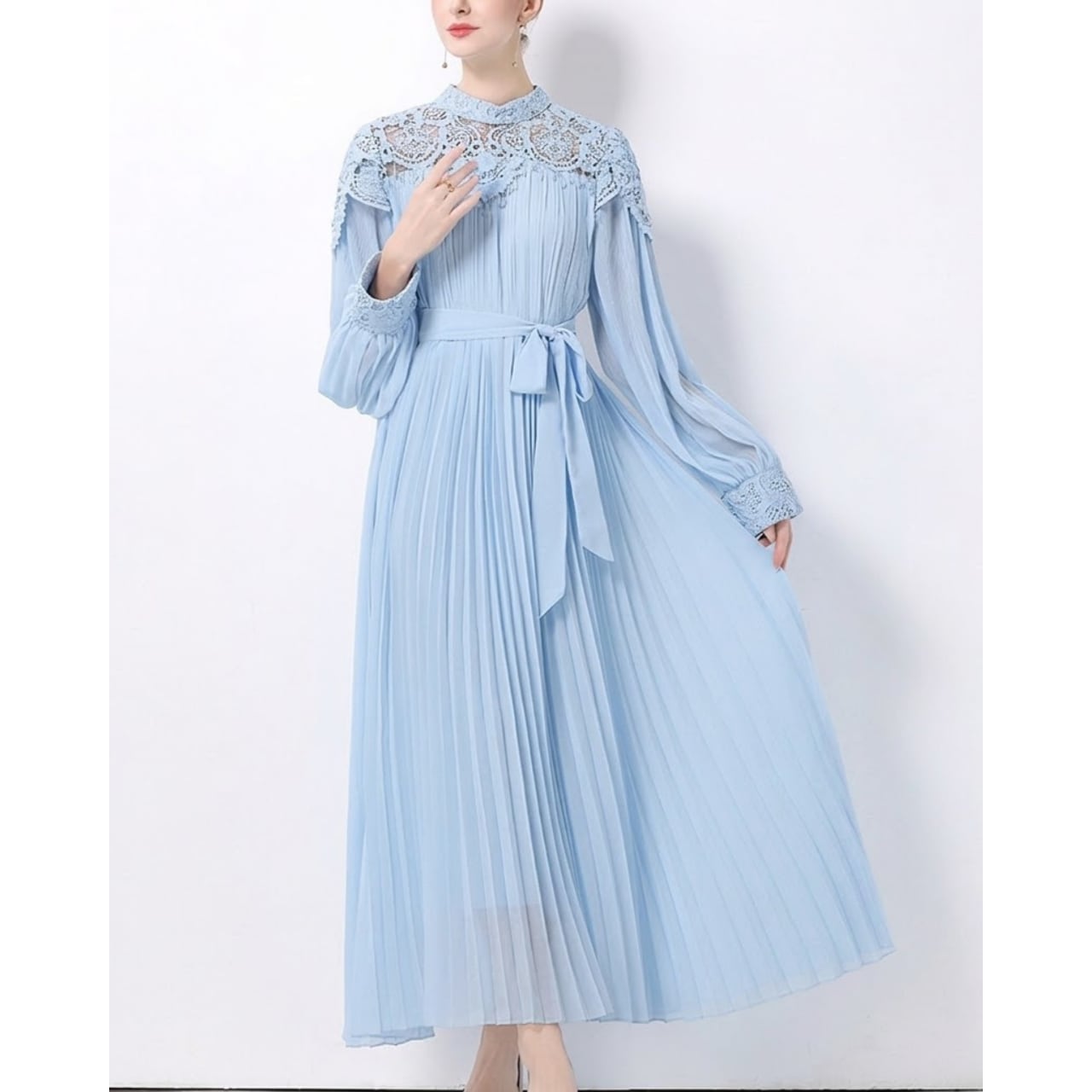 繊細なレースヨークと流れるようなプリーツが重なり、上品で華やかな佇まいを演出するワンピースです。