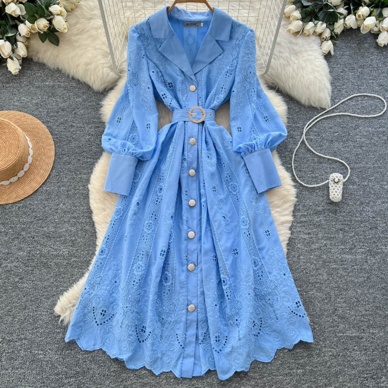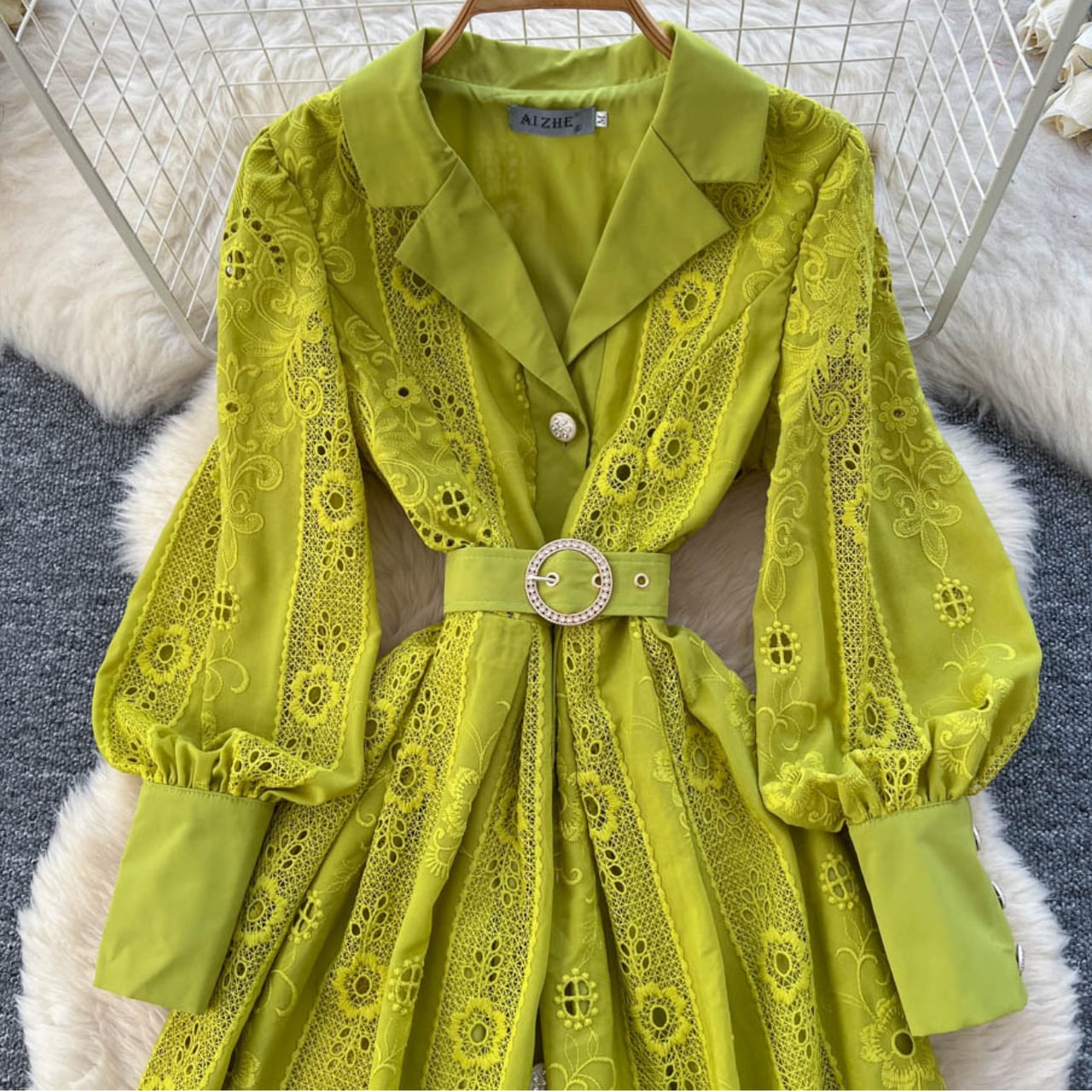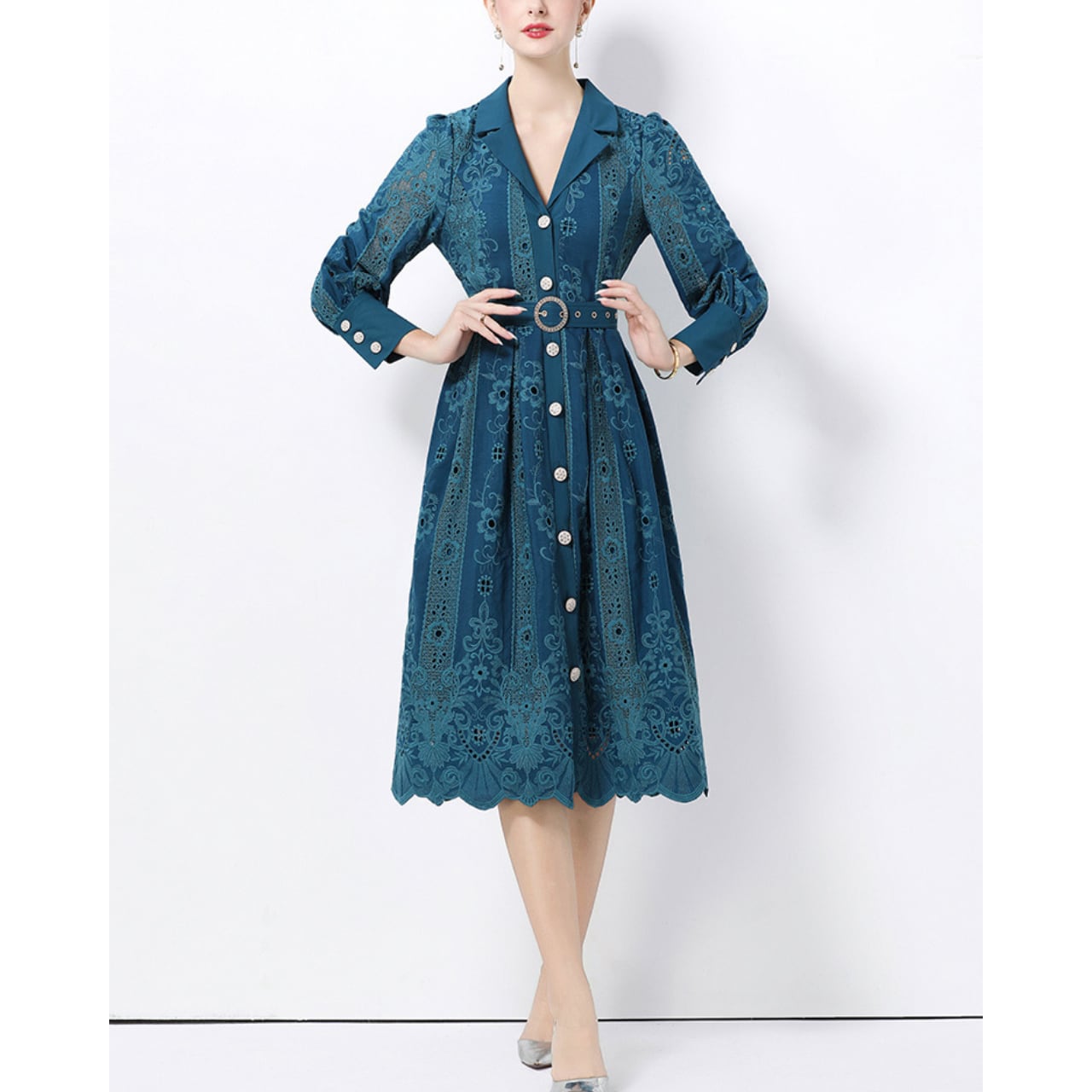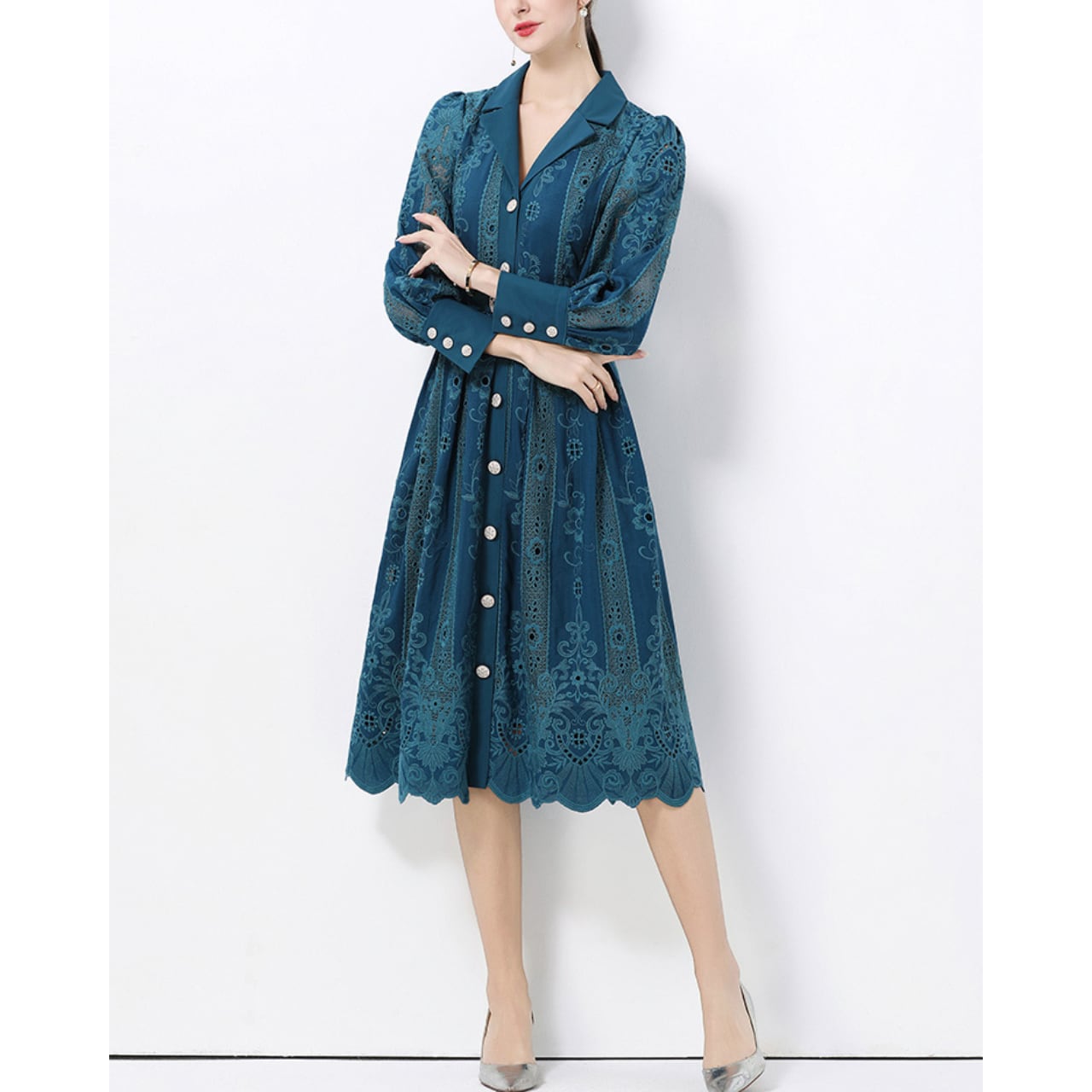 シャープな襟元とウエストマークが全体を引き締め、自然と美しいシルエットを描きます。