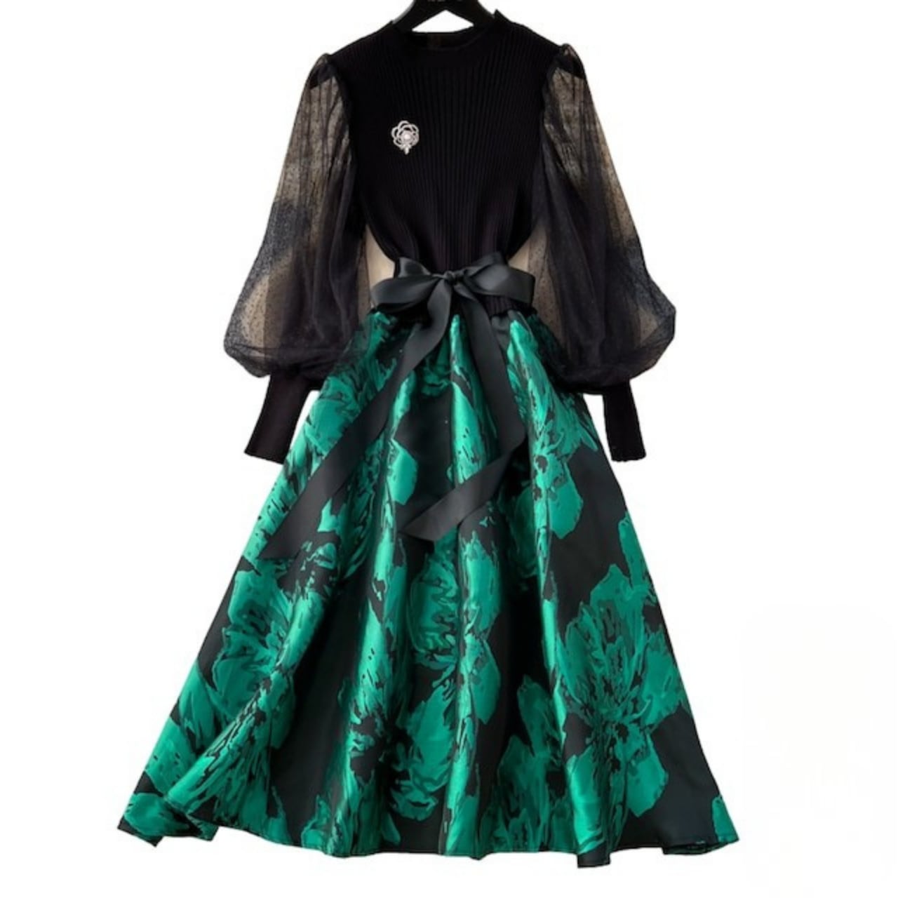 上身頃の端正な表情とスカートの華やかなコントラストが印象的なワンピースです。