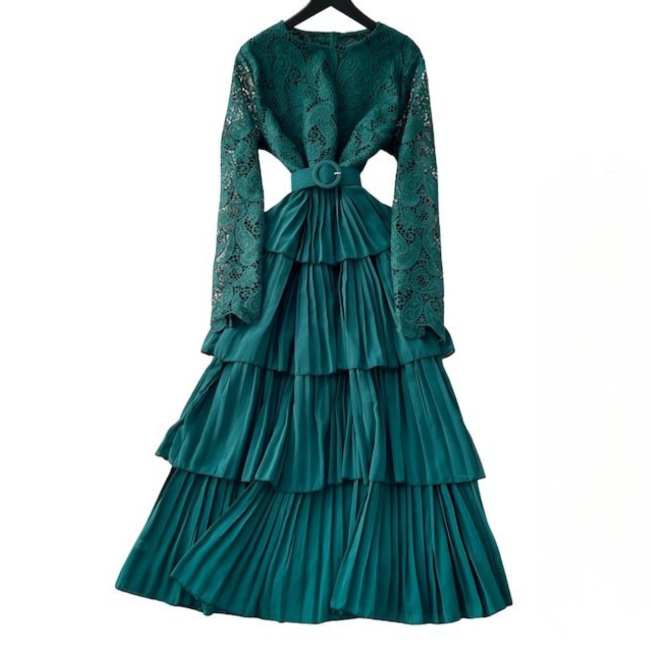 繊細なレーストップスと段差のあるプリーツスカートが印象的な、存在感のあるワンピースです。