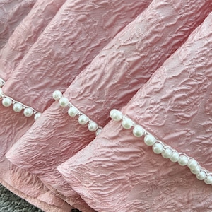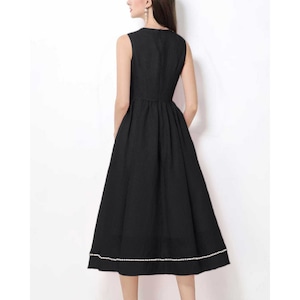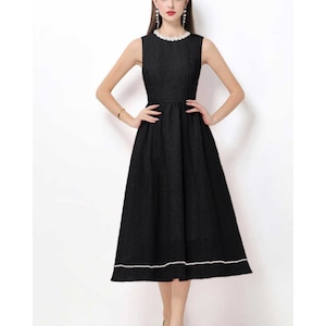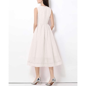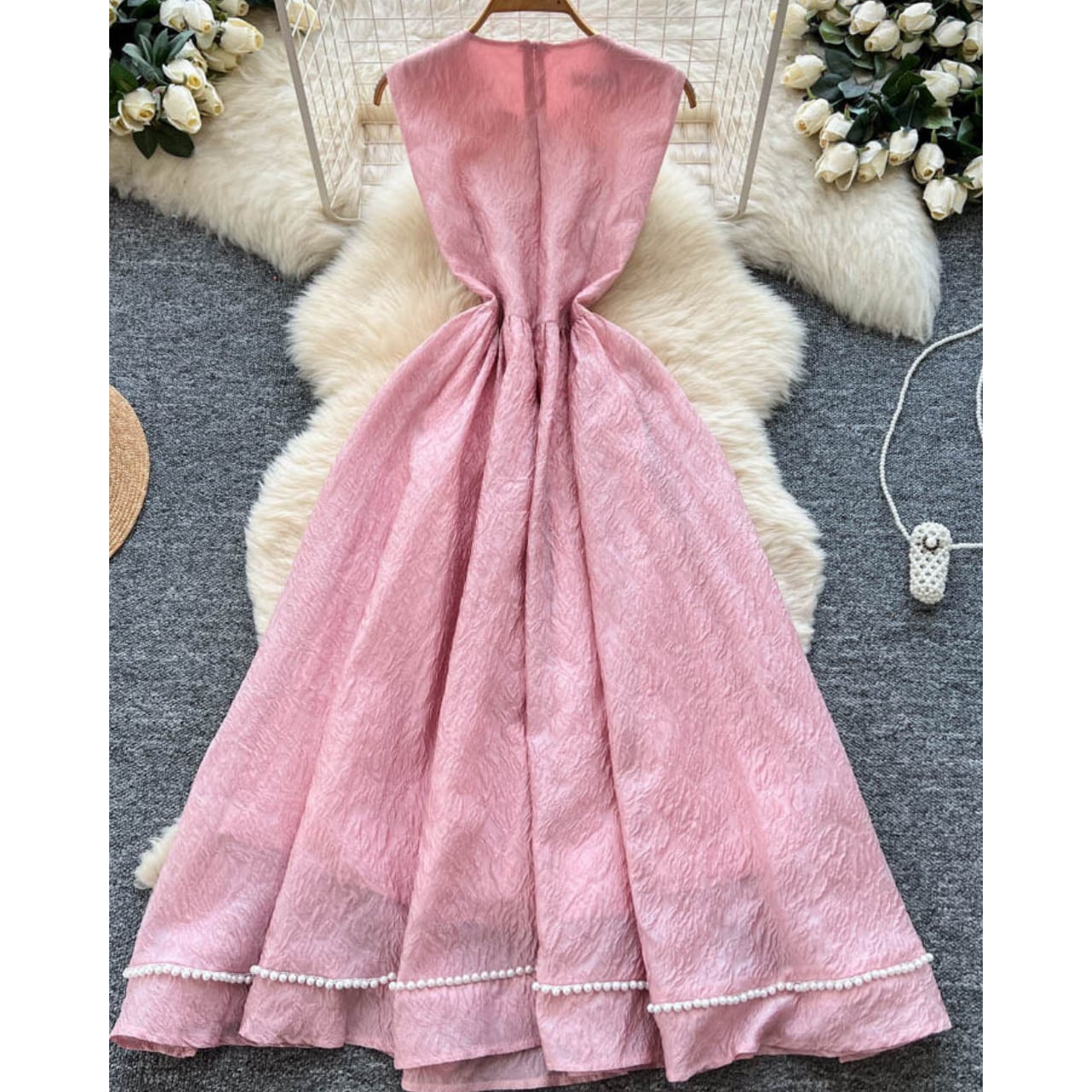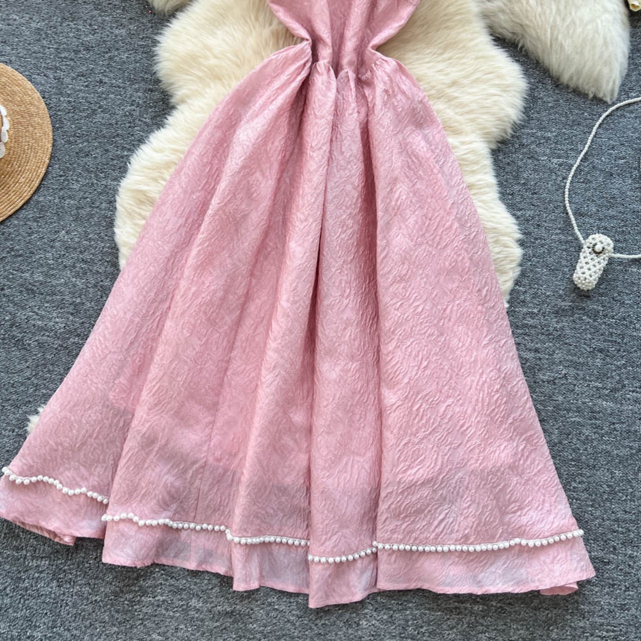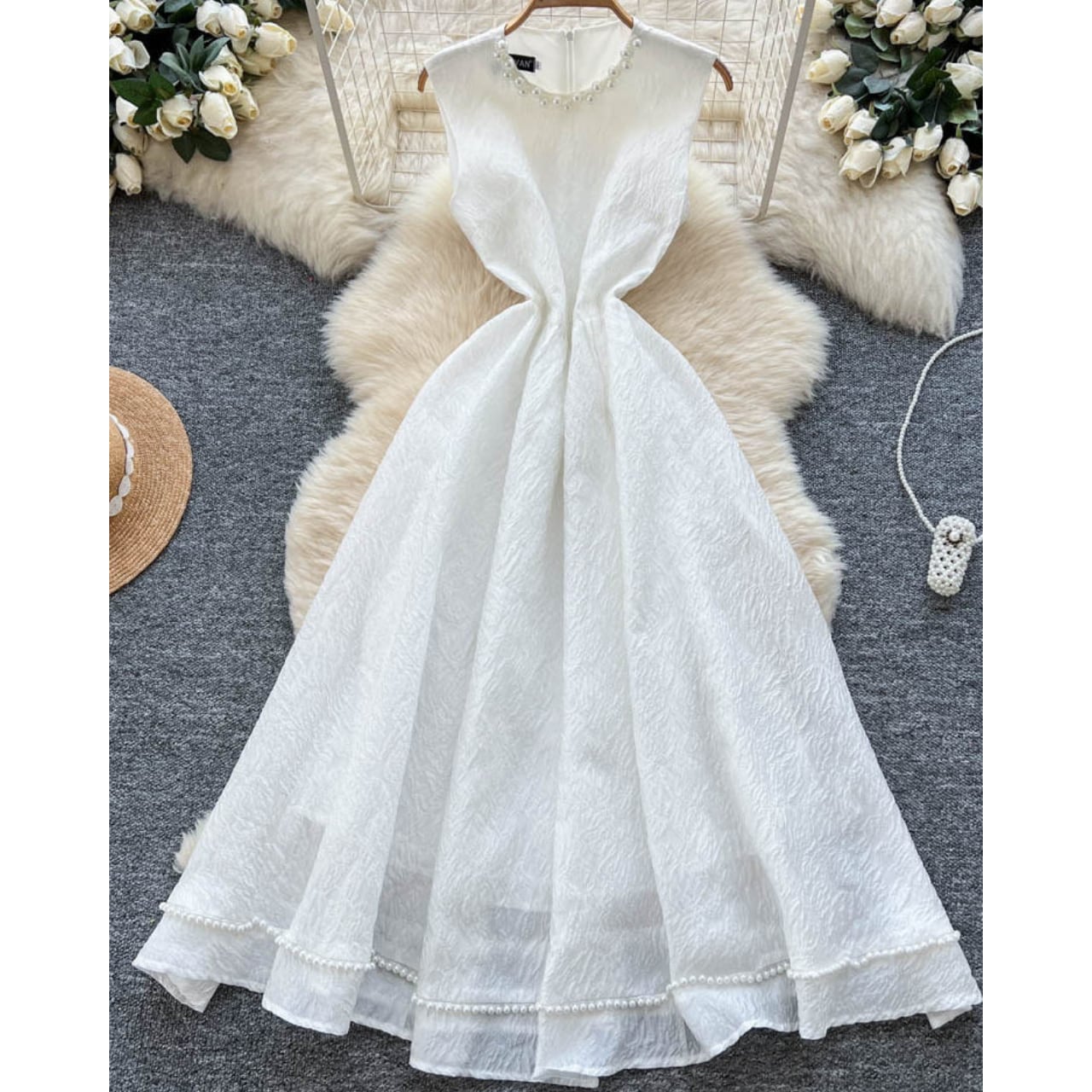 首元と裾にあしらわれた繊細なパールラインが、上品な華やかさを添えるフレアワンピースです。
