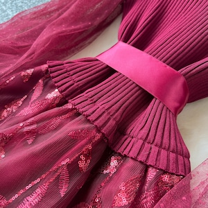 動くたびに華やぎが広がり、特別な日を上品に彩る主役級の一着です。