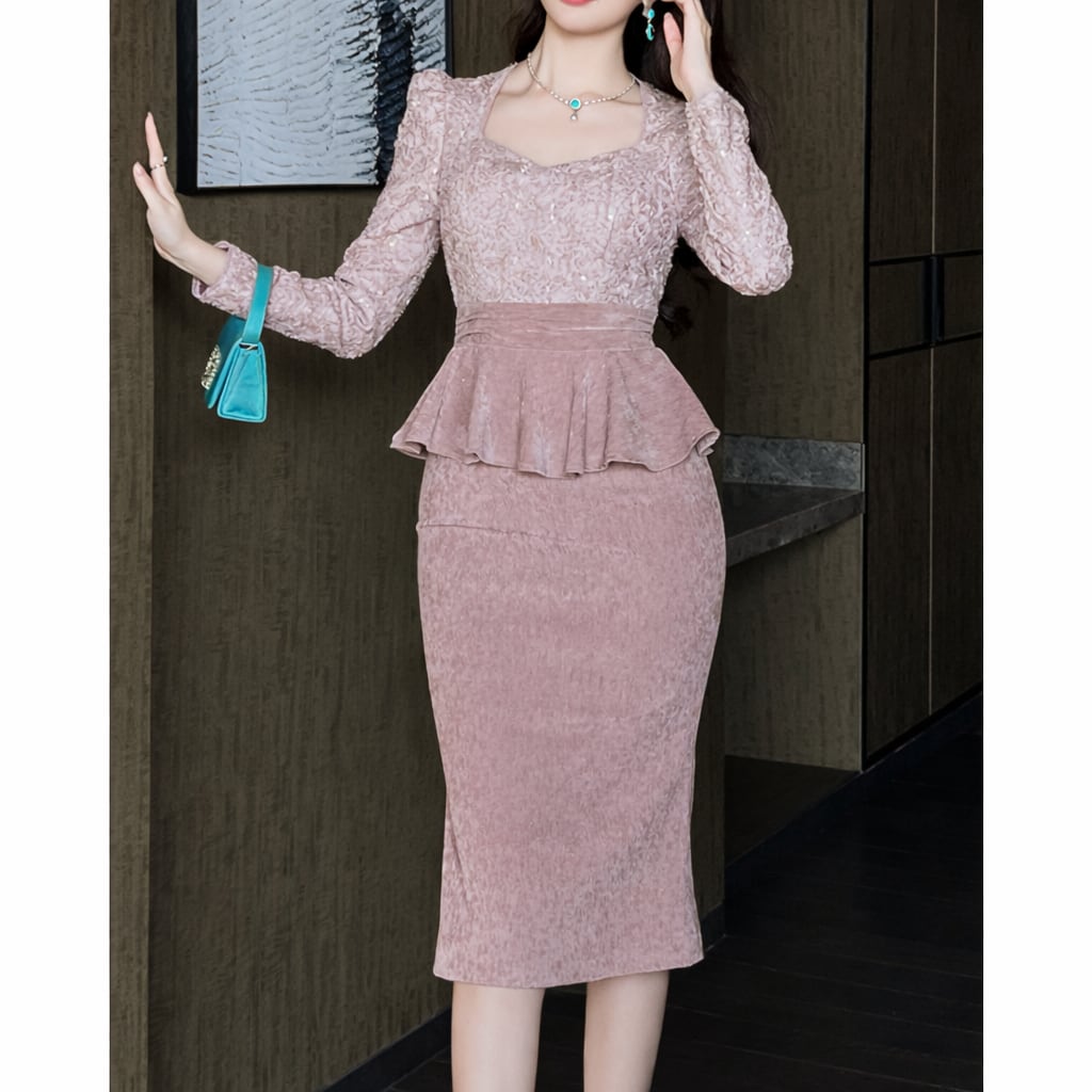 上身頃からスカートへと流れるシルエットが、女性らしい曲線を自然に演出し華やかな存在感を放ちます。