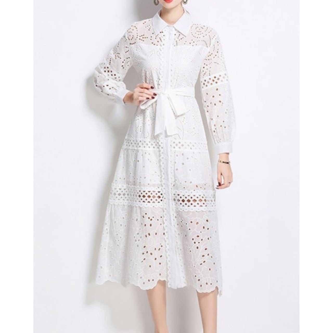 繊細なカッティングデザインが全体に施され、清潔感と華やかさを併せ持つエレガントなワンピースです。