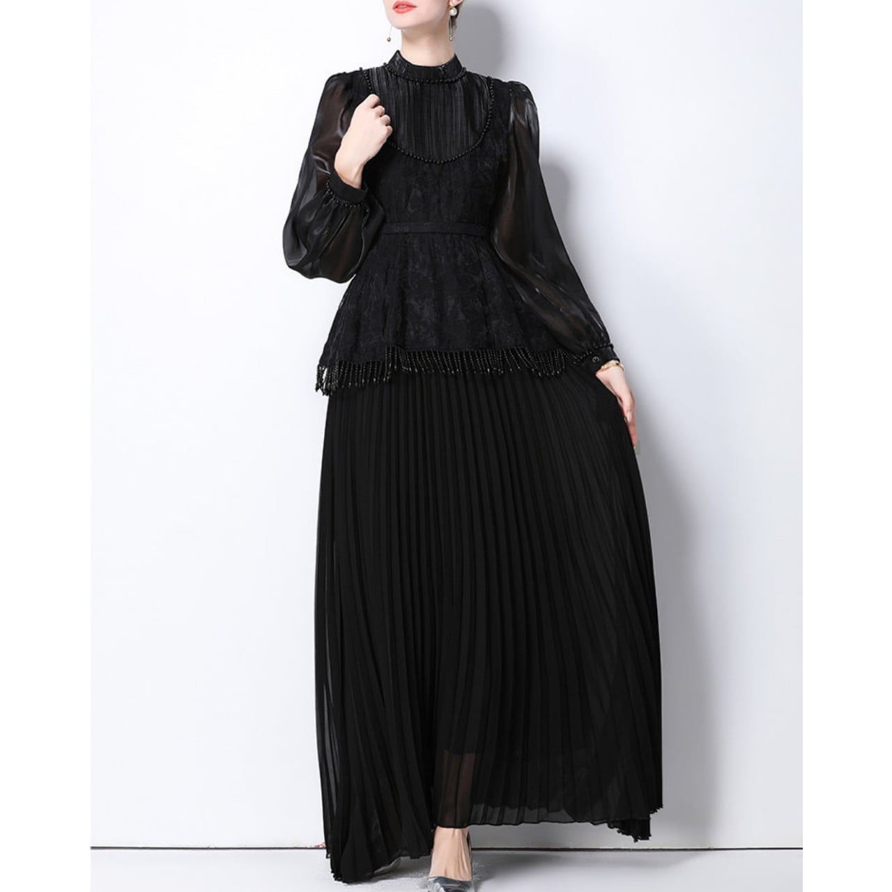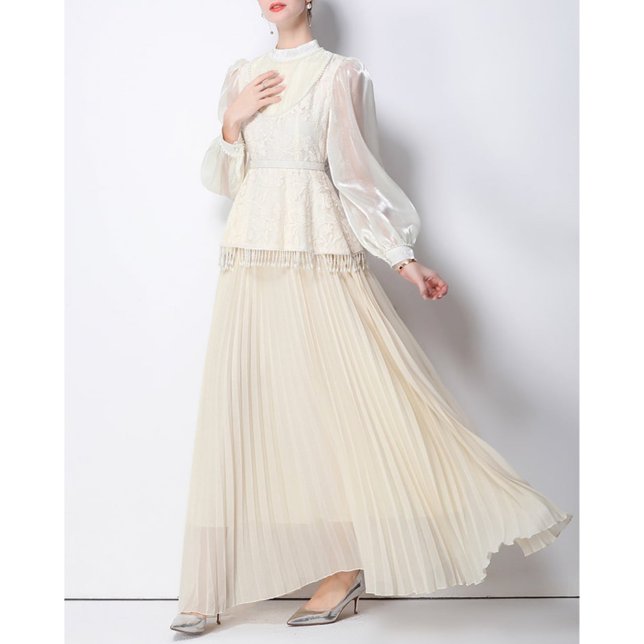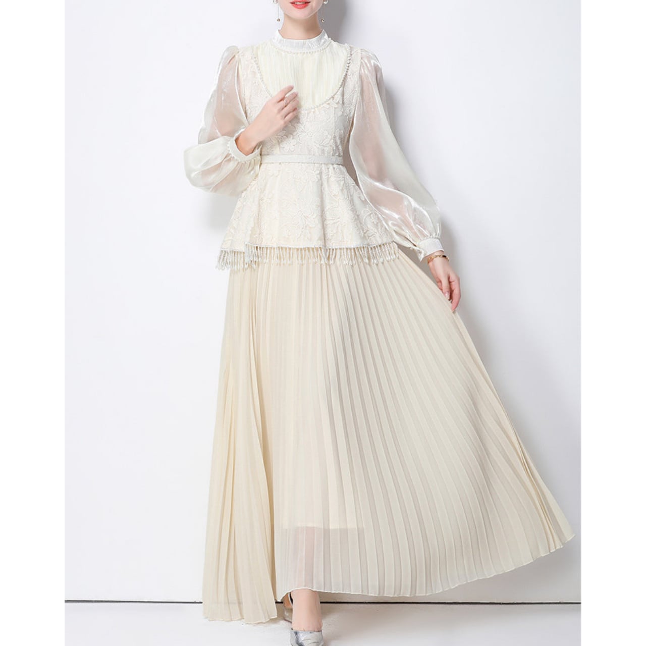 ボリュームのあるシアースリーブと美しく落ちるプリーツラインが、動くたびに優雅な表情を演出します。