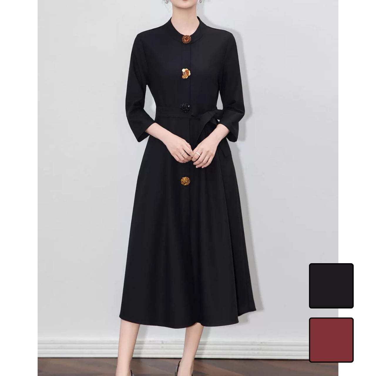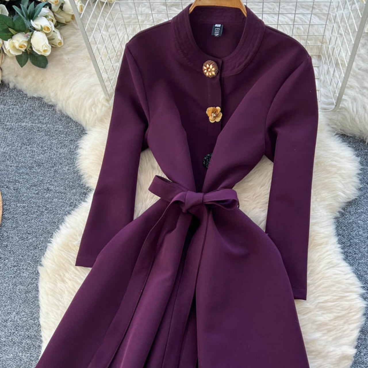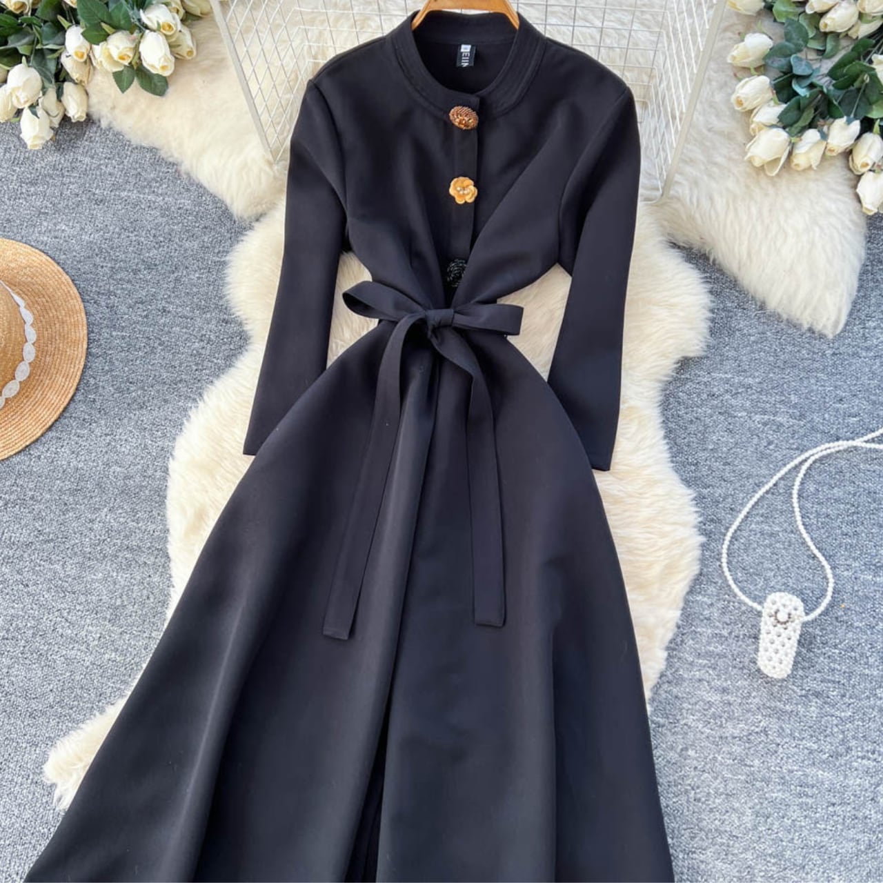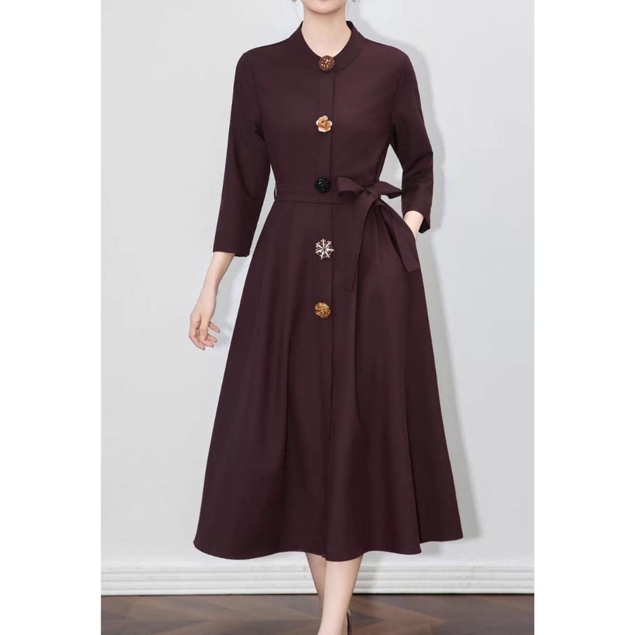 縦ラインを強調する装飾ボタンが、すらりとした美しいシルエットを演出するエレガントな一着です。