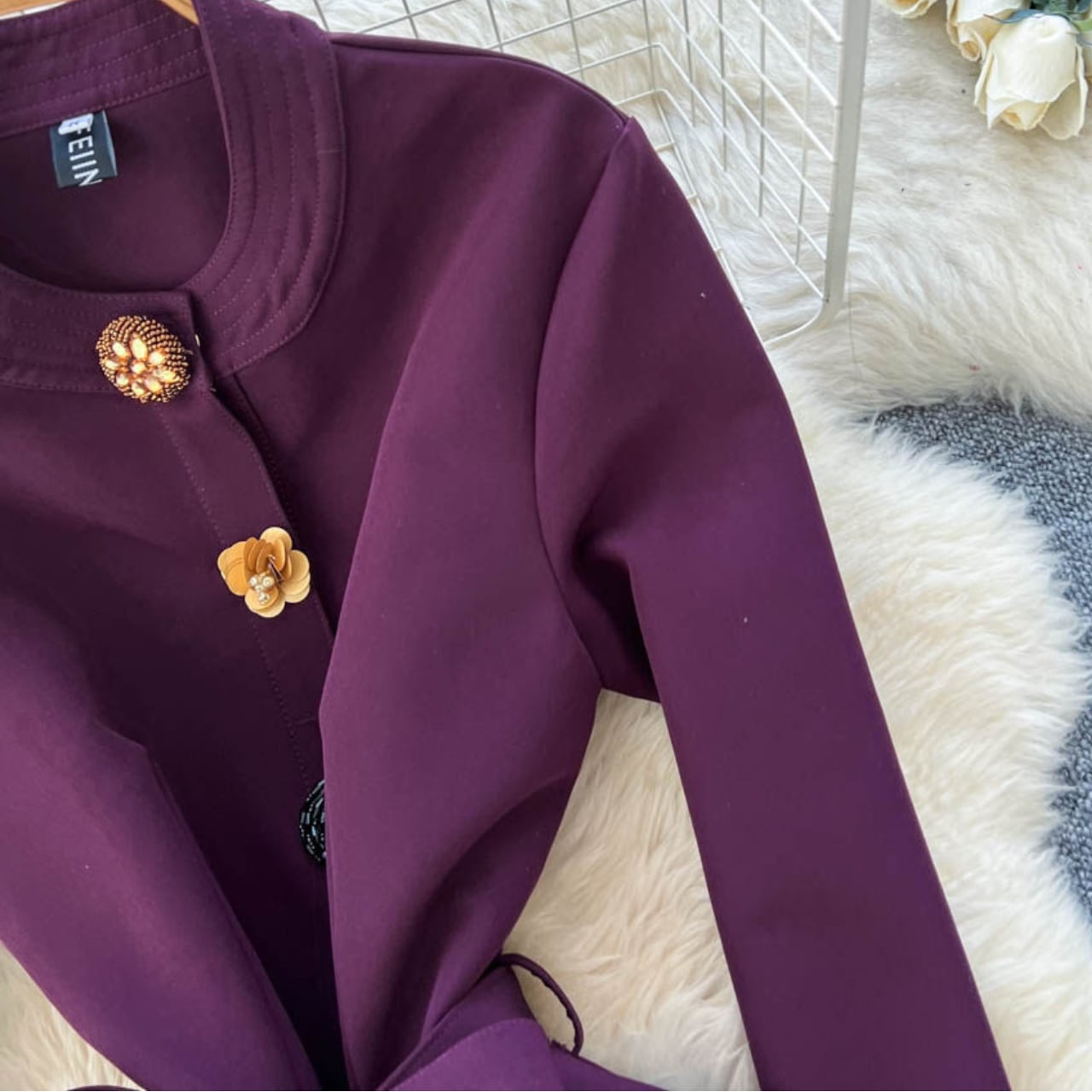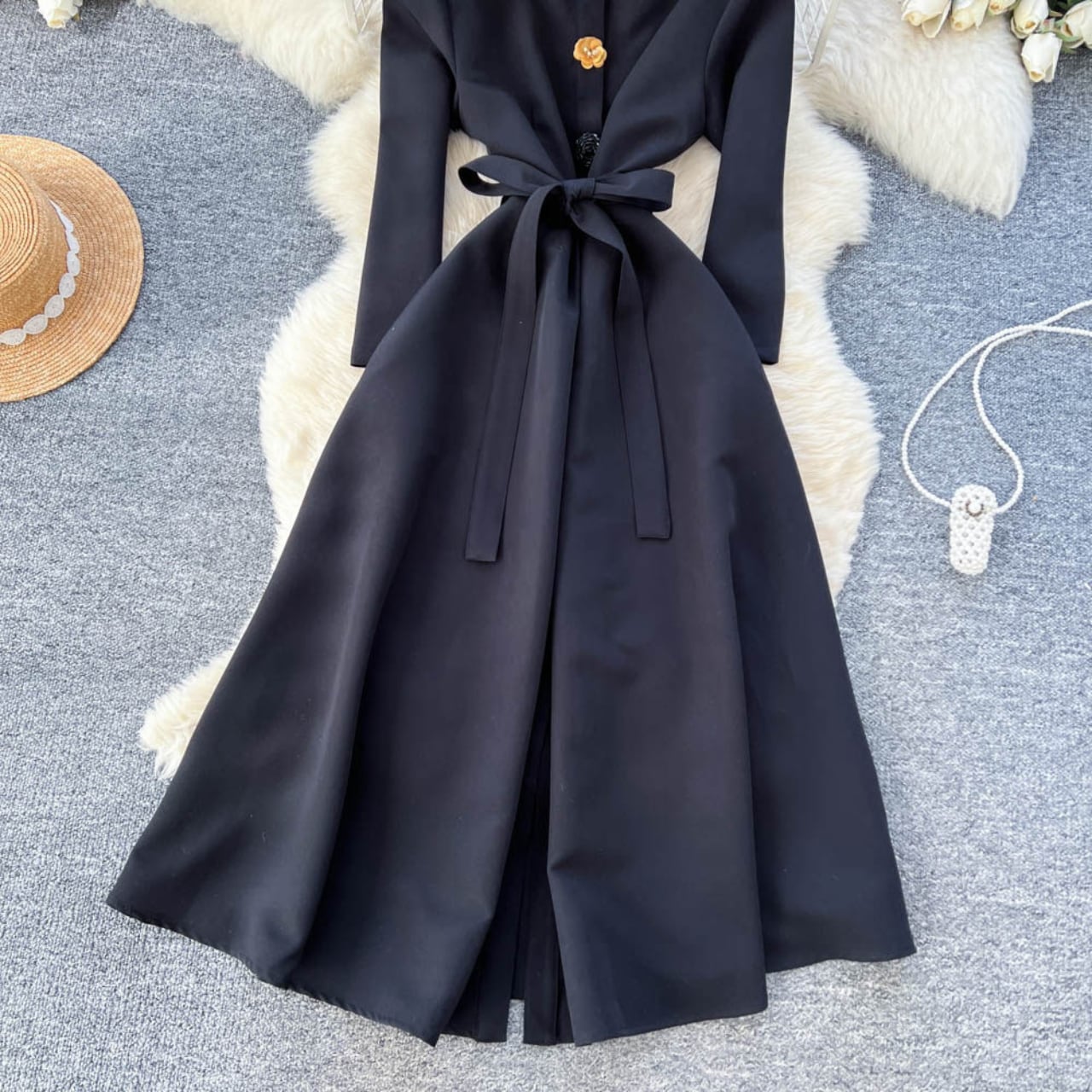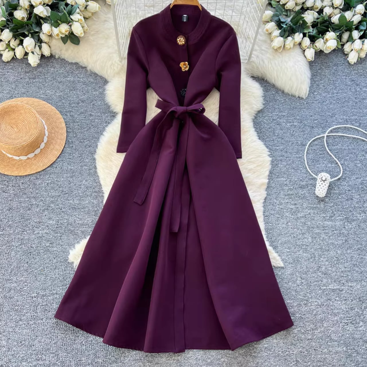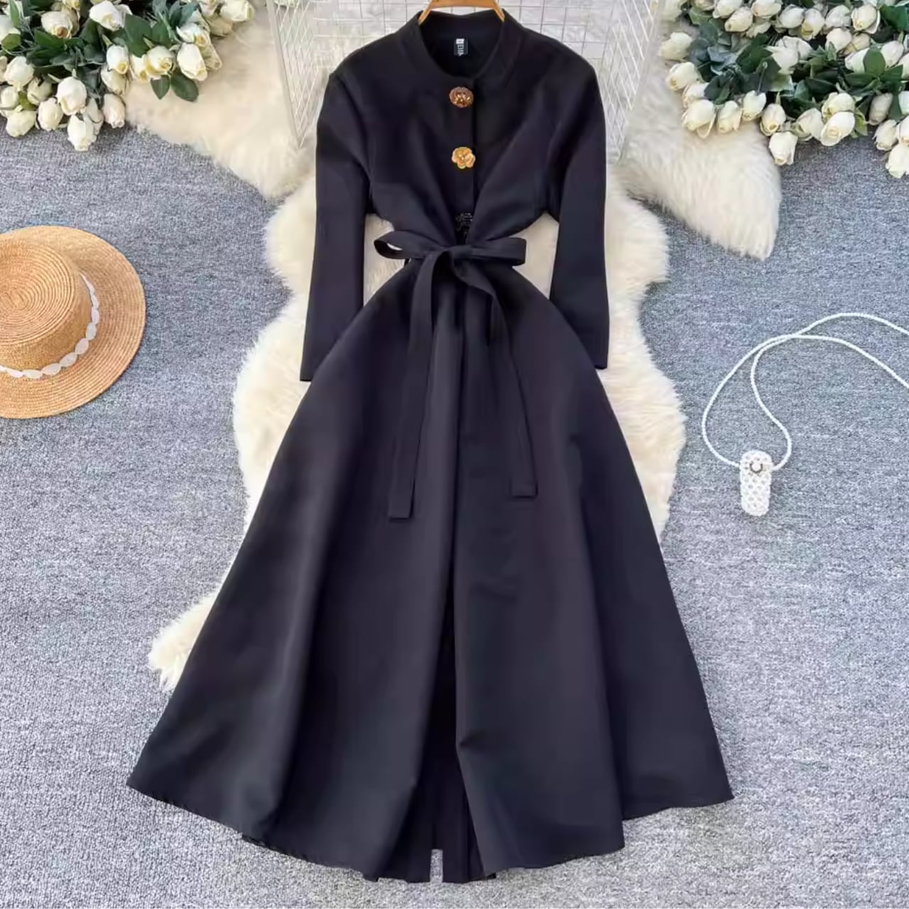 縦ラインを強調する装飾ボタンが、すらりとした美しいシルエットを演出するエレガントな一着です。