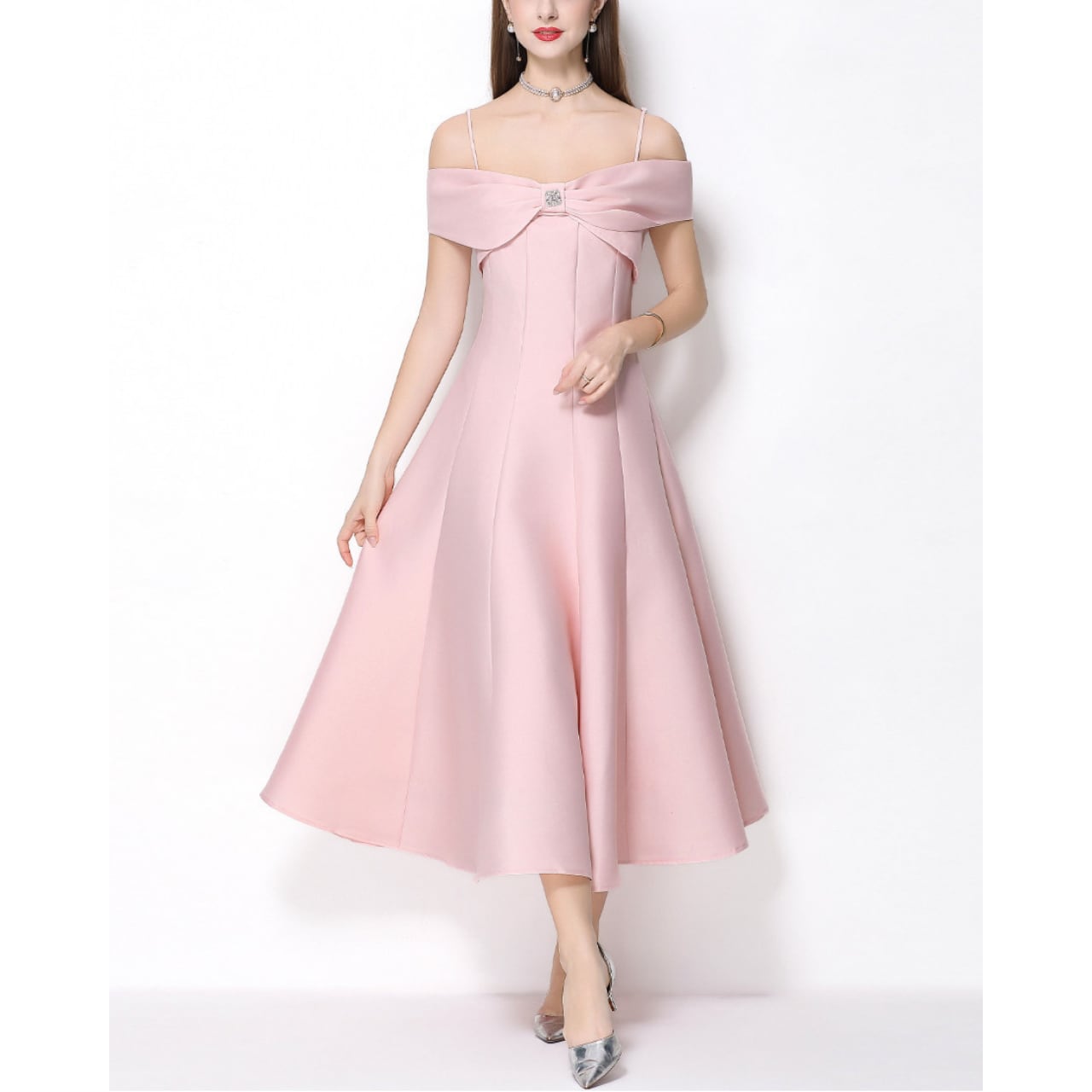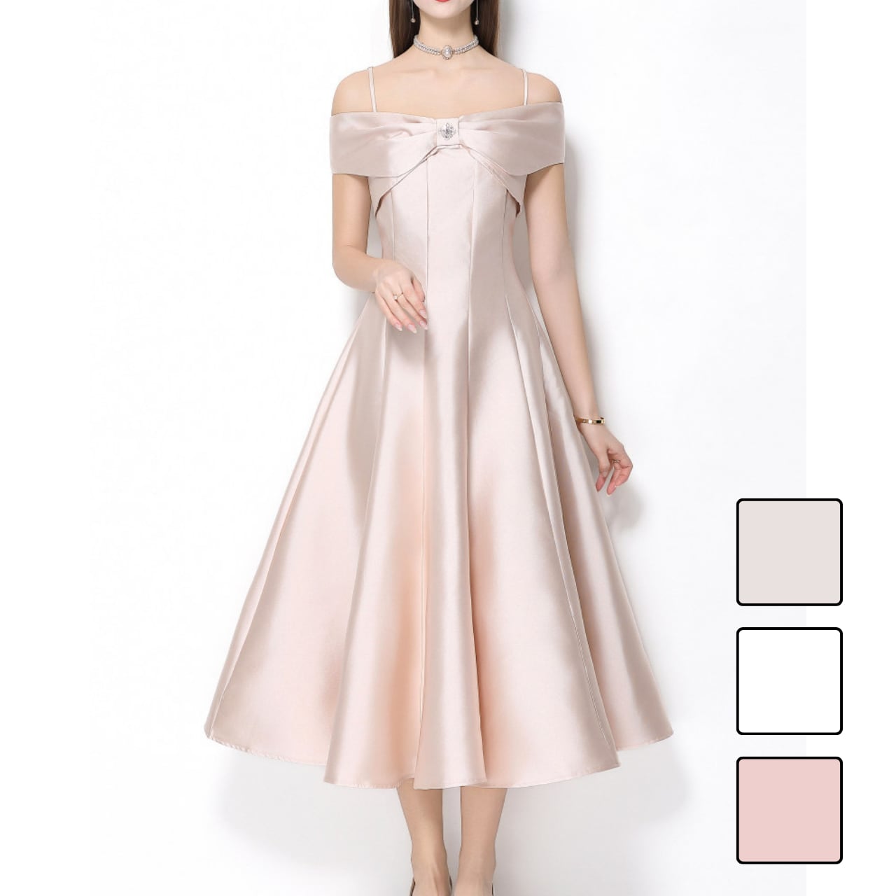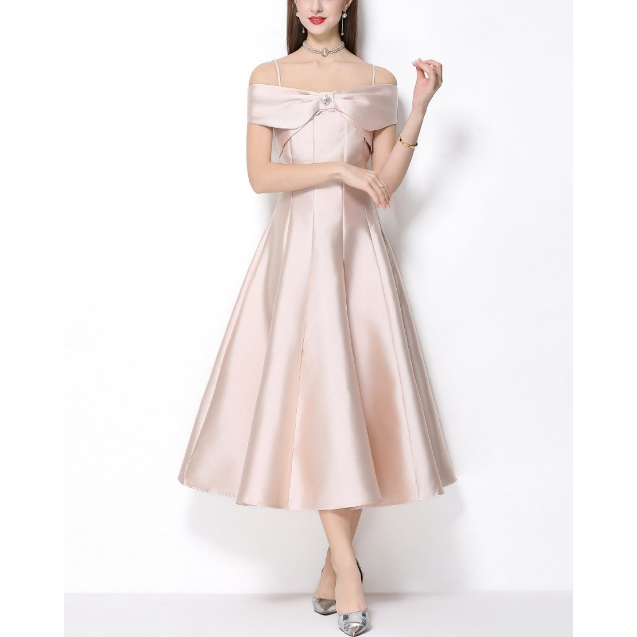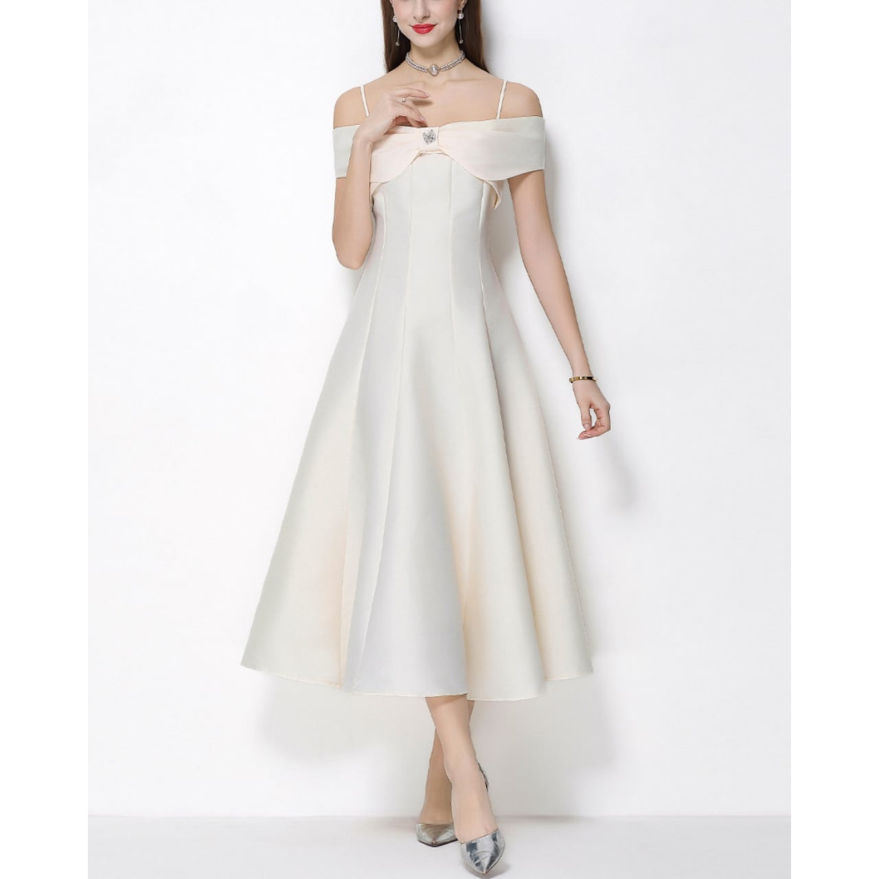 デコルテを美しく見せるオフショルデザインと、胸元のリボンモチーフが華やかな主役級ワンピースです。