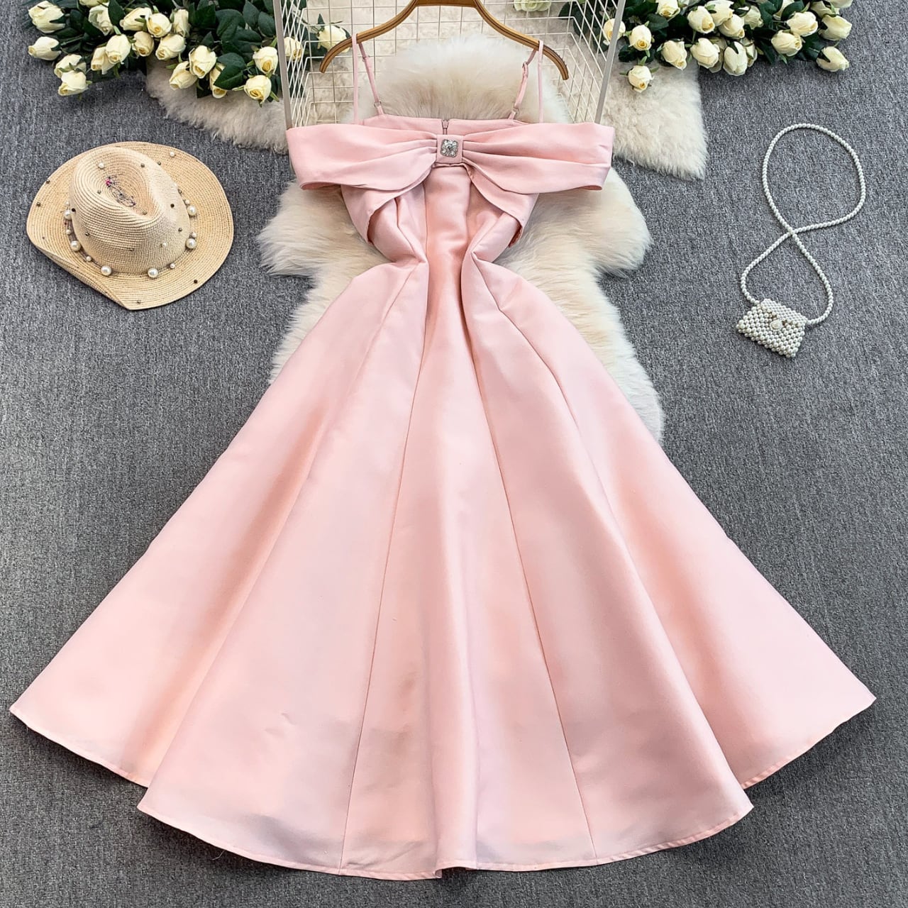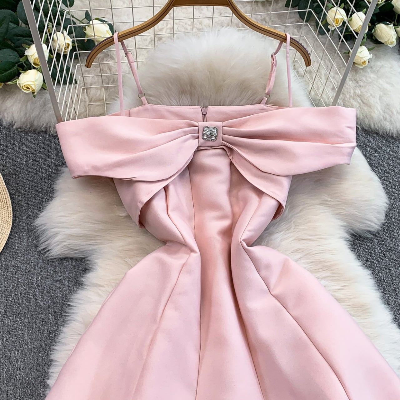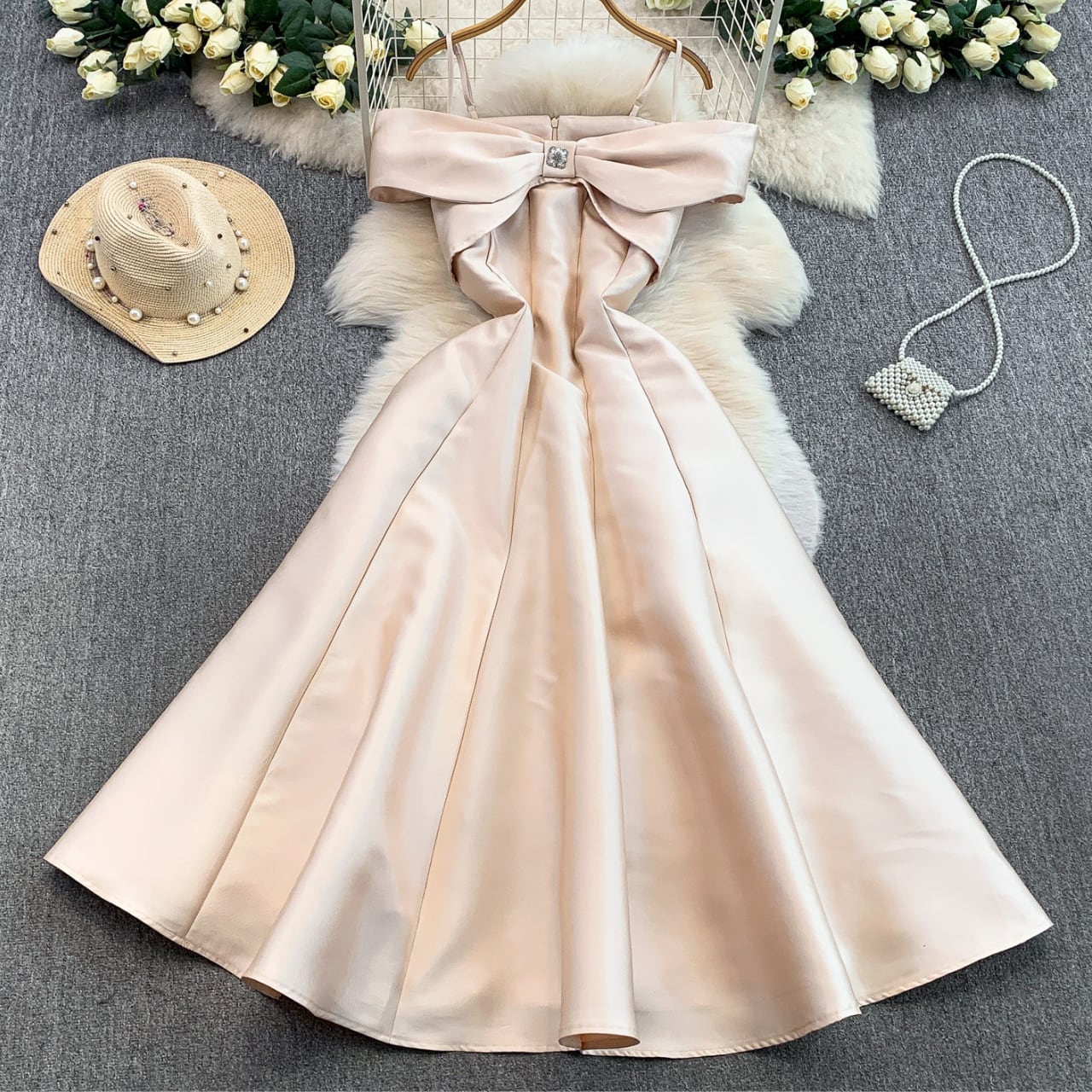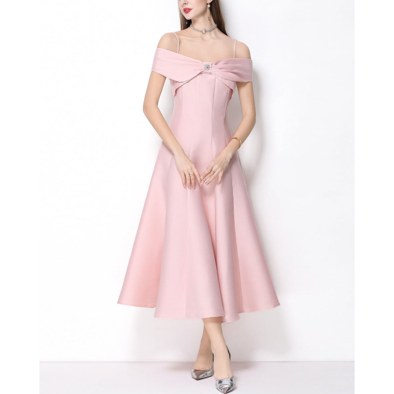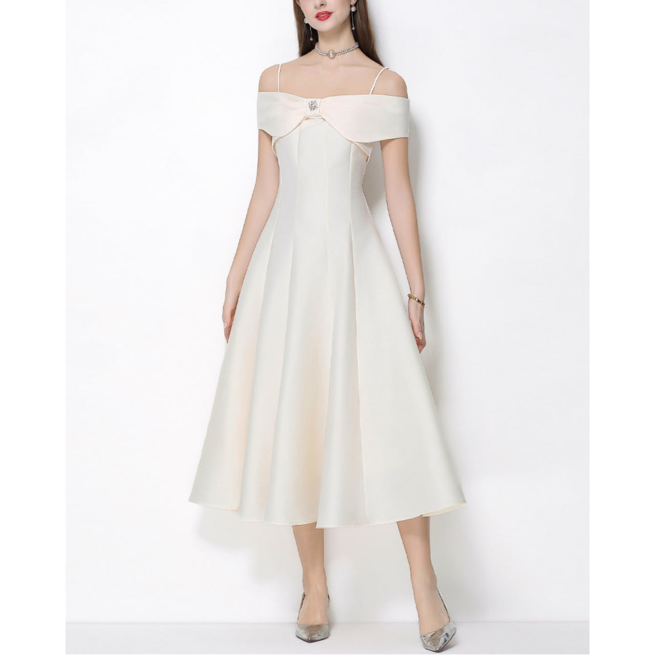 デコルテを美しく見せるオフショルデザインと、胸元のリボンモチーフが華やかな主役級ワンピースです。
