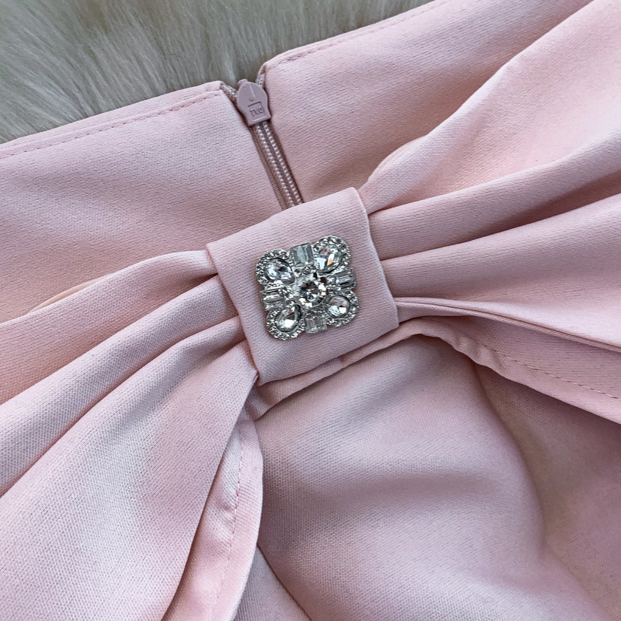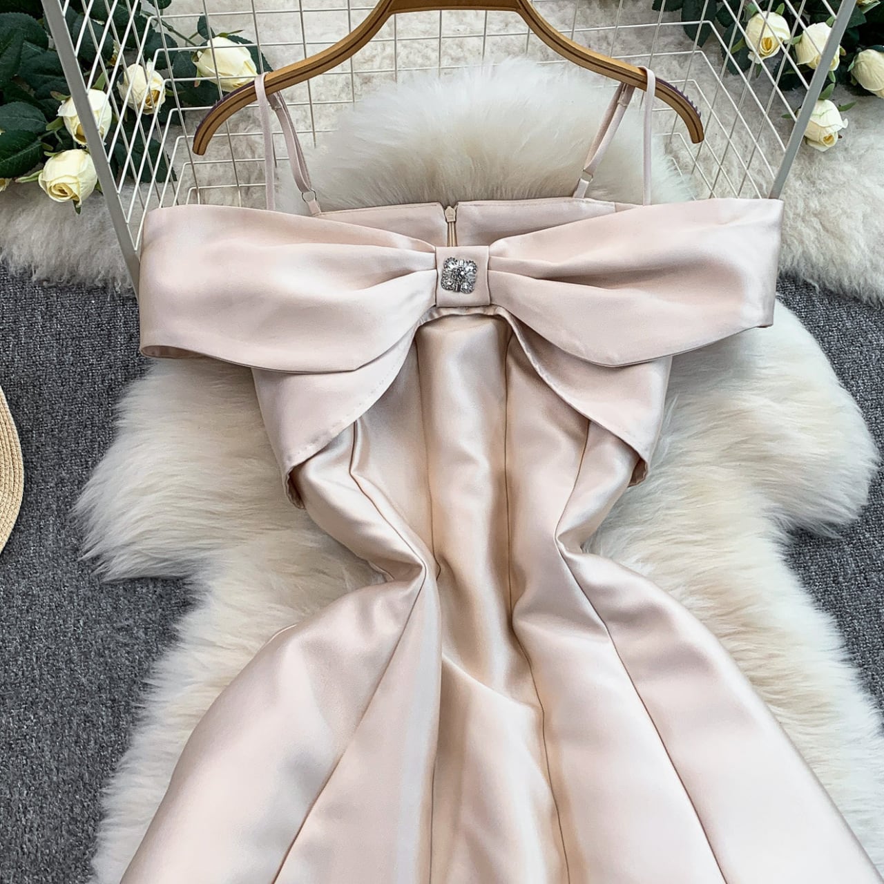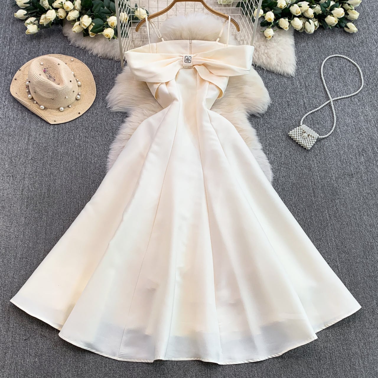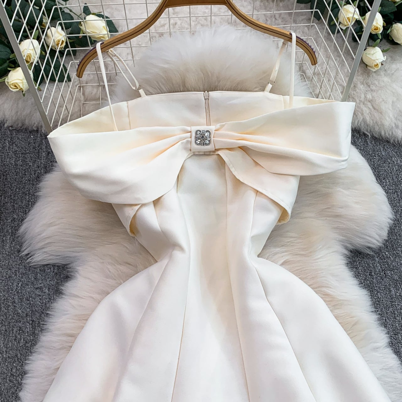 デコルテを美しく見せるオフショルデザインと、胸元のリボンモチーフが華やかな主役級ワンピースです。