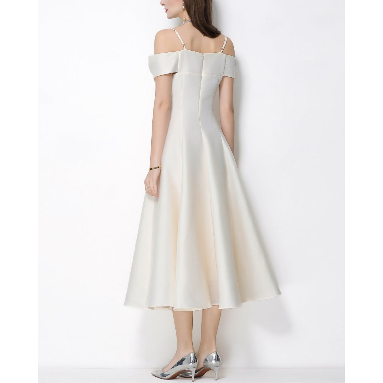 ウエストから広がるフレアシルエットが動くたびに優雅に揺れ、女性らしいラインを上品に引き立てます。