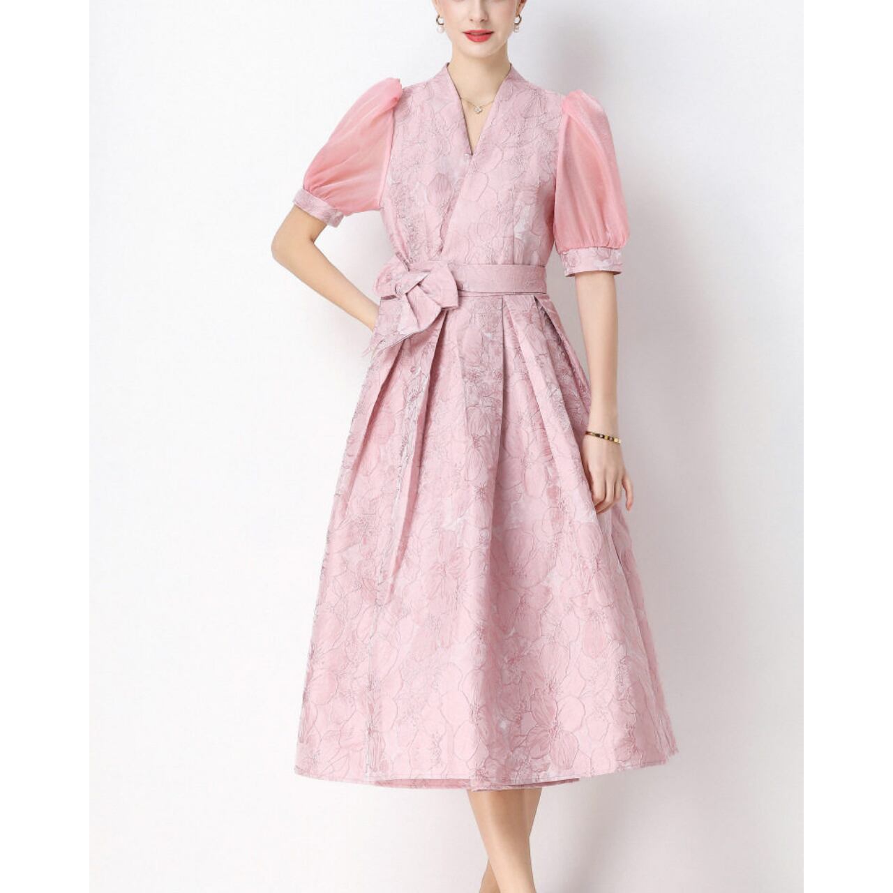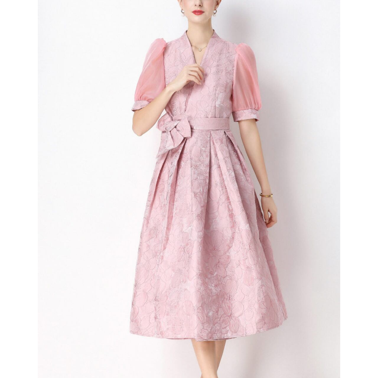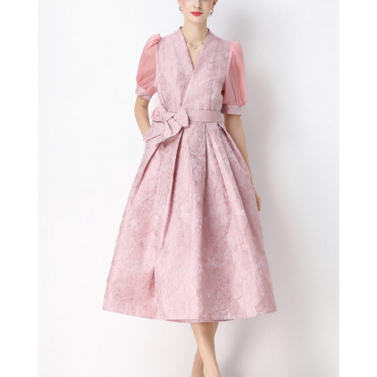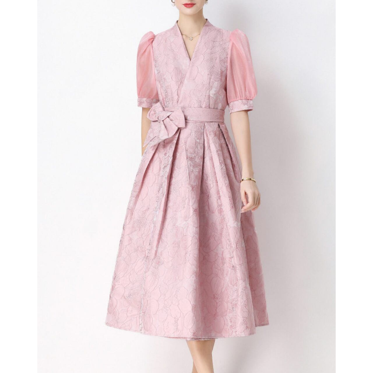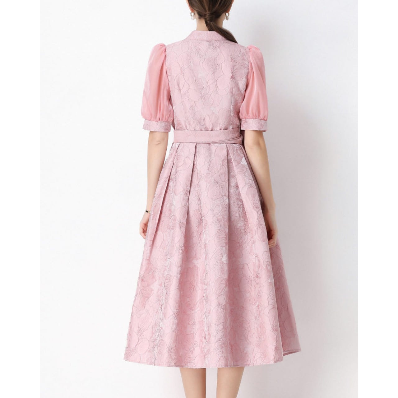 落ち着いた華やかさでフォーマルな場にも映え、大人の品格を引き立てるワンピースです。