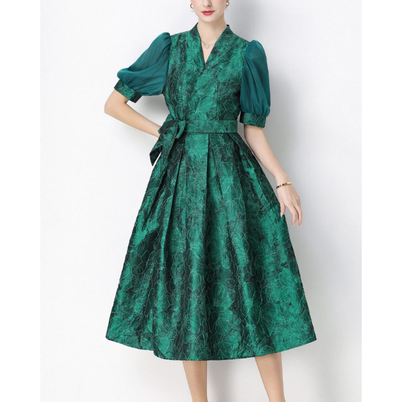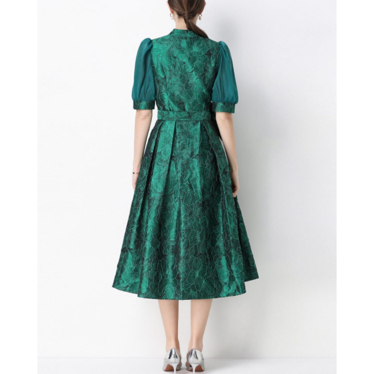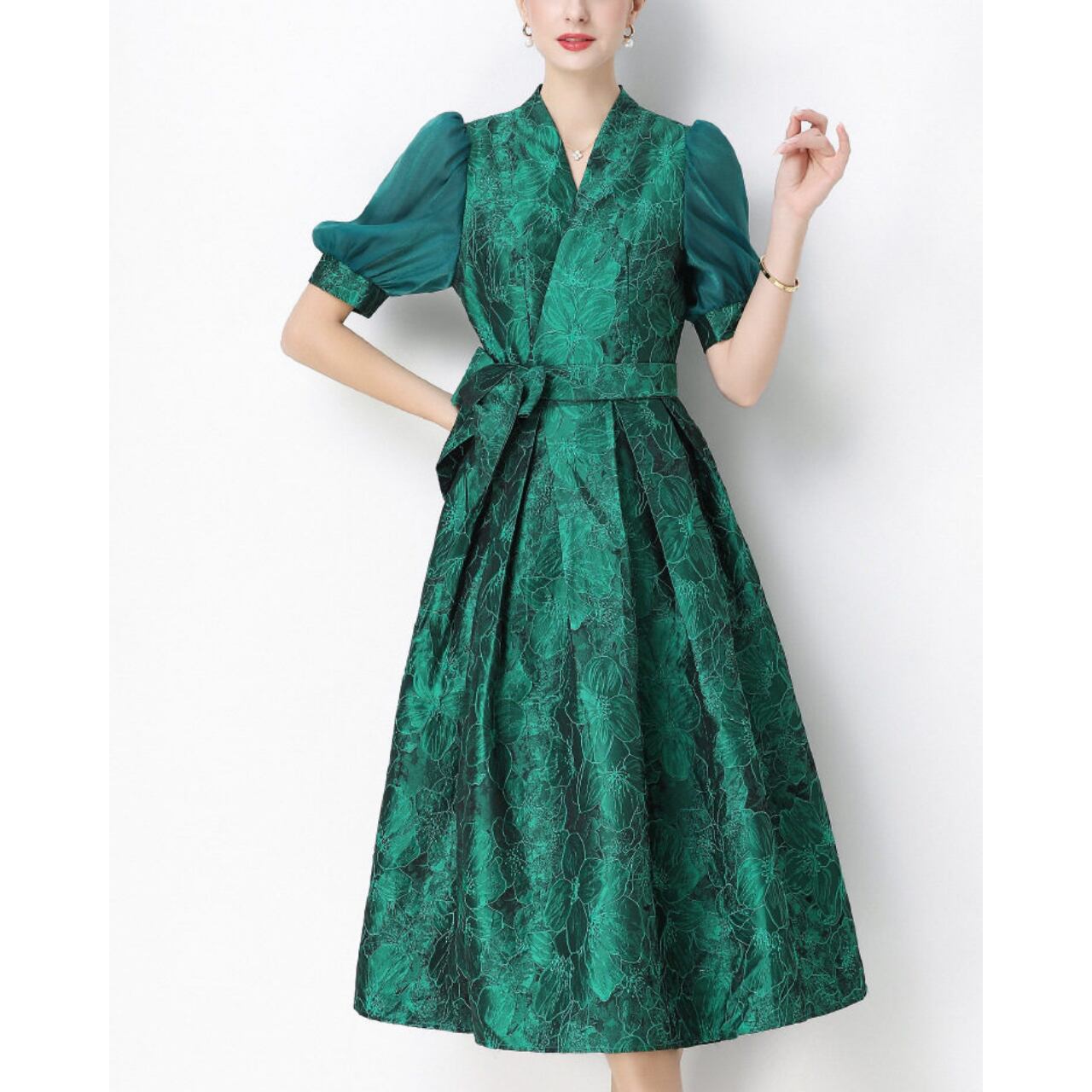 落ち着いた華やかさでフォーマルな場にも映え、大人の品格を引き立てるワンピースです。