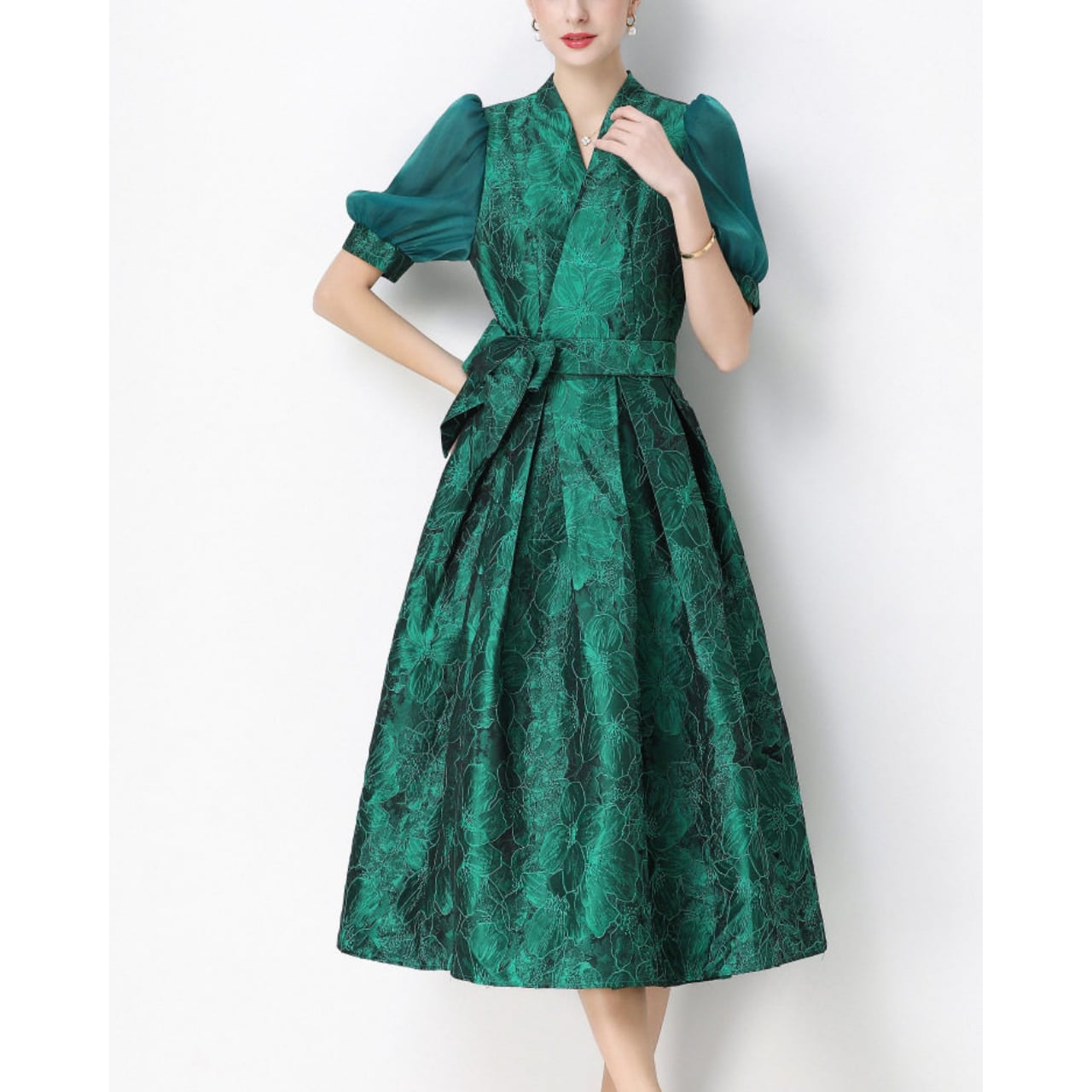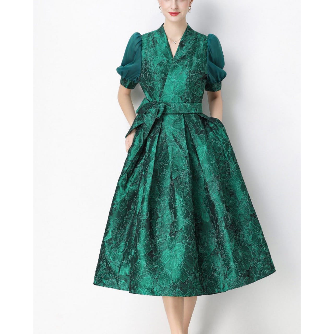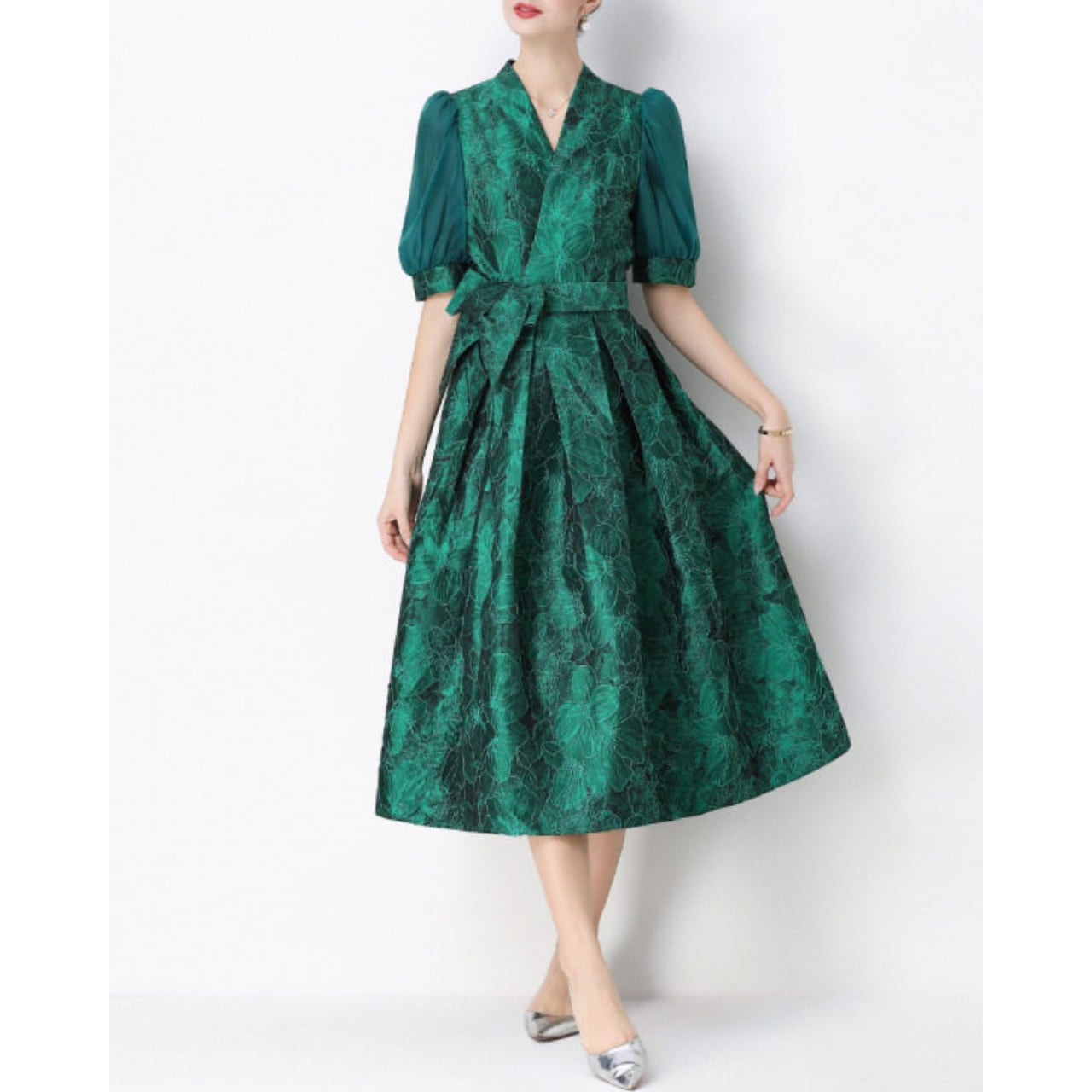 落ち着いた華やかさでフォーマルな場にも映え、大人の品格を引き立てるワンピースです。