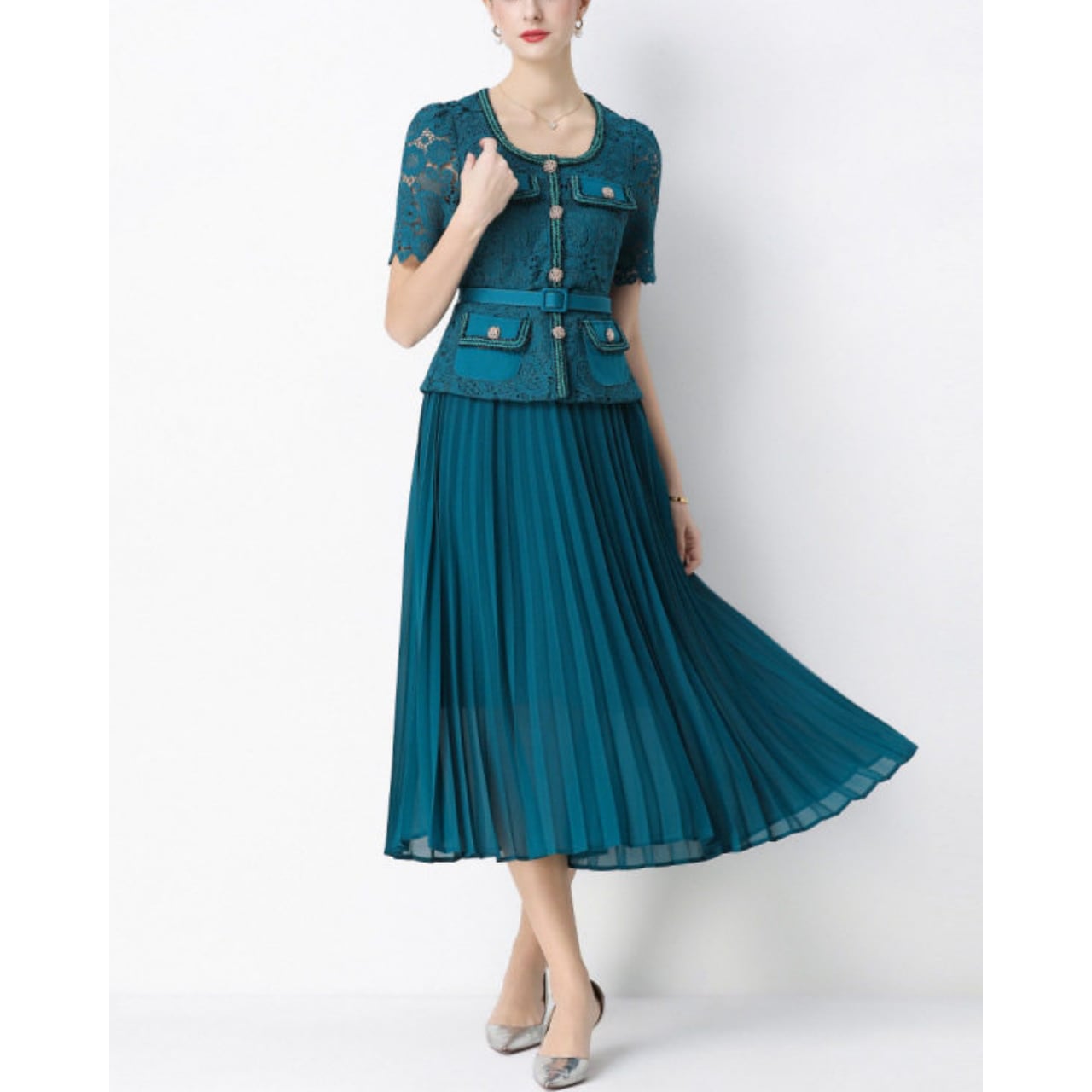 ウエストラインを美しく見せるシルエットと、揺れ感のあるプリーツが動くたびに優雅な印象を与えます。