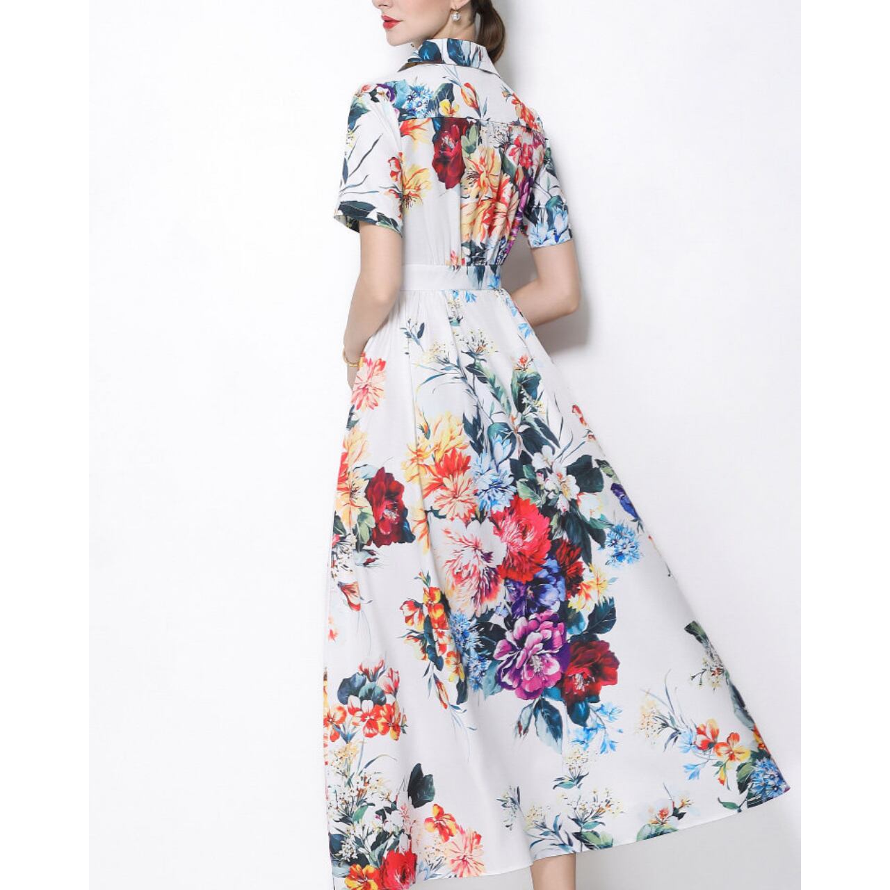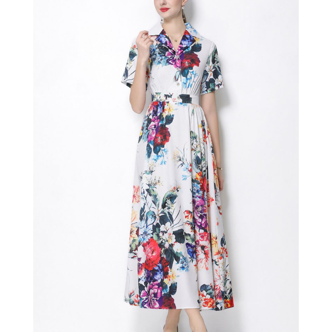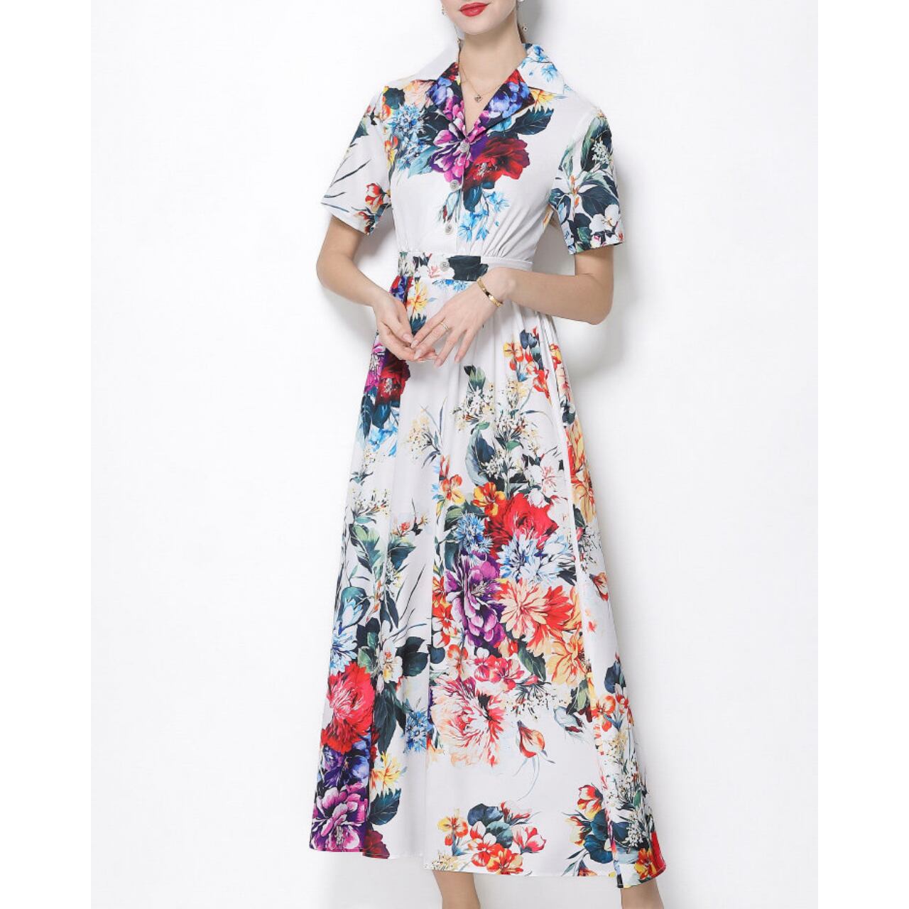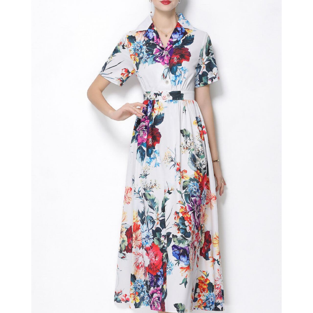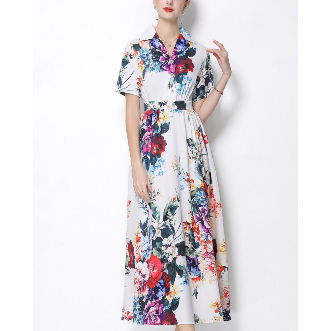 華やかなフラワーデザインとシャツ襟のきちんと感が、大人の上品さを引き立てるワンピースです。