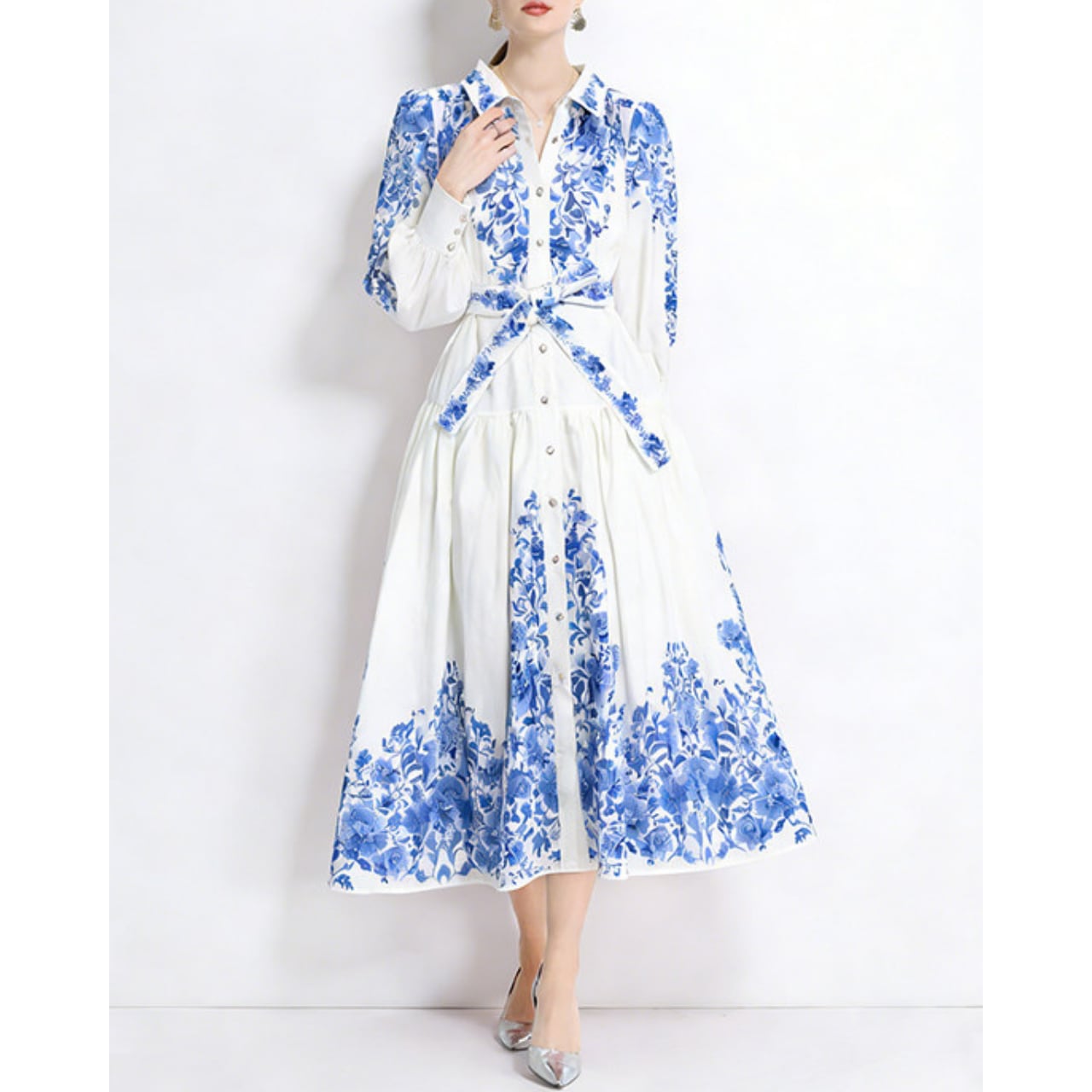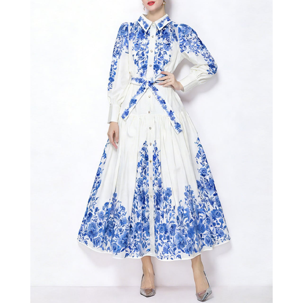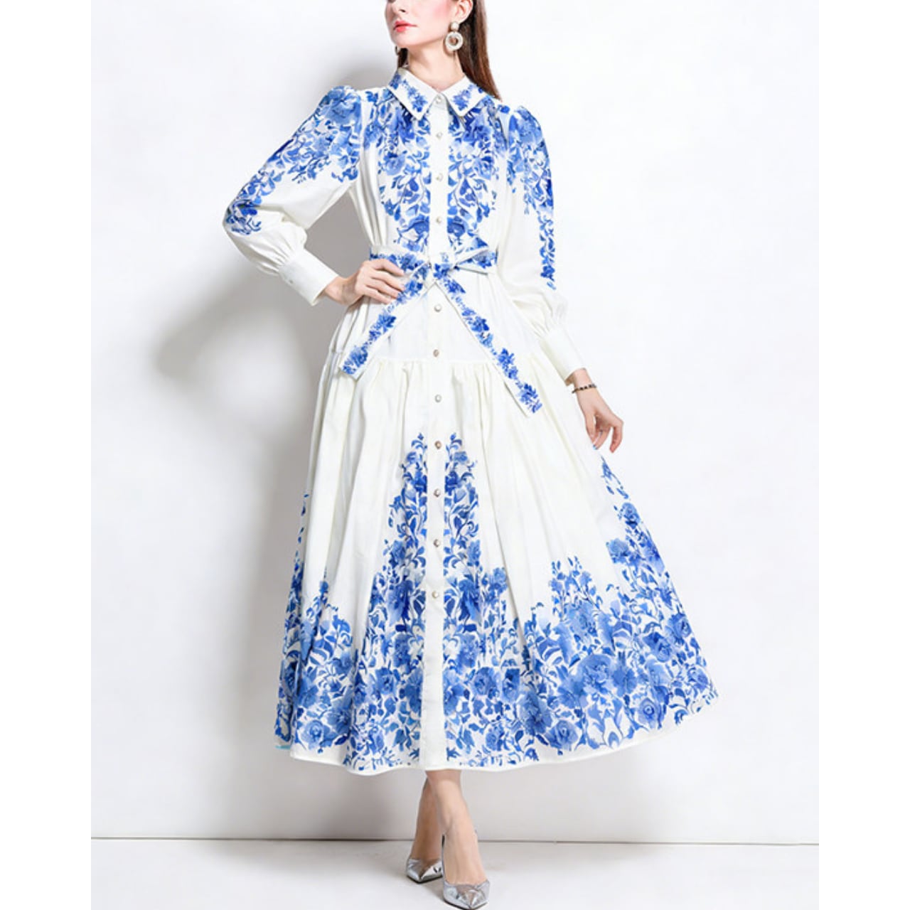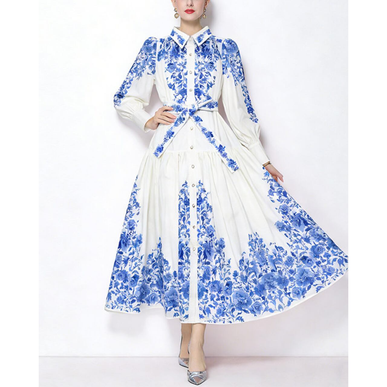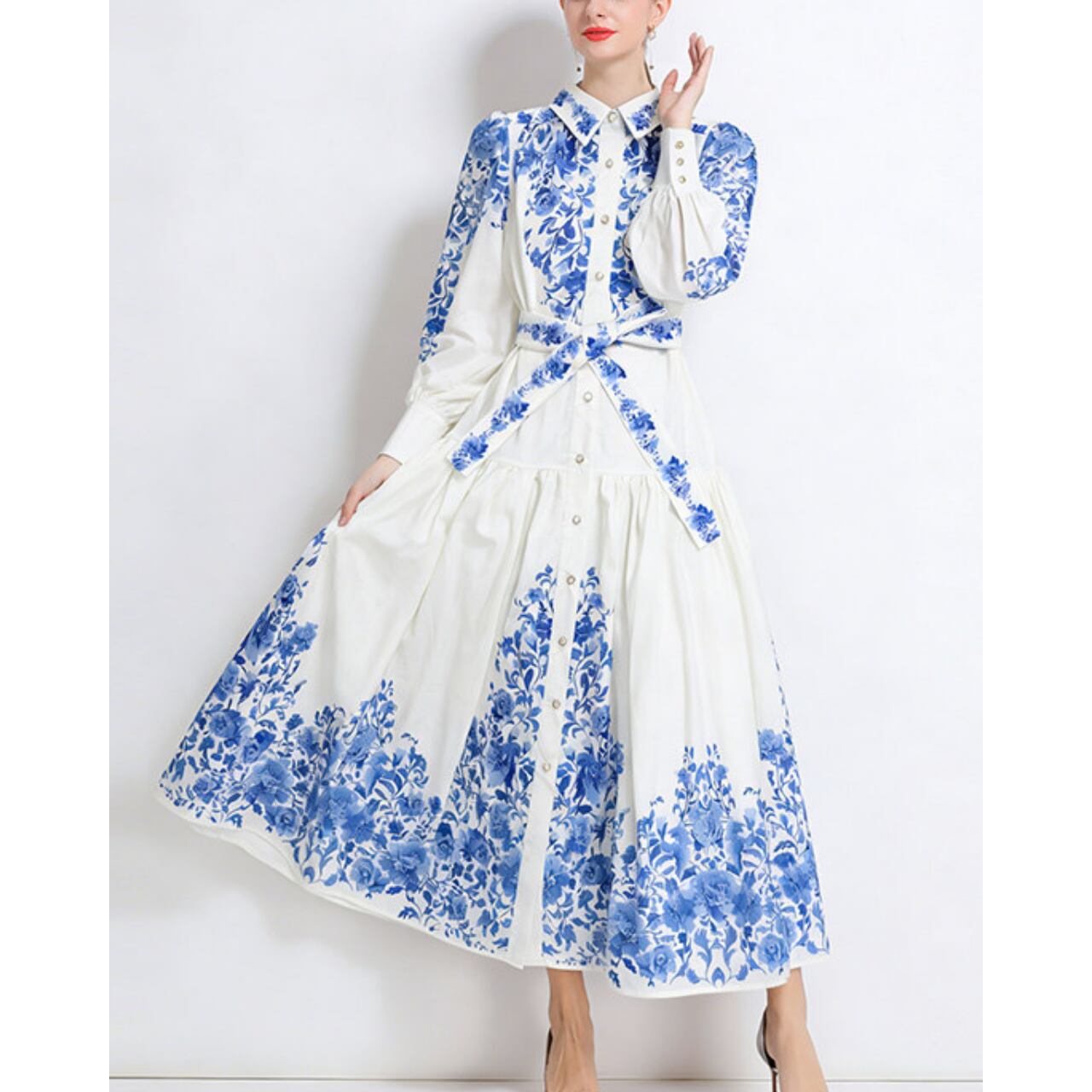 気品あふれるブルーフラワーとクラシカルな配色が、洗練された華やかさを演出するワンピースです。