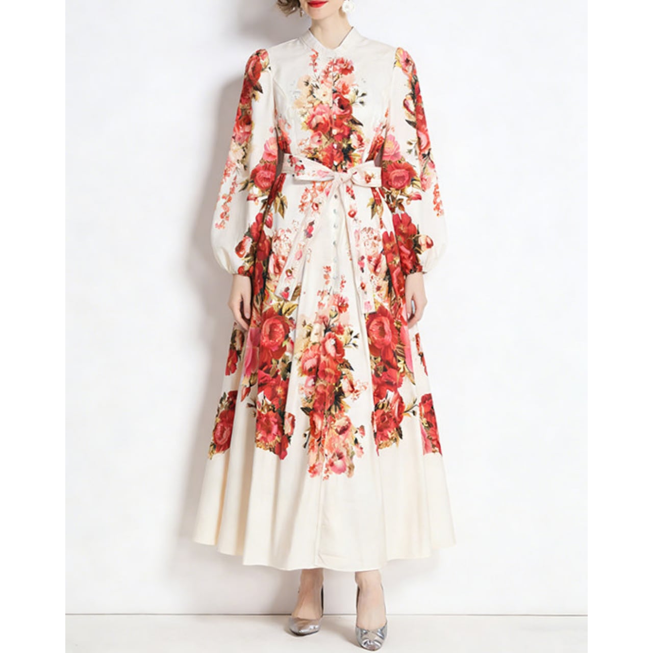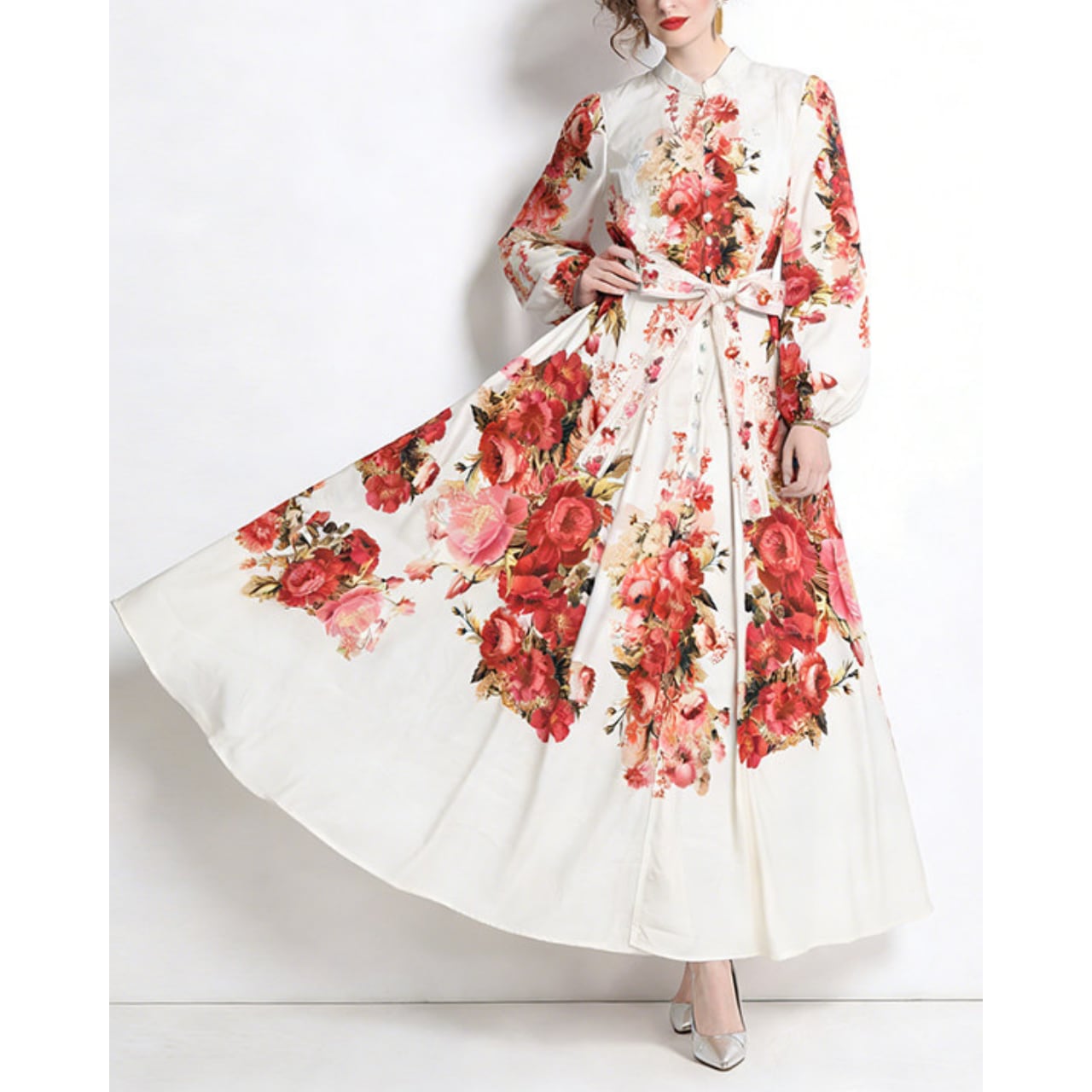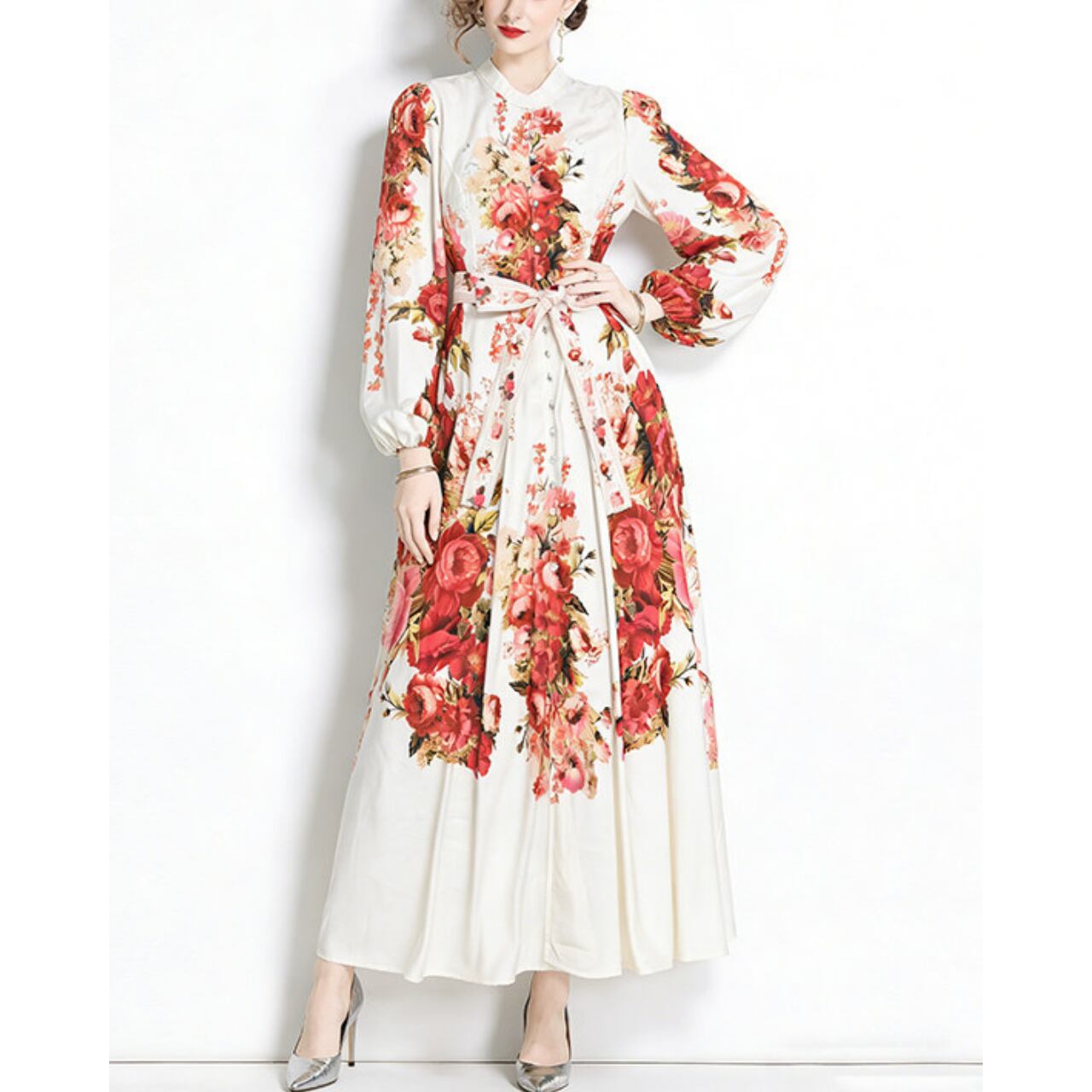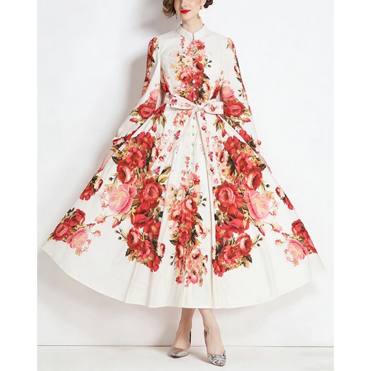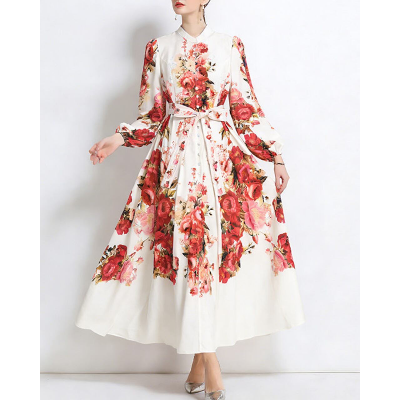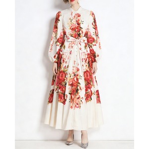 華やかなフラワーデザインと上品なスタンドカラーが、気品あふれる印象を演出するワンピースです。
