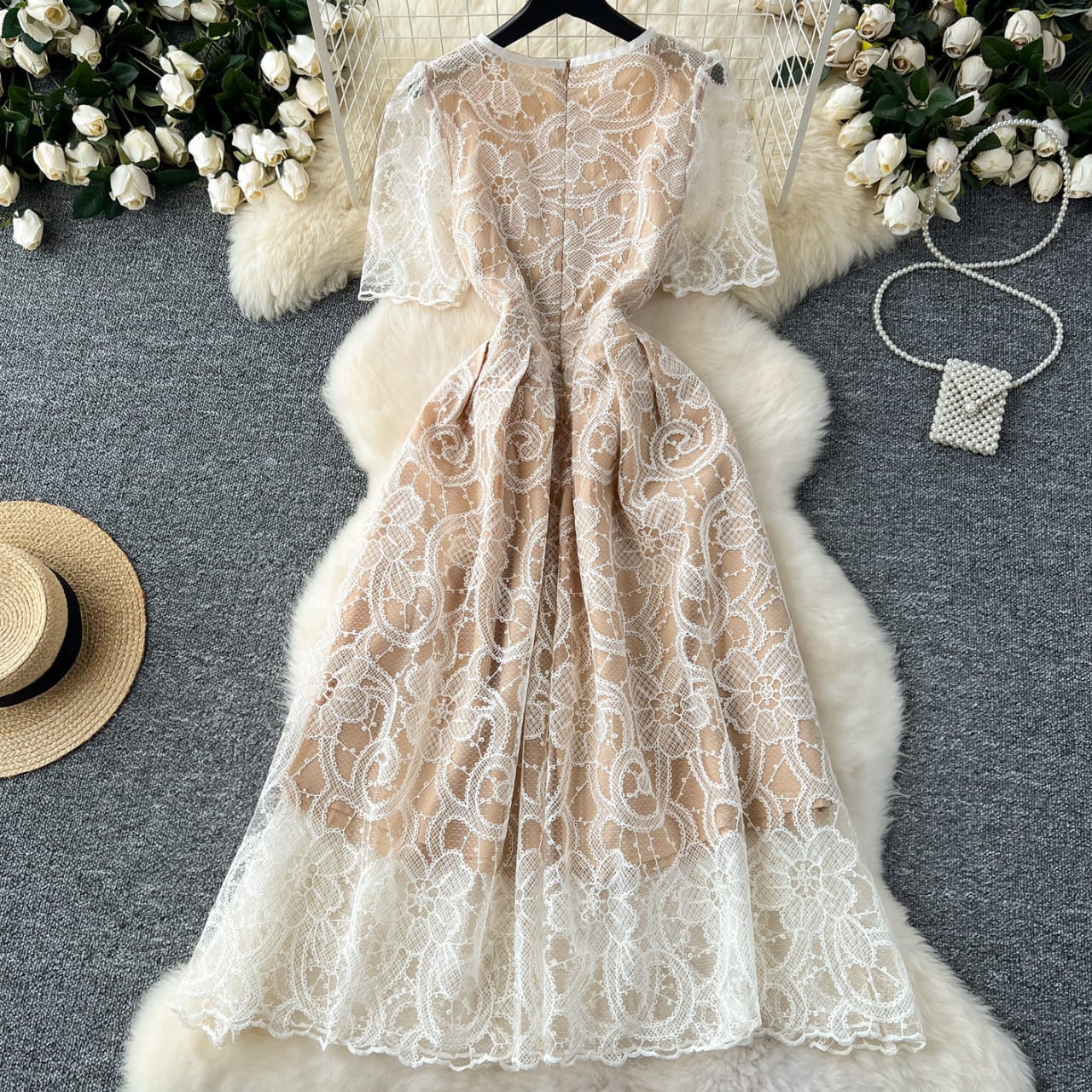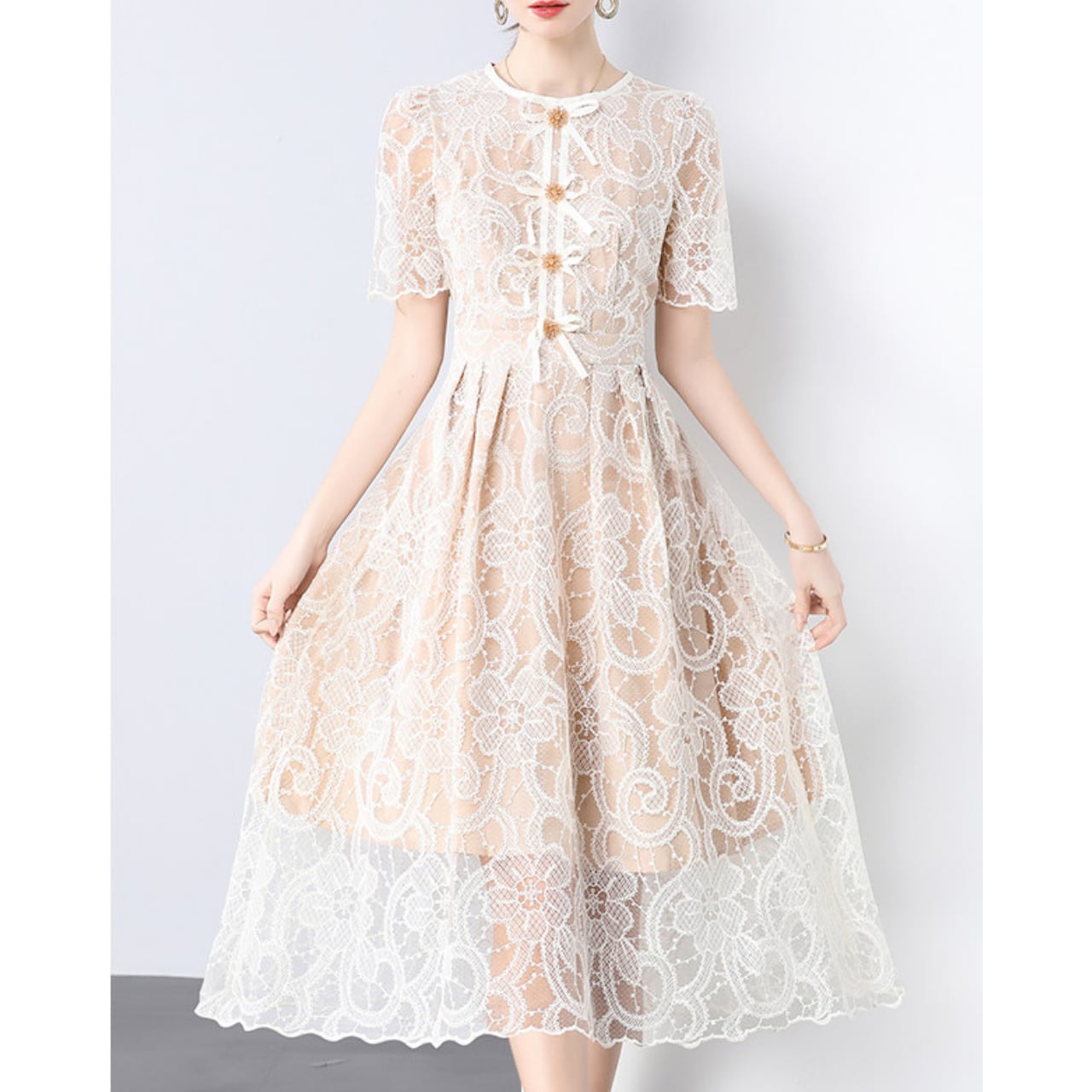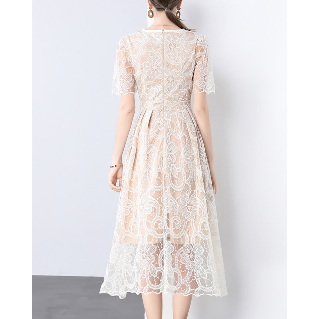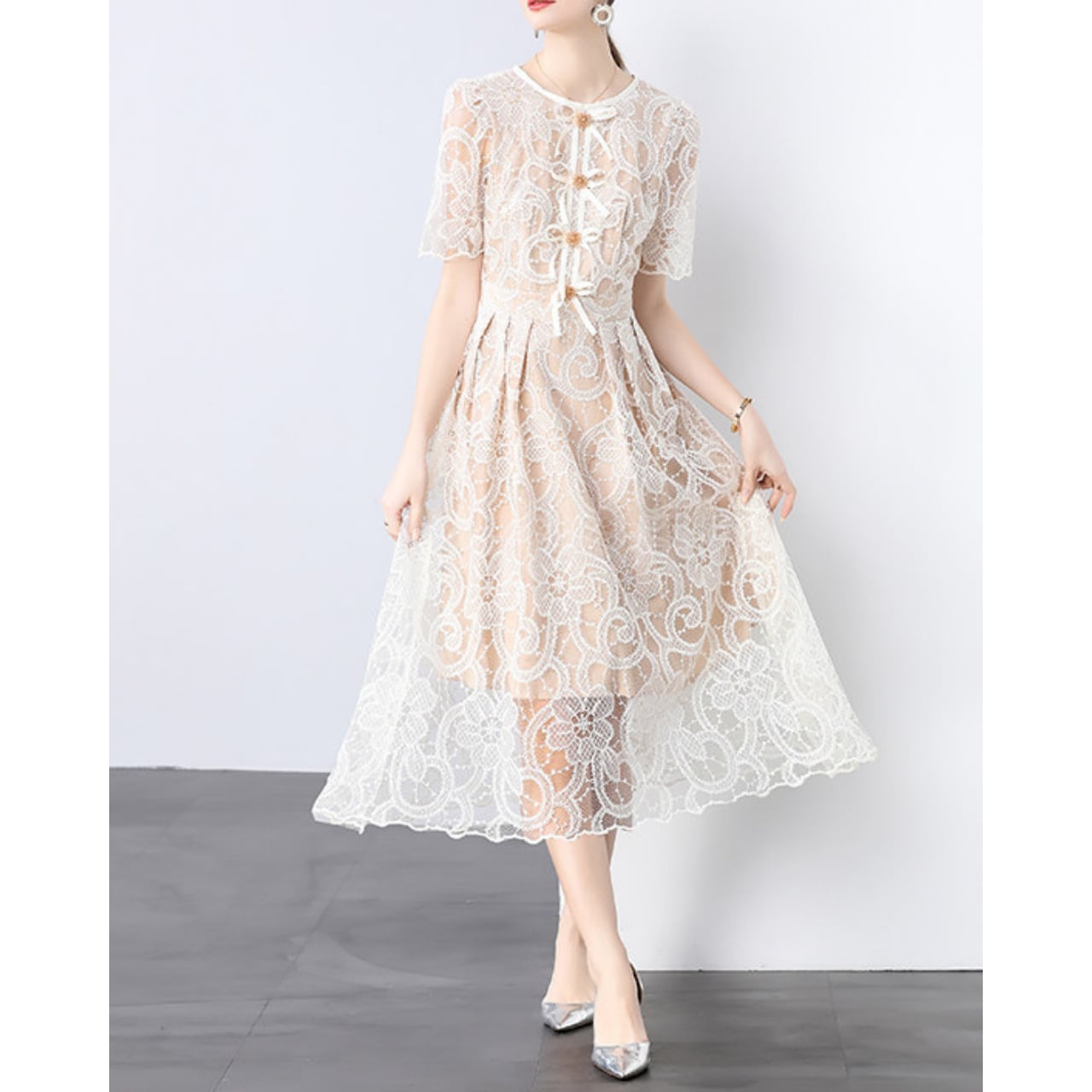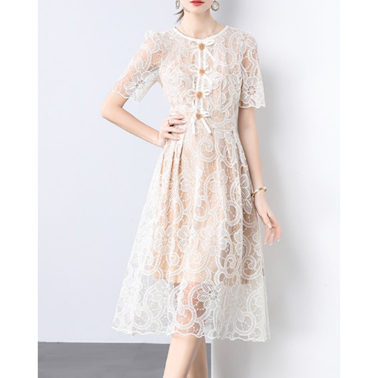 繊細な総レースが全身を包み込み、透明感のある華やかさを演出するワンピースです。