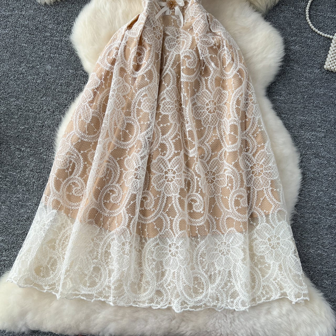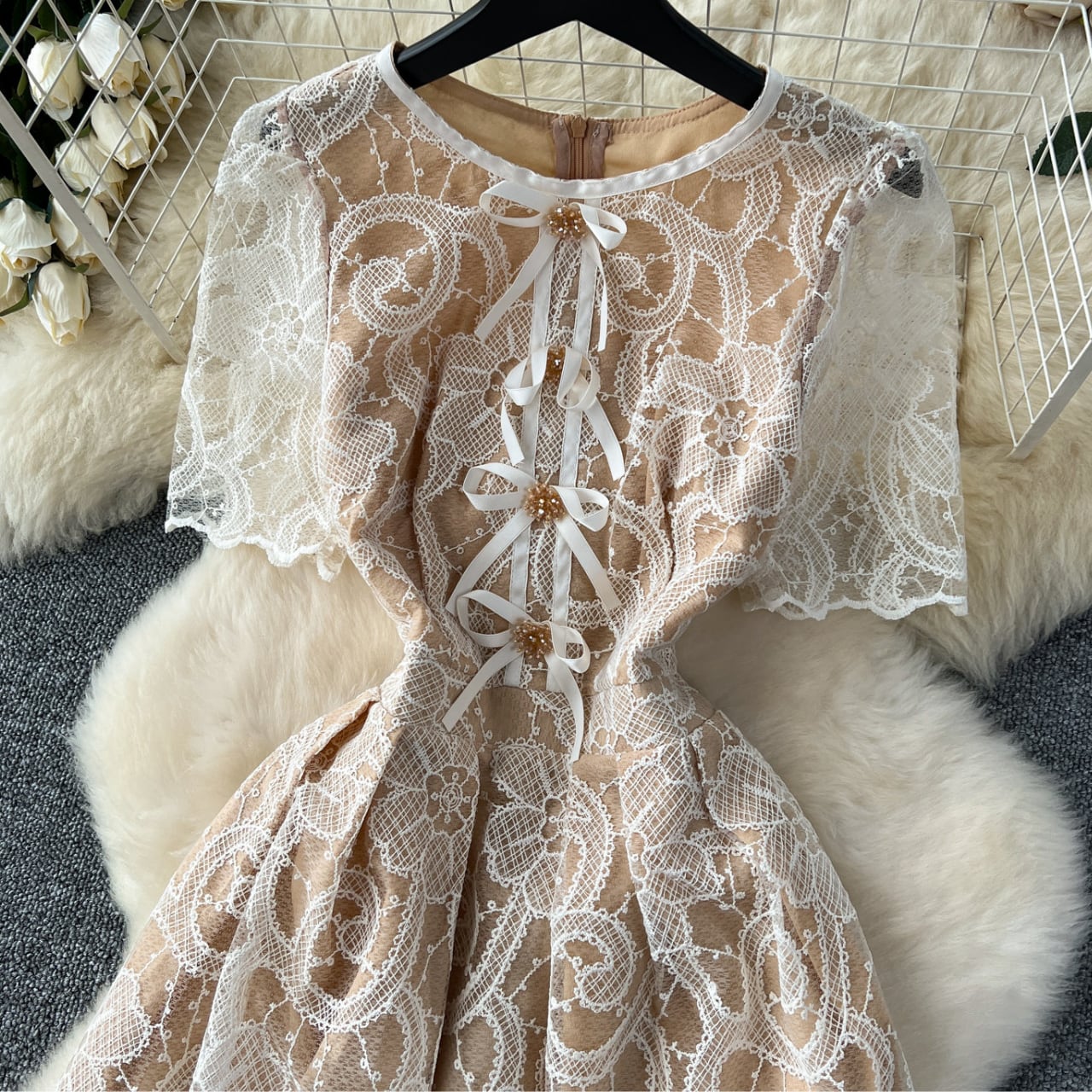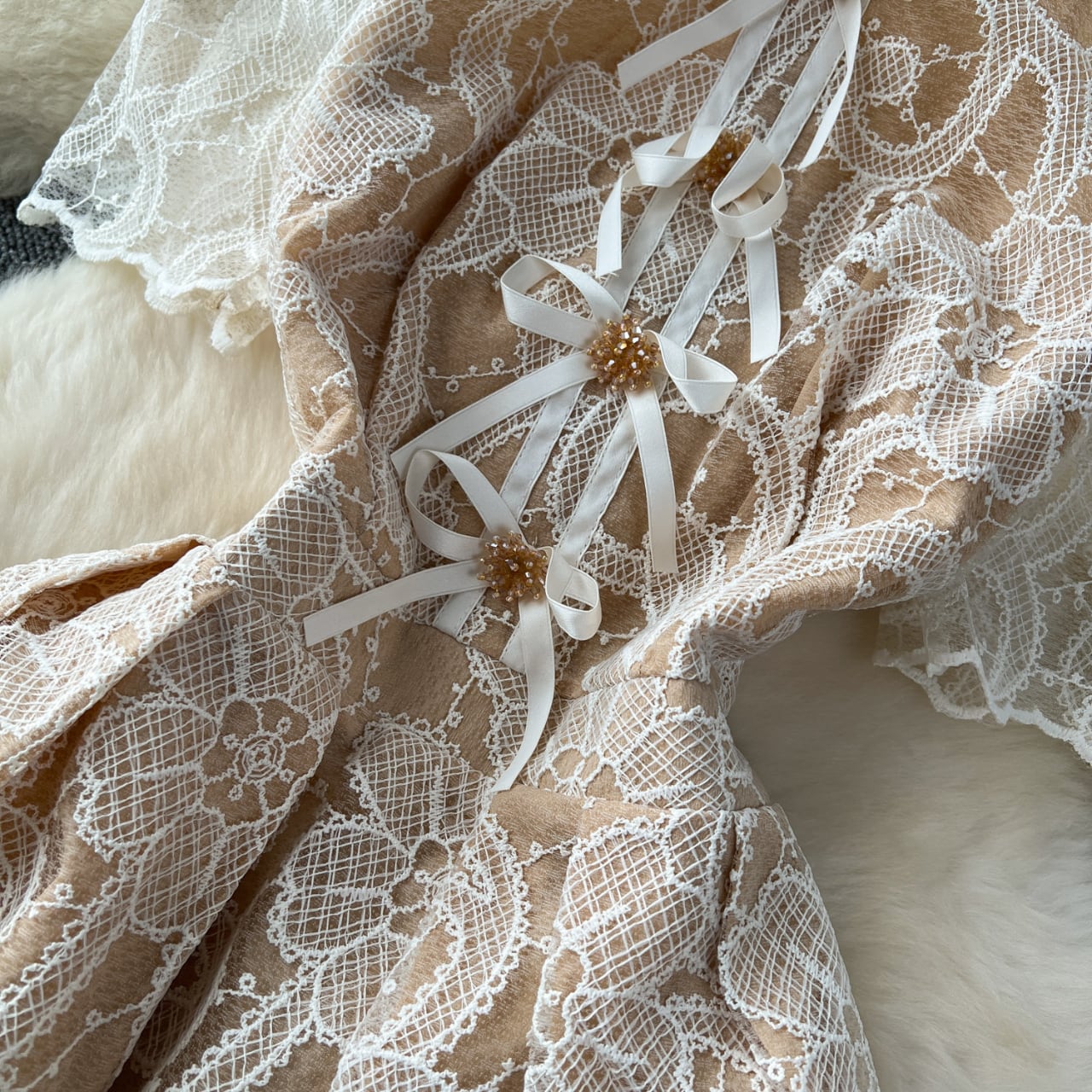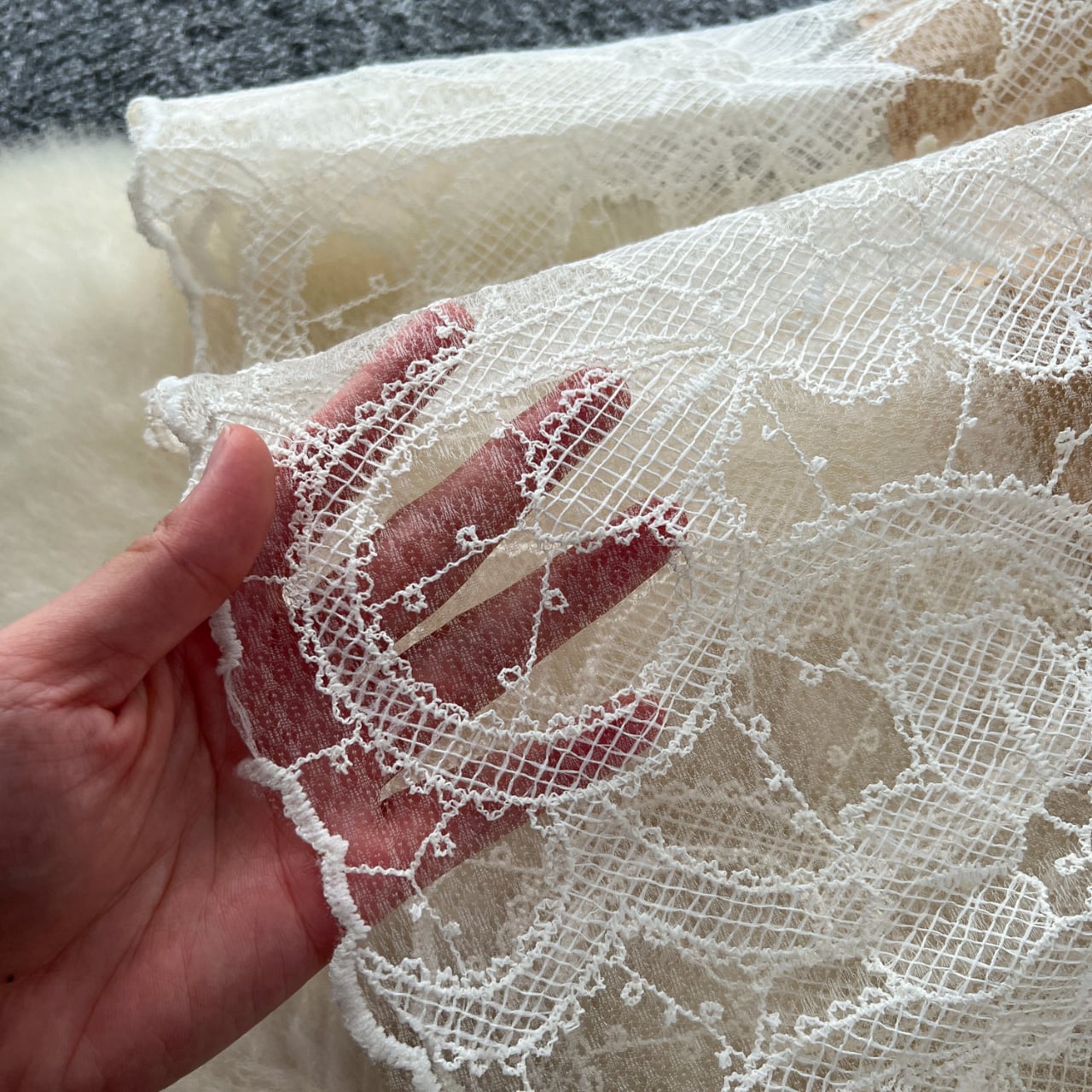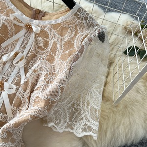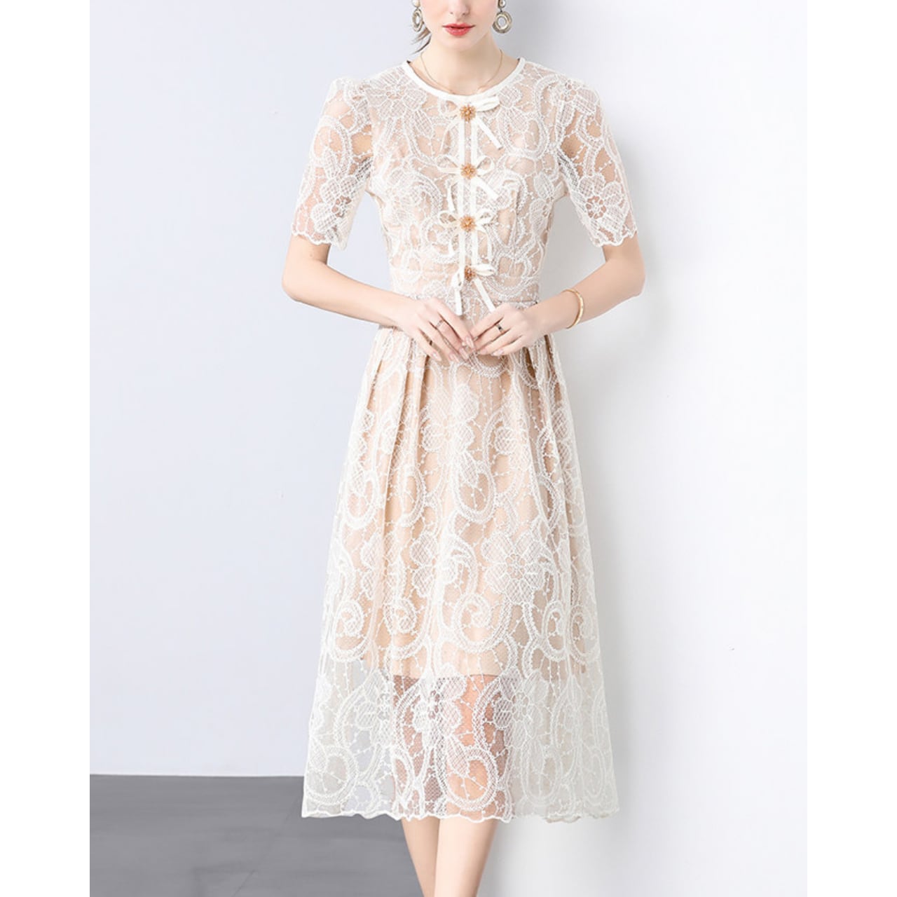 繊細な総レースが全身を包み込み、透明感のある華やかさを演出するワンピースです。