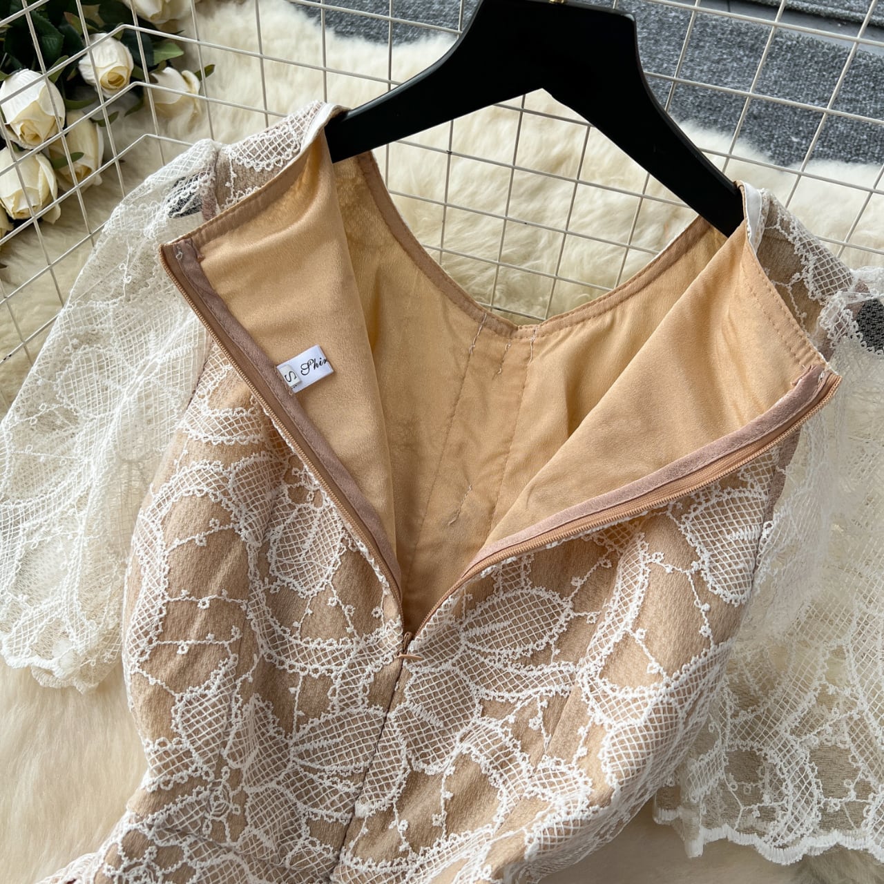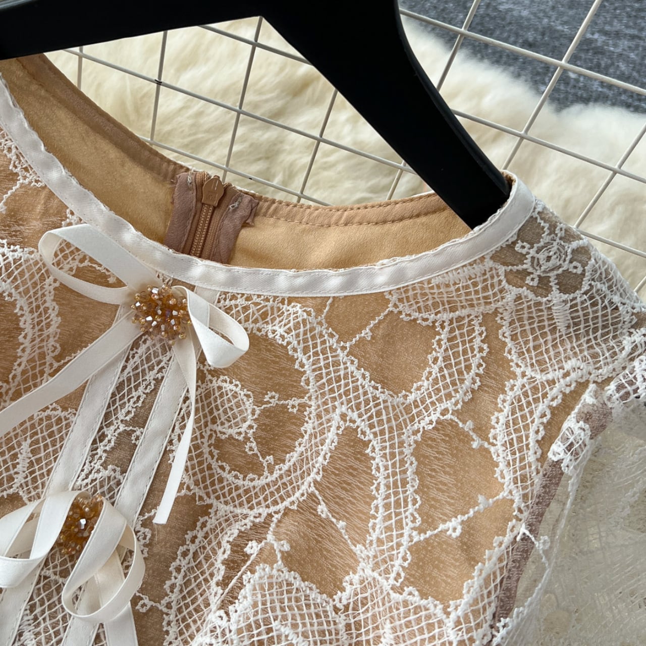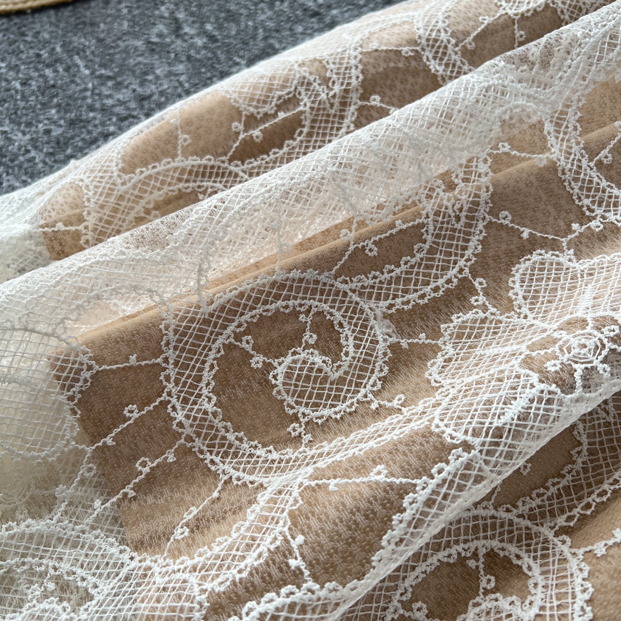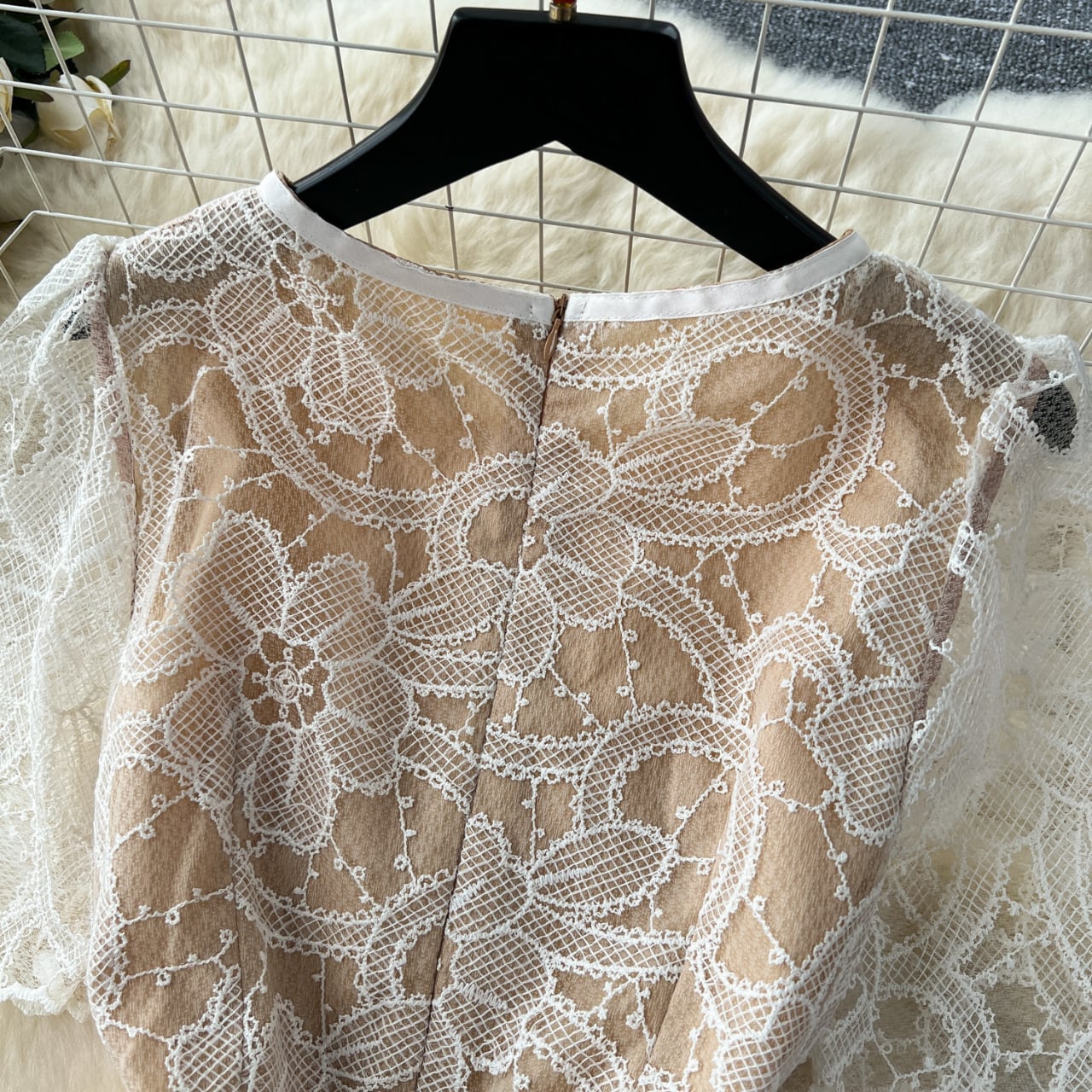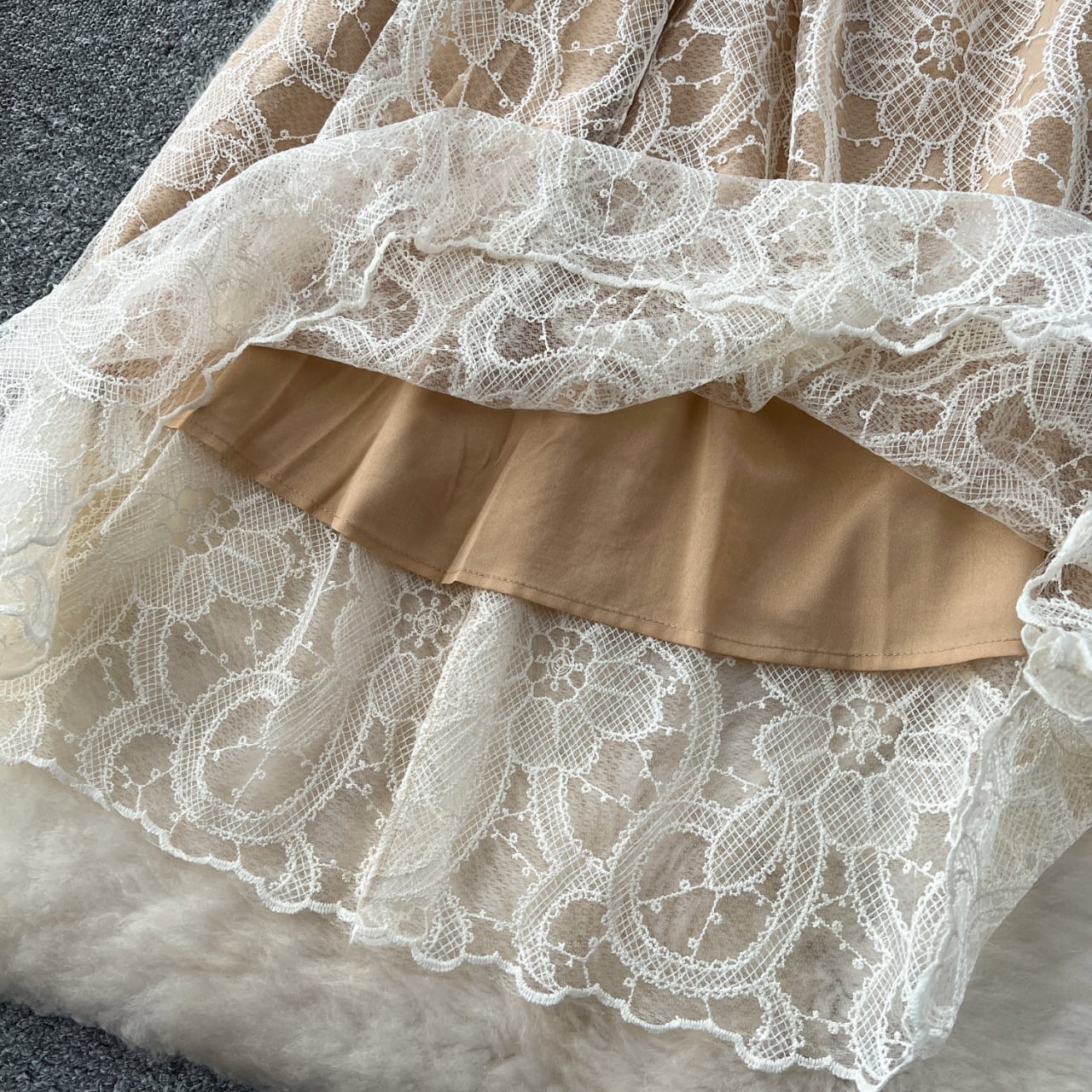繊細な総レースが全身を包み込み、透明感のある華やかさを演出するワンピースです。