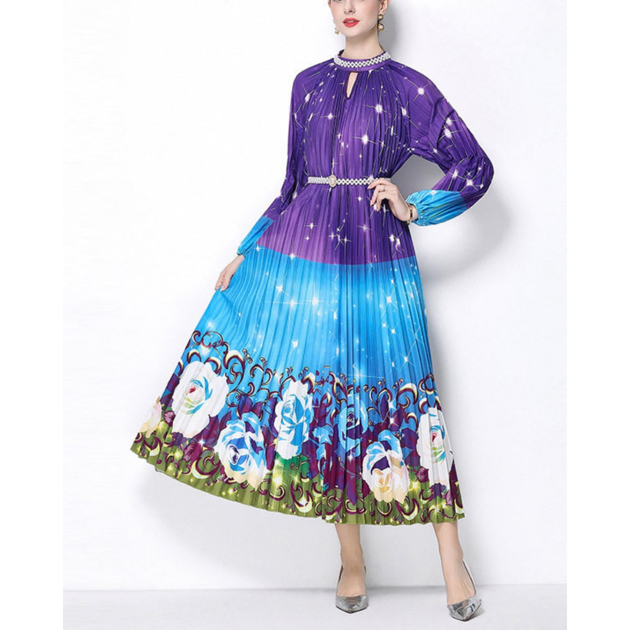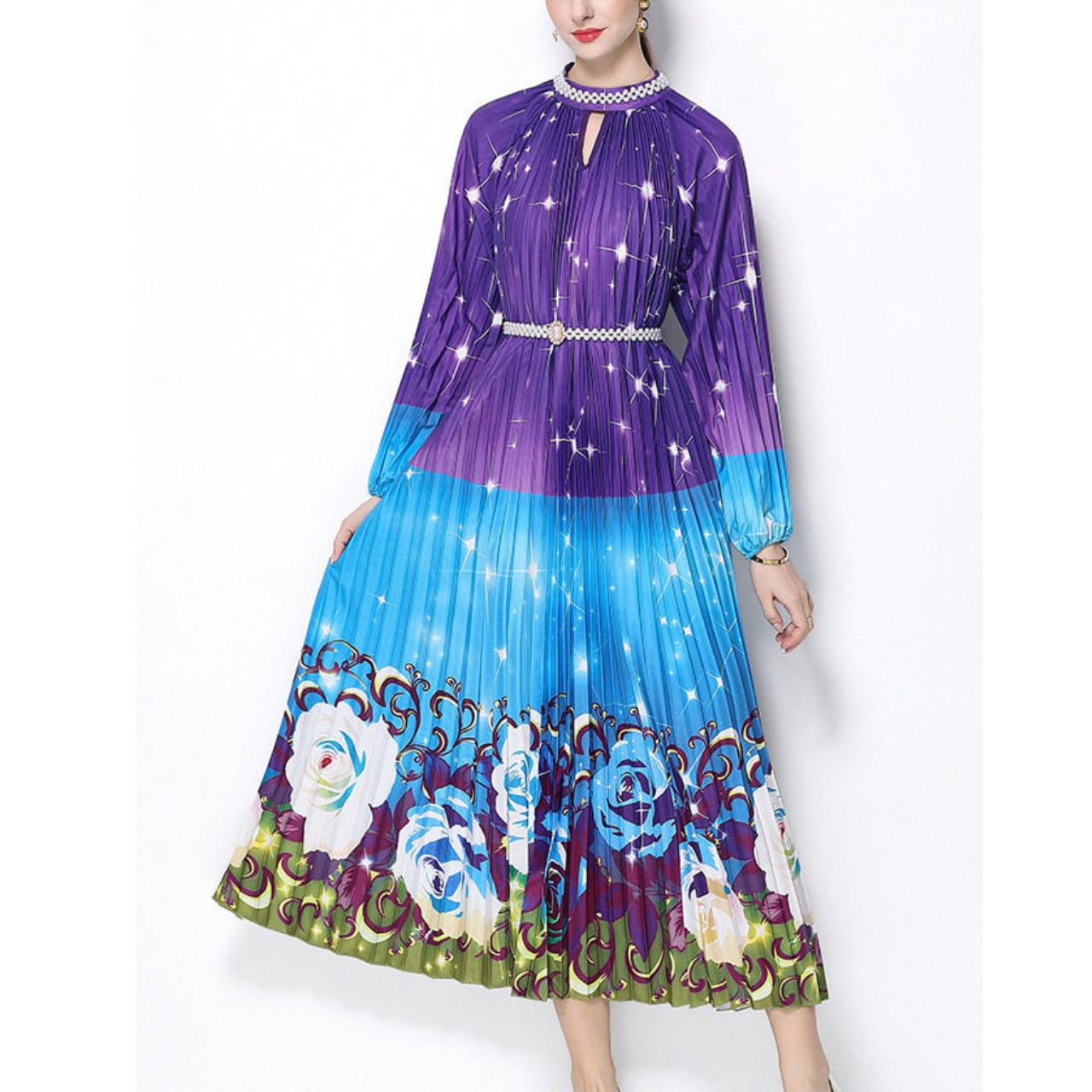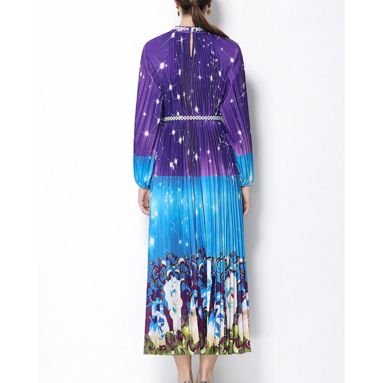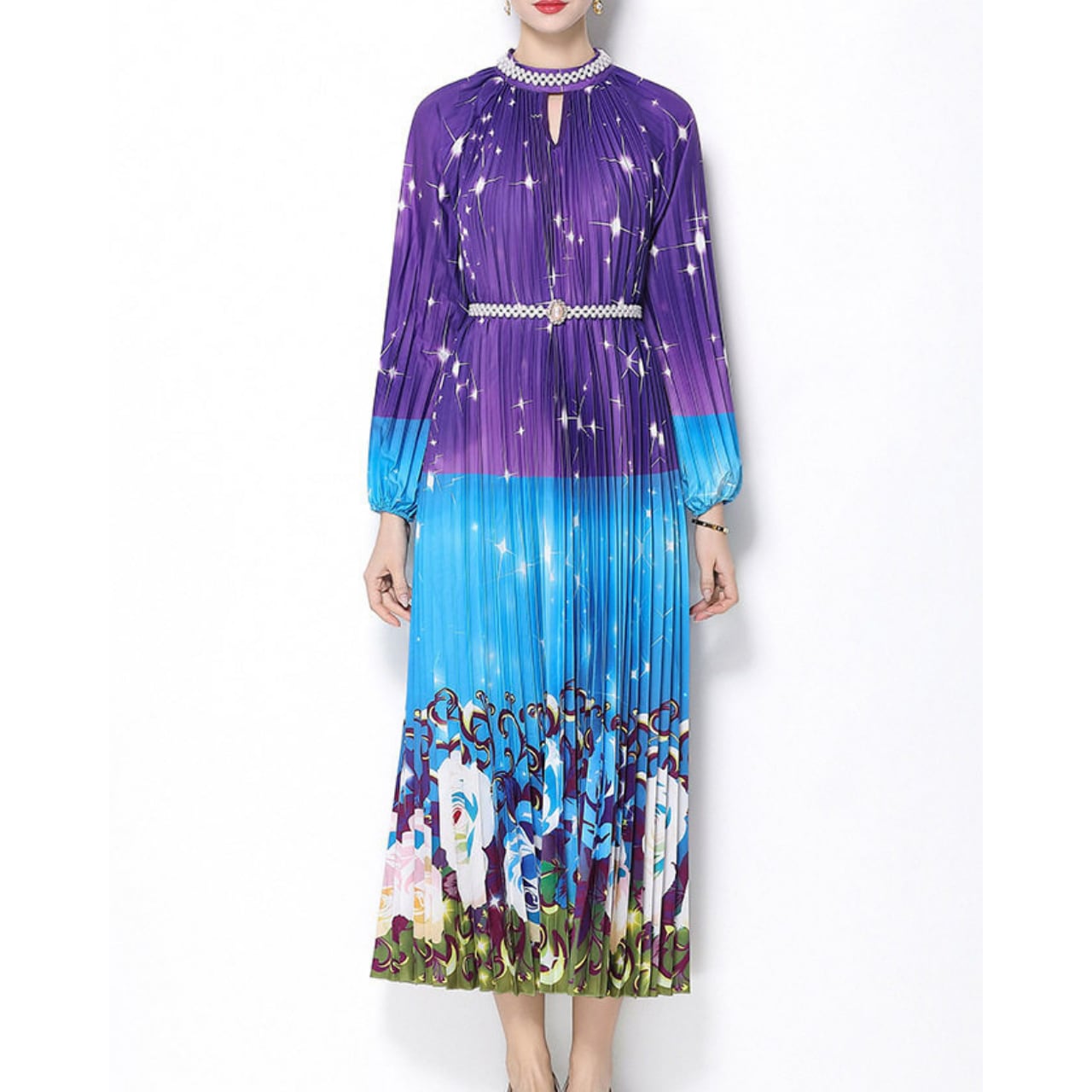 きらめくプリントと美しいグラデーションが、幻想的な華やかさを演出するワンピースです。