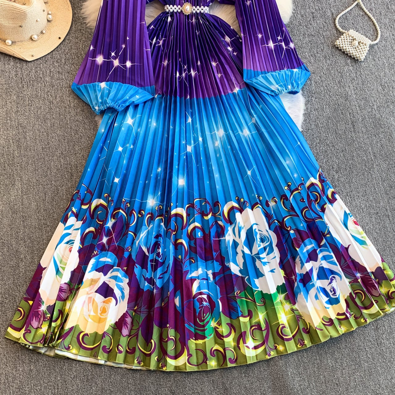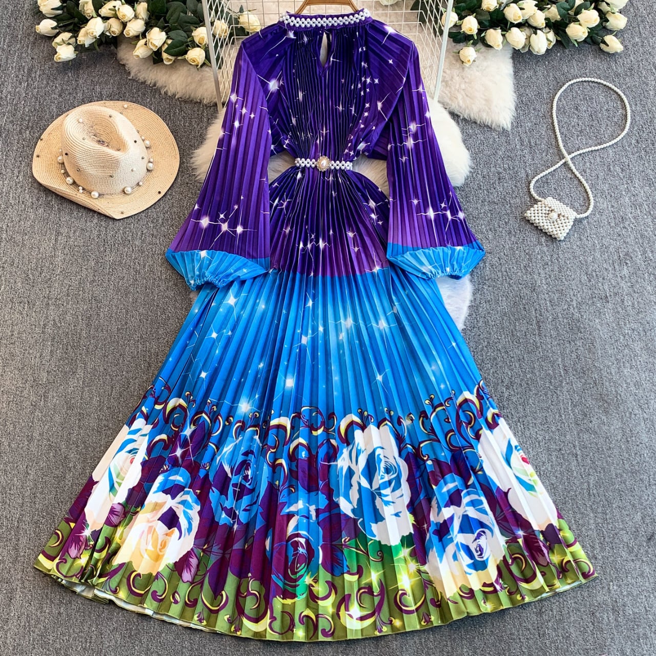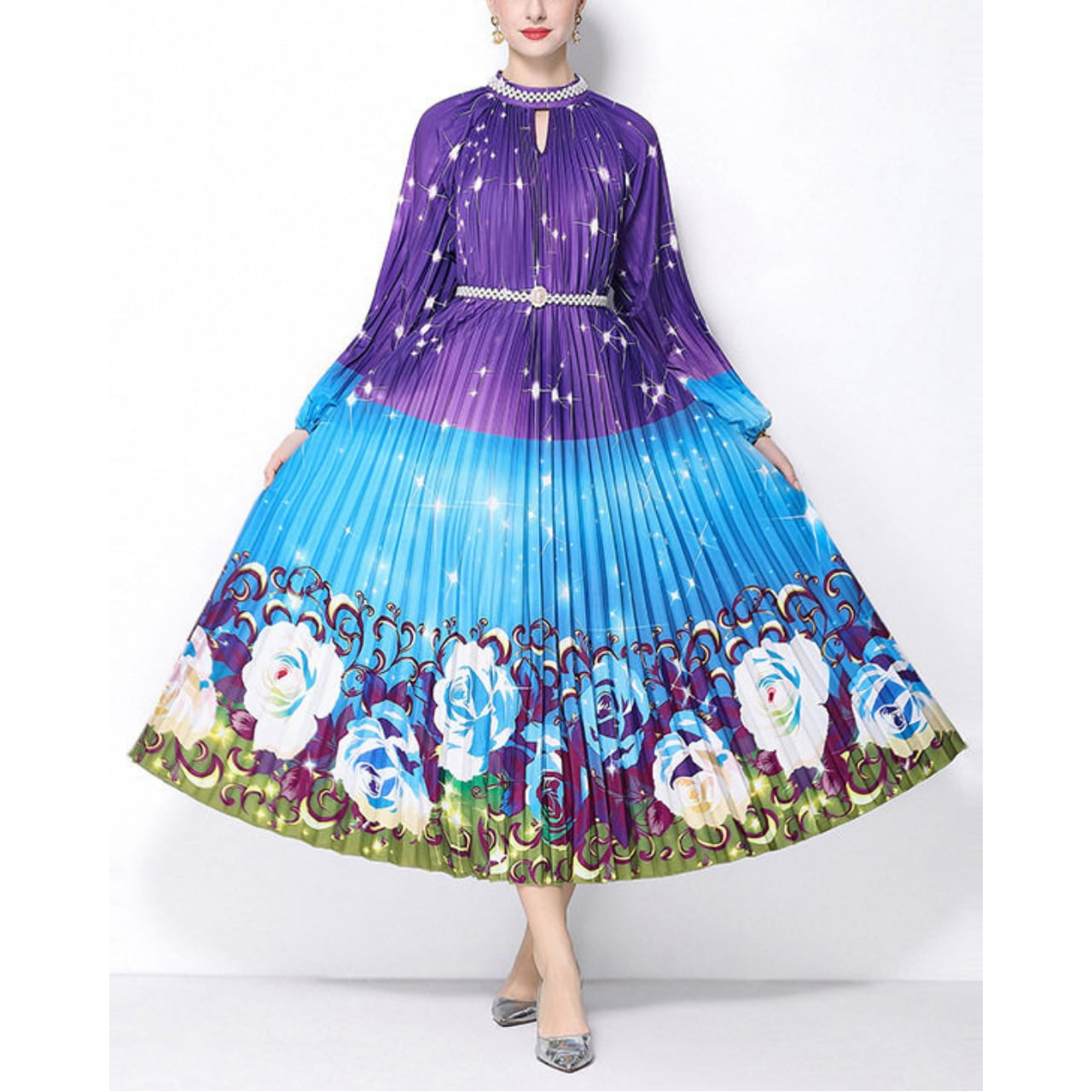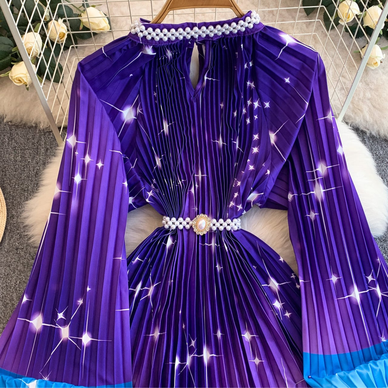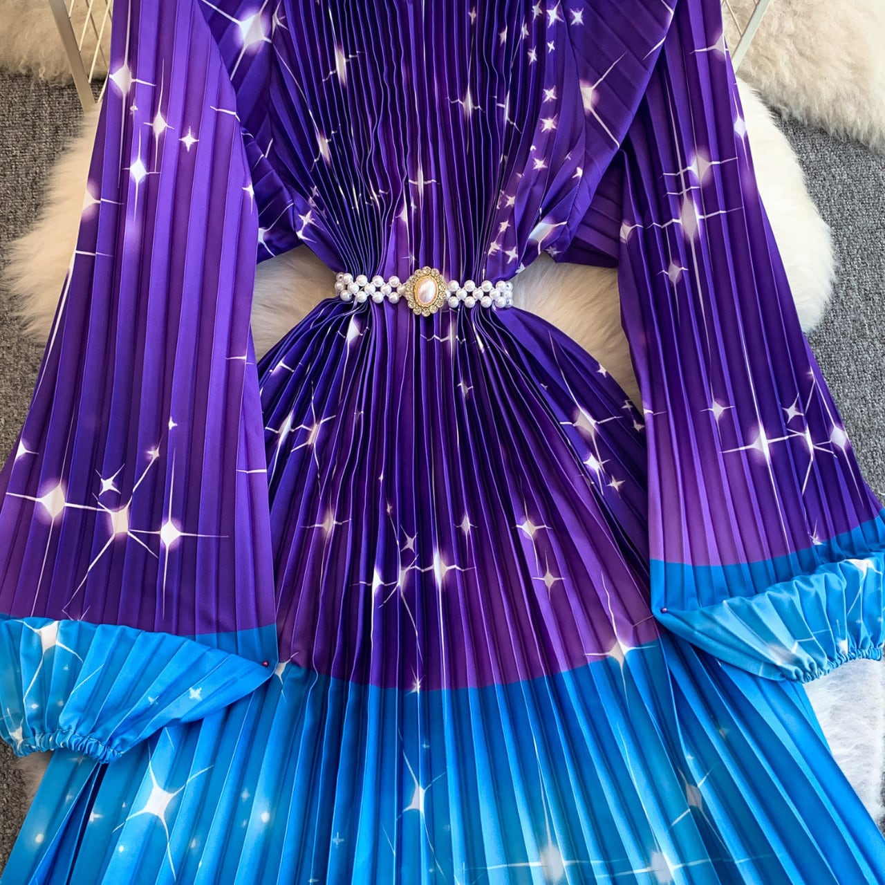 きらめくプリントと美しいグラデーションが、幻想的な華やかさを演出するワンピースです。