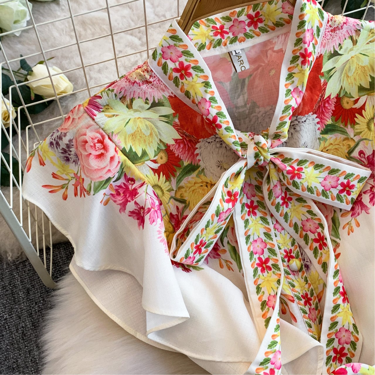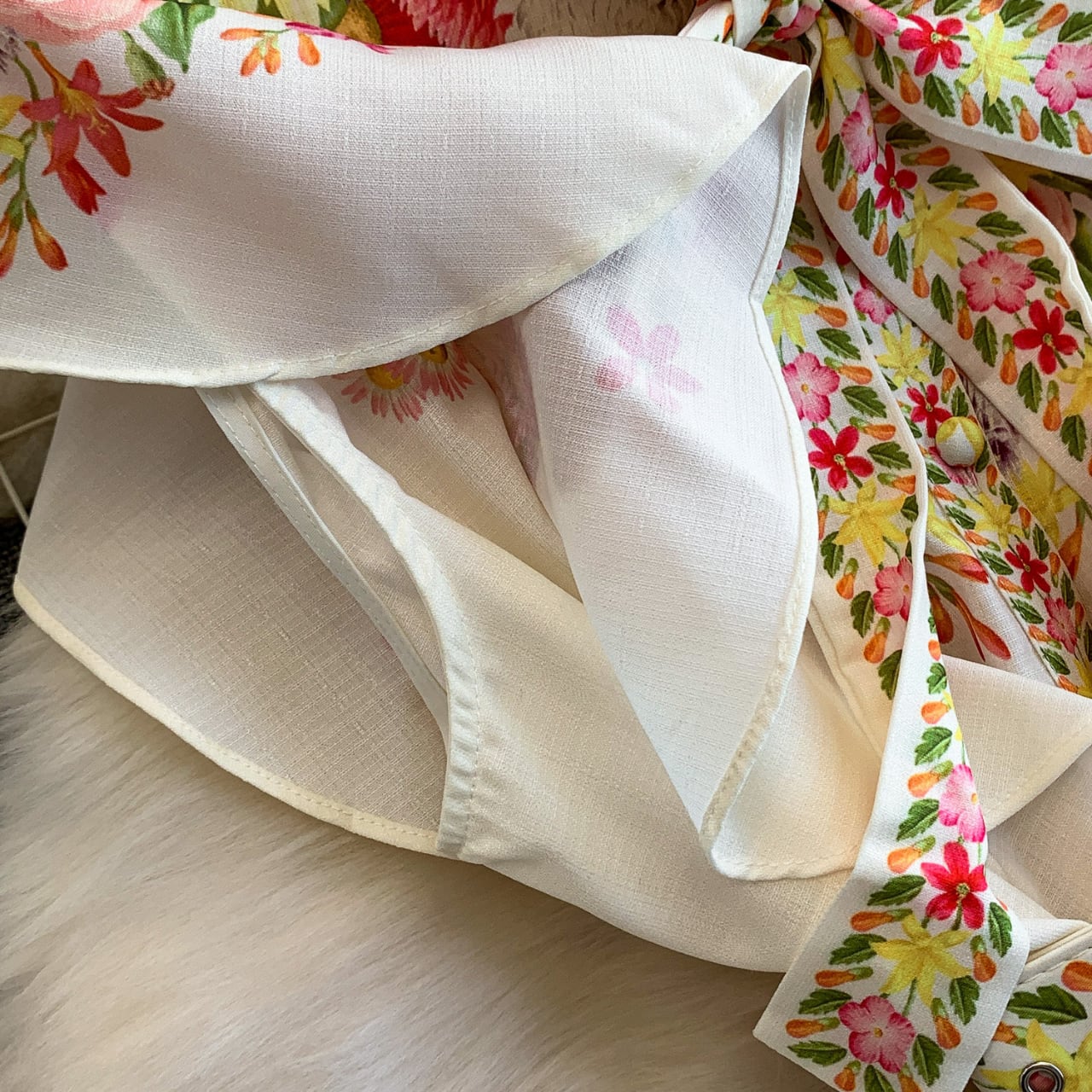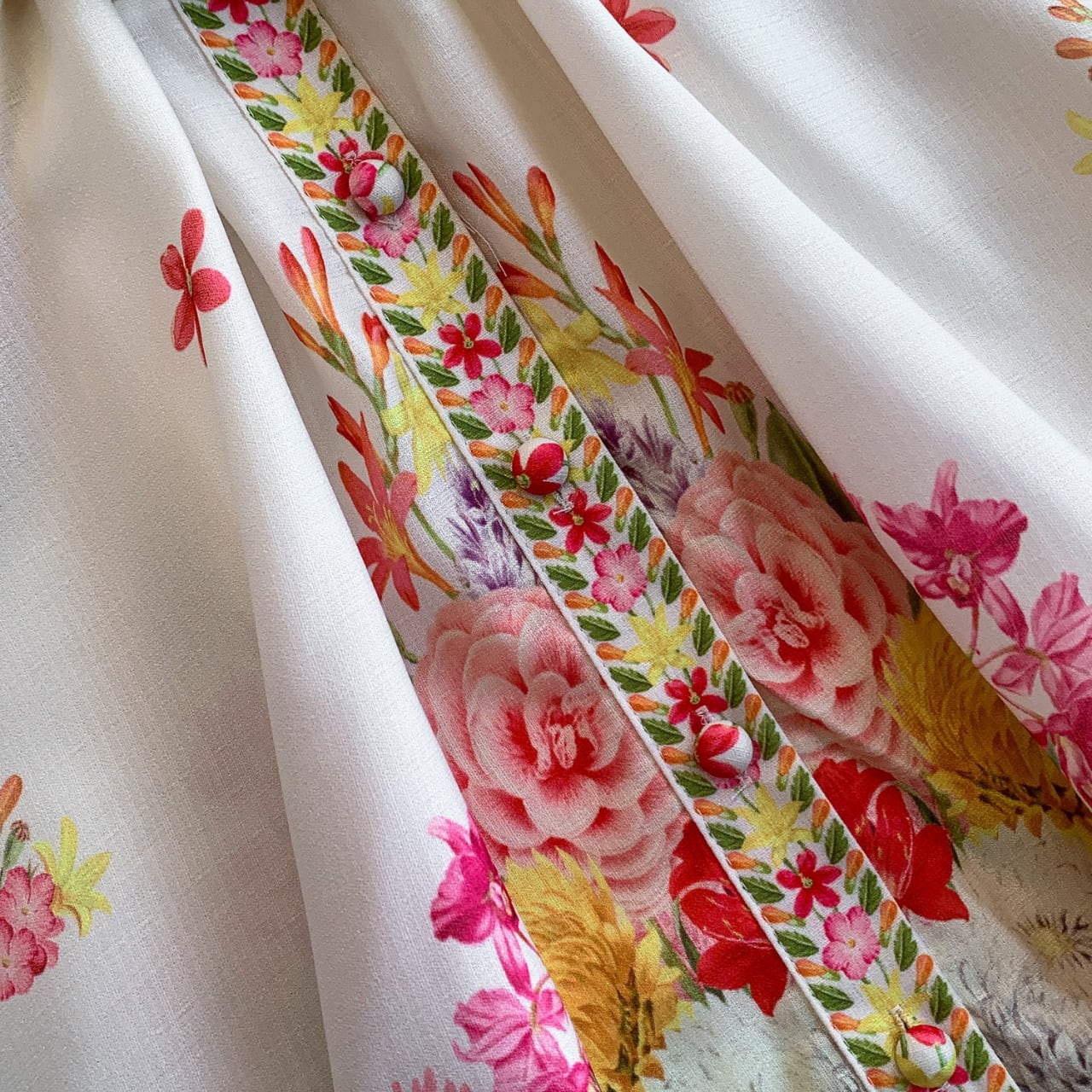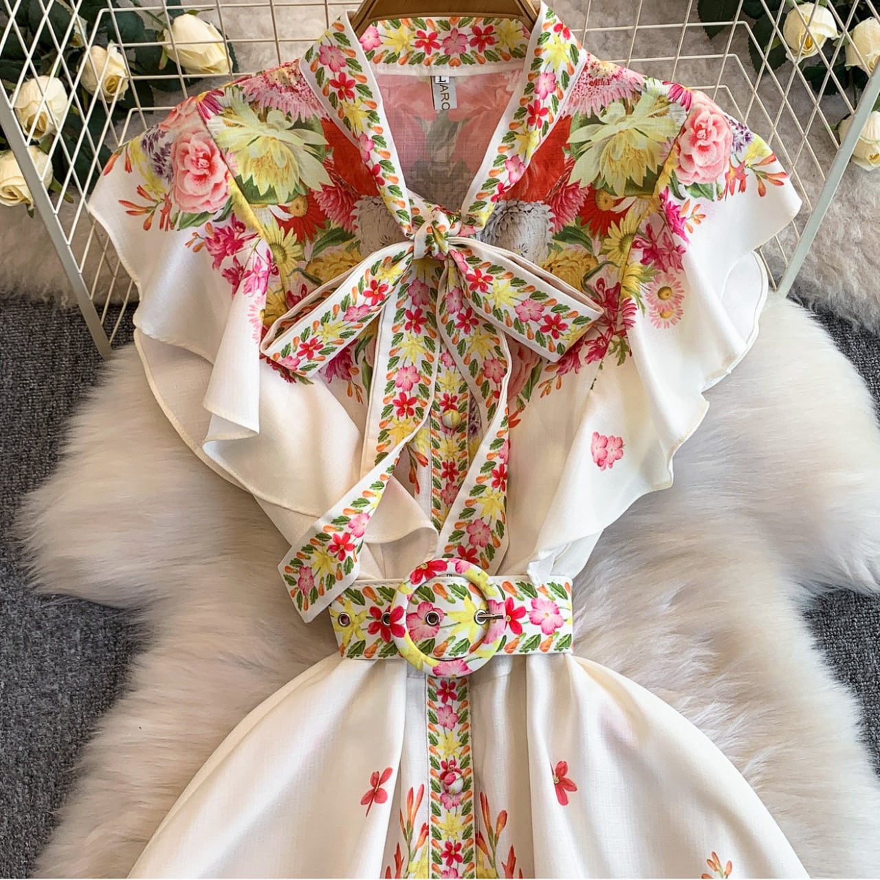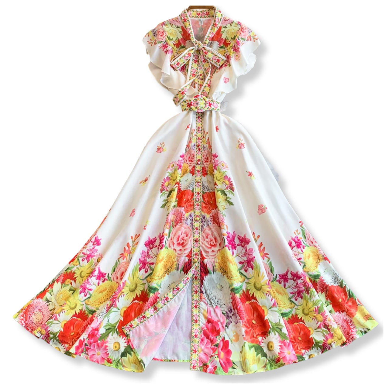 胸元のリボンデザインと流れるようなフラワーデザインが、華やかで上品な印象を演出する一着です。