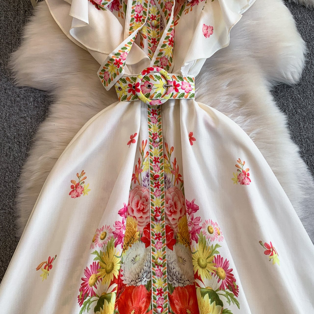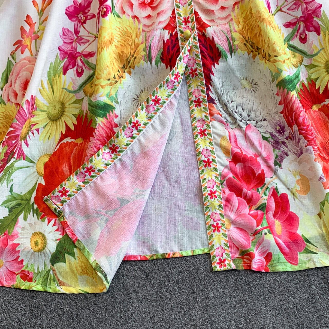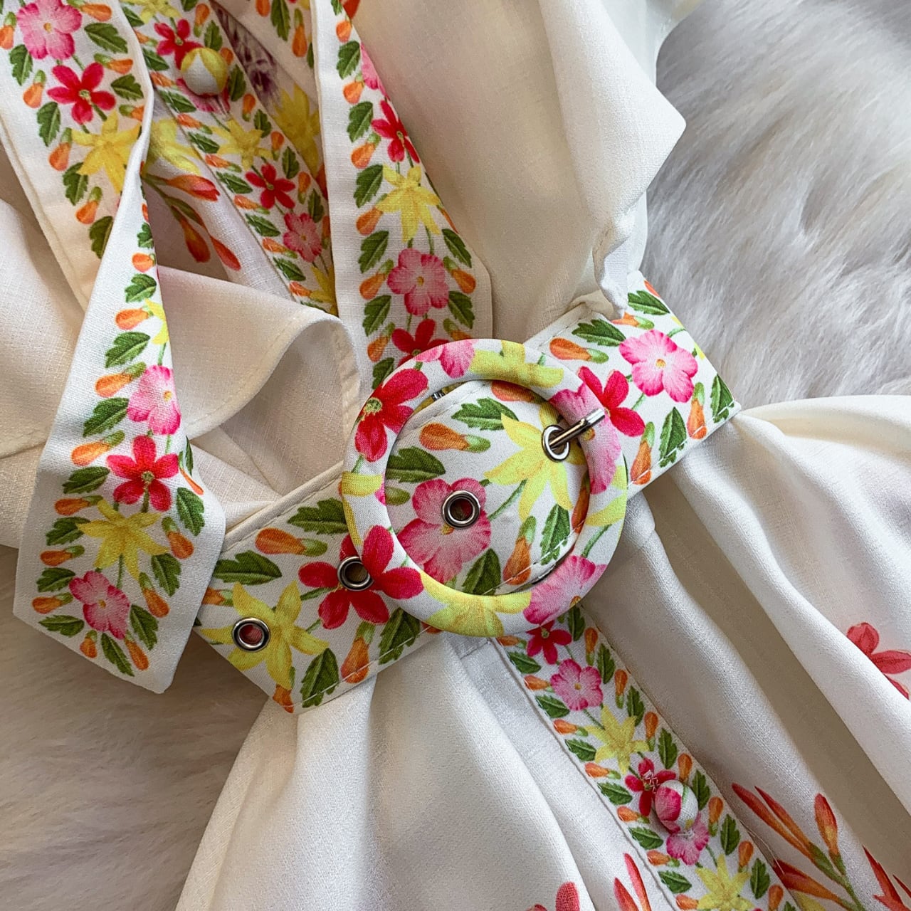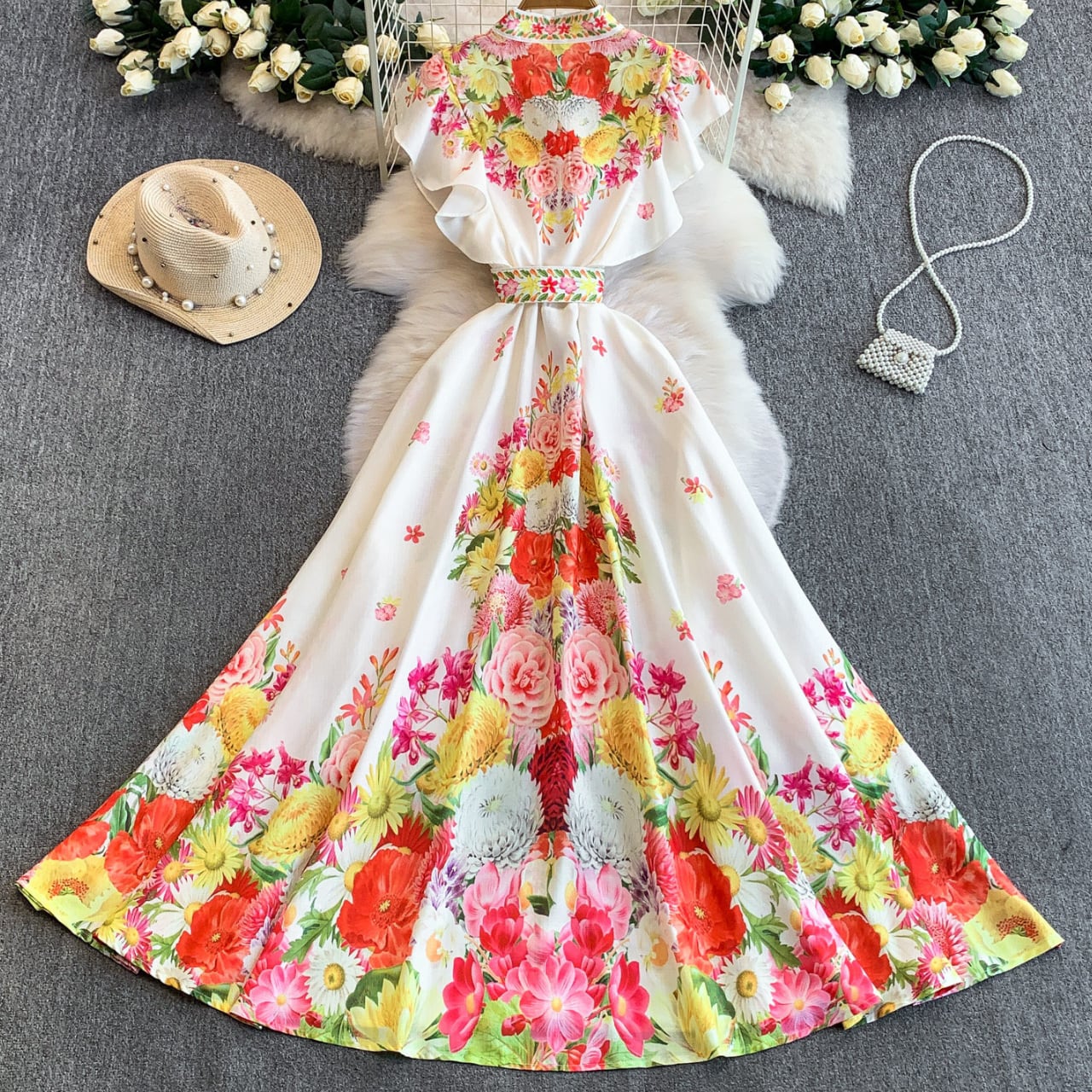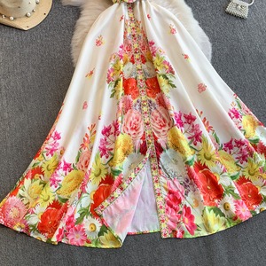 胸元のリボンデザインと流れるようなフラワーデザインが、華やかで上品な印象を演出する一着です。