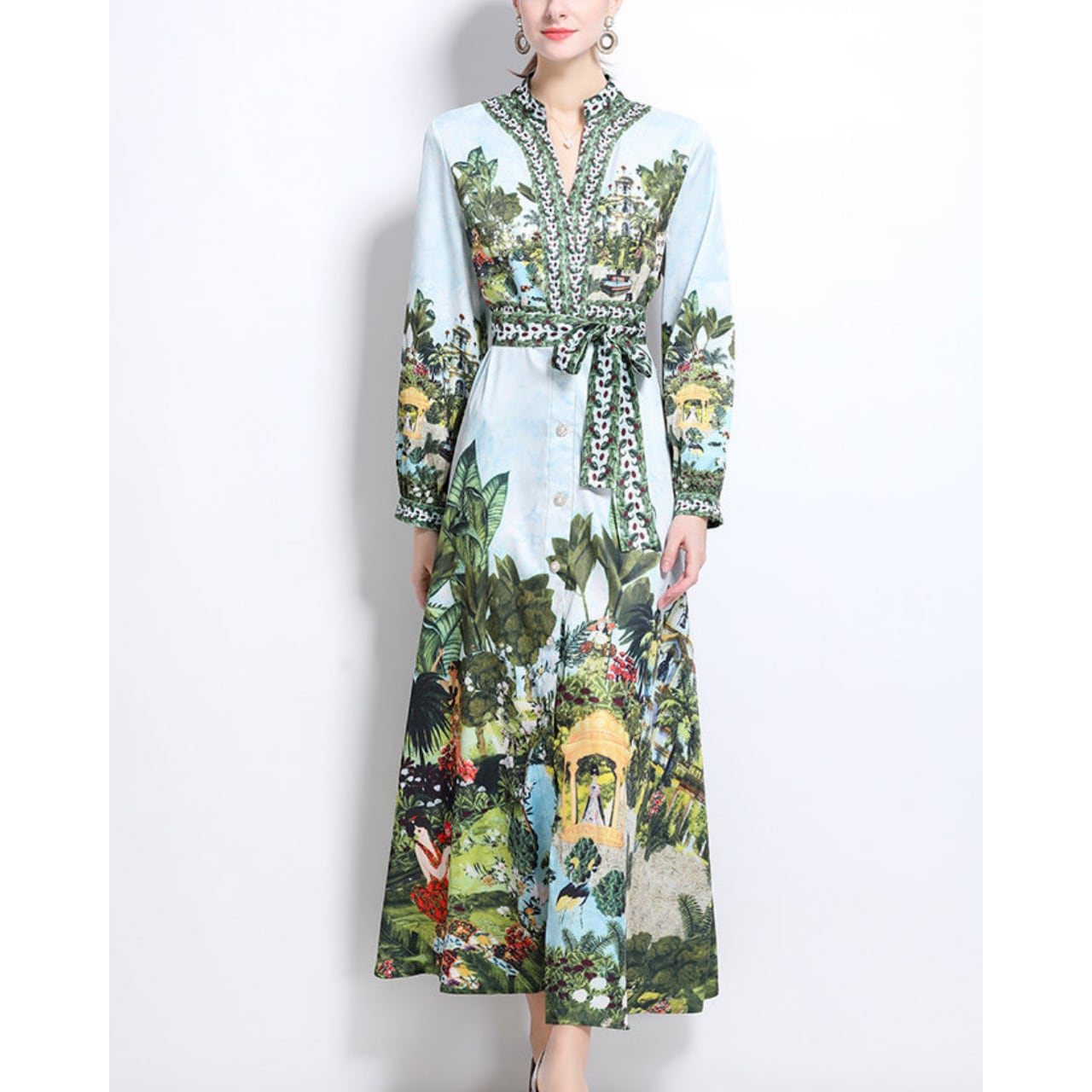 印象的な柄使いとスタンドカラーが、存在感のあるエレガントスタイルを演出する一着。
