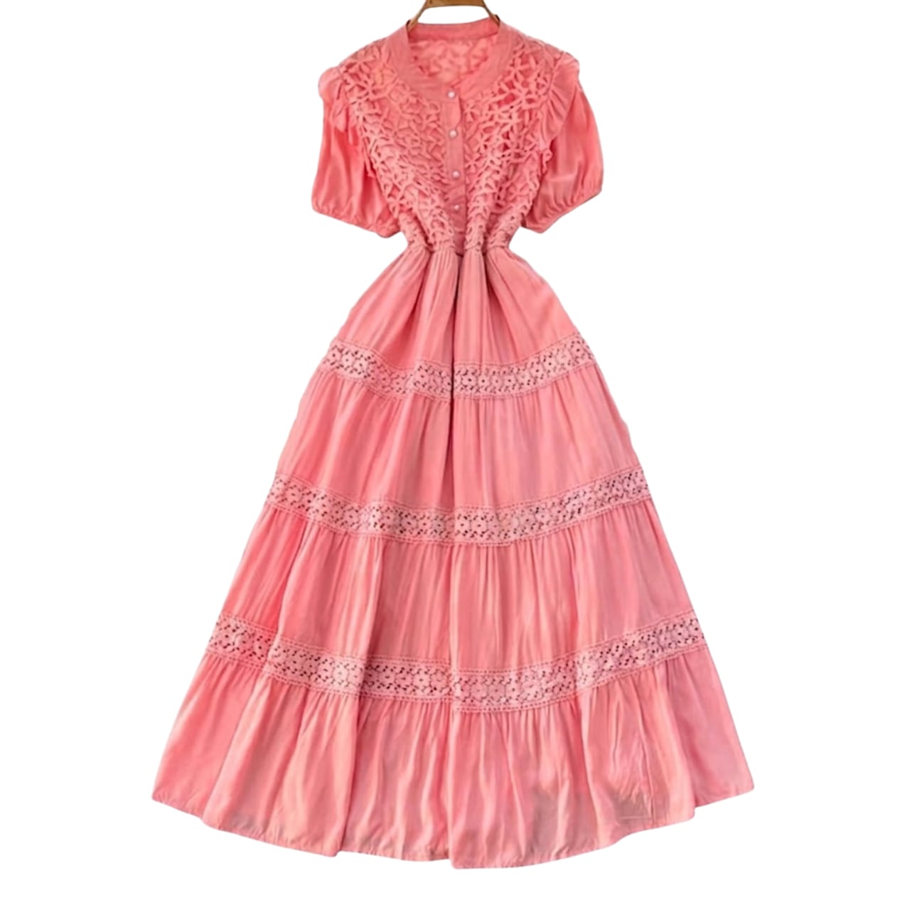 繊細なレース切替が印象的な、クラシカルで華やかなティアードワンピースです。