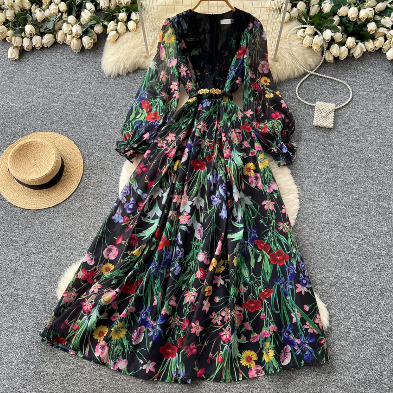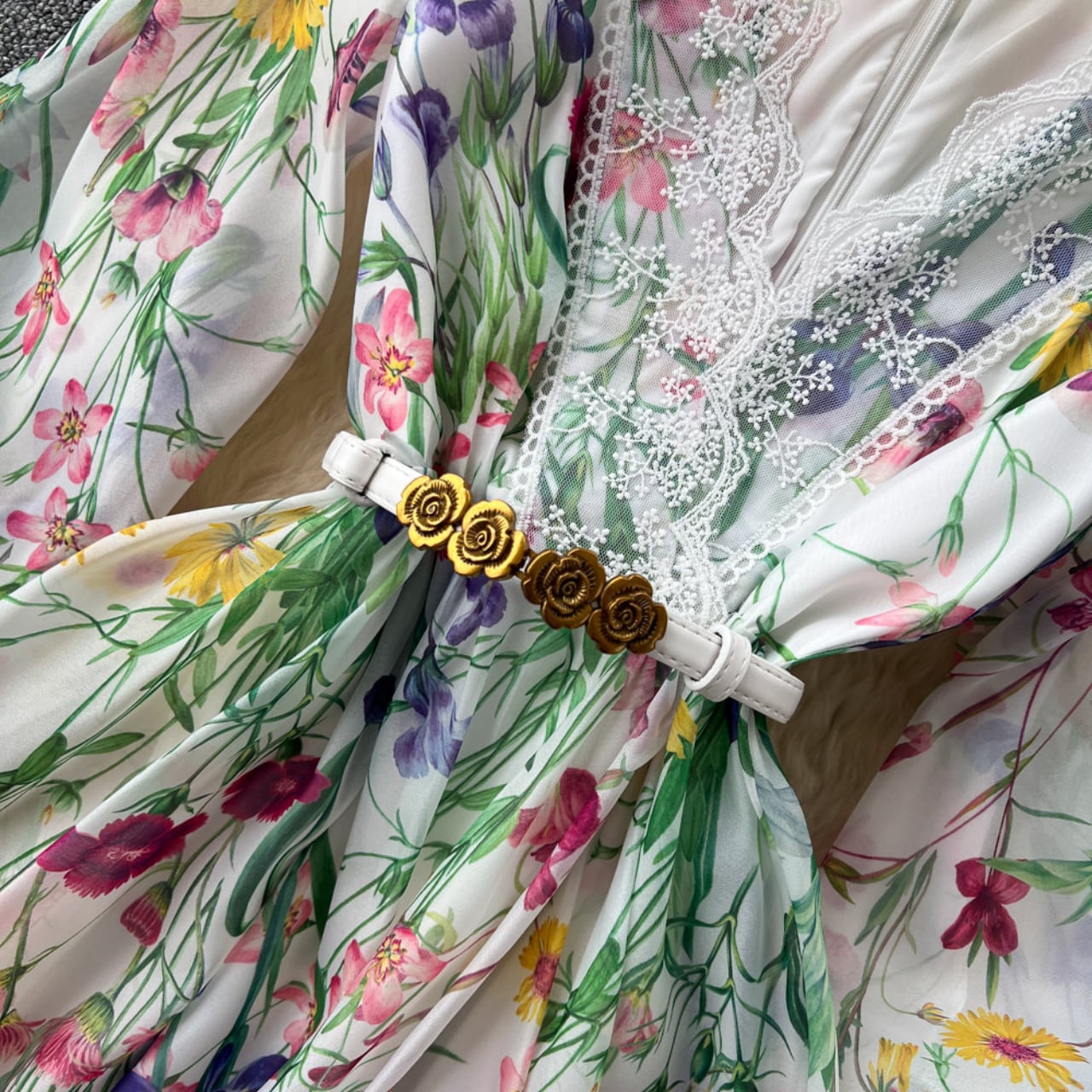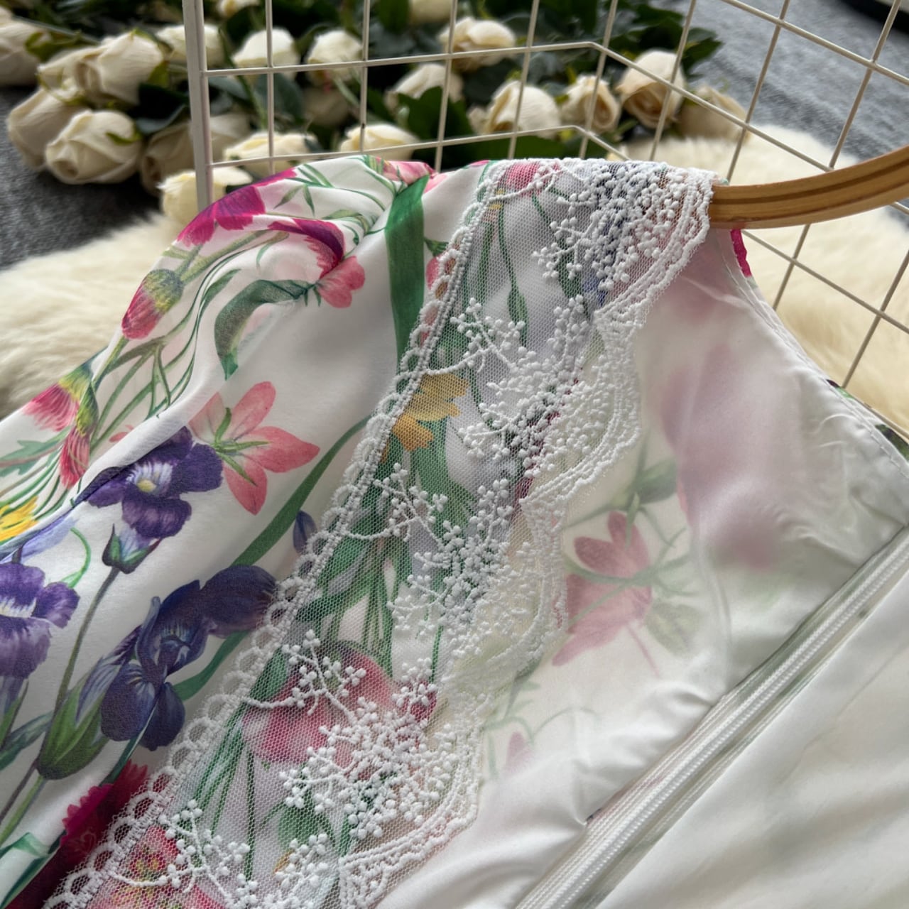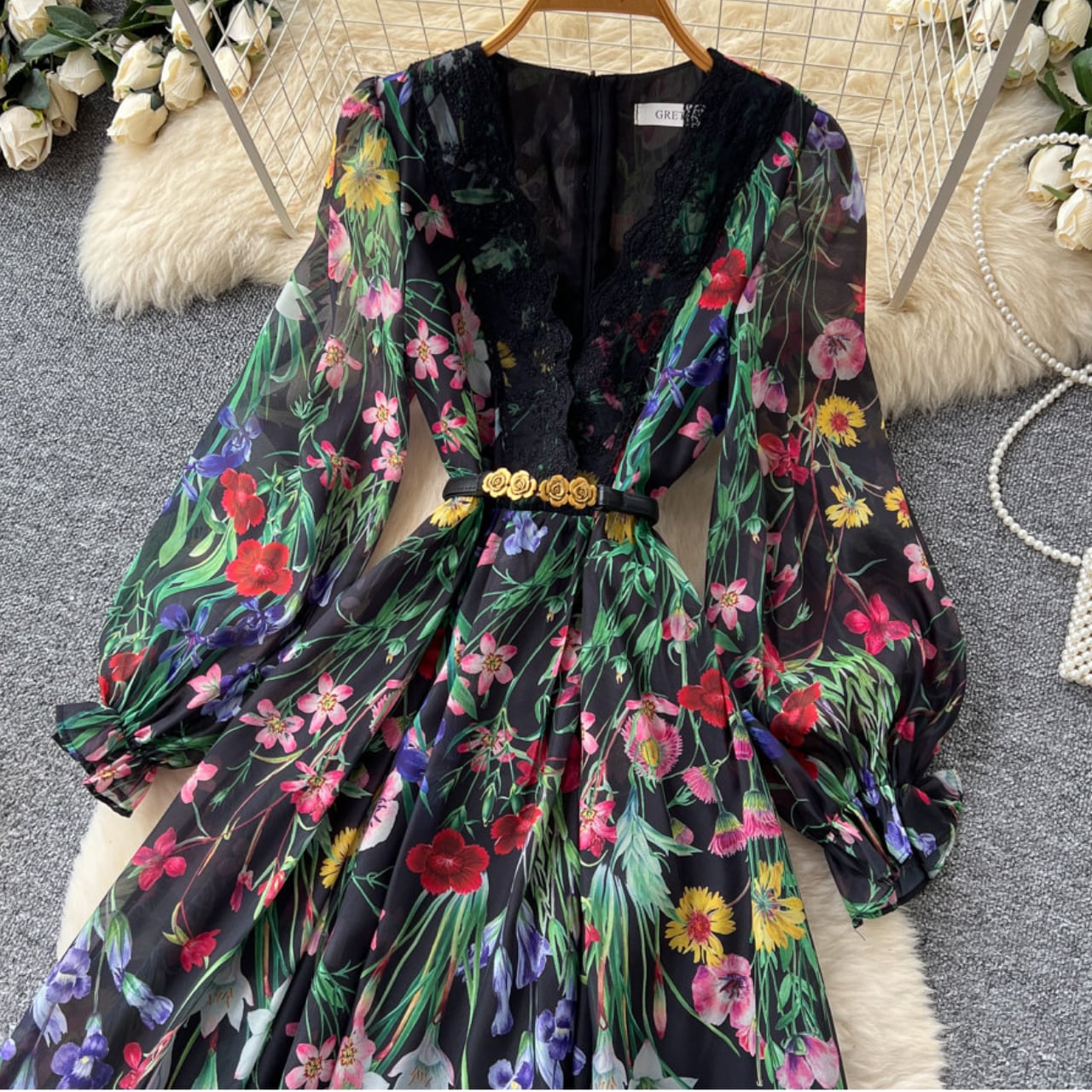 繊細なレース切替と華やかなフラワープリントが調和した、上品な存在感を放つ一着です。