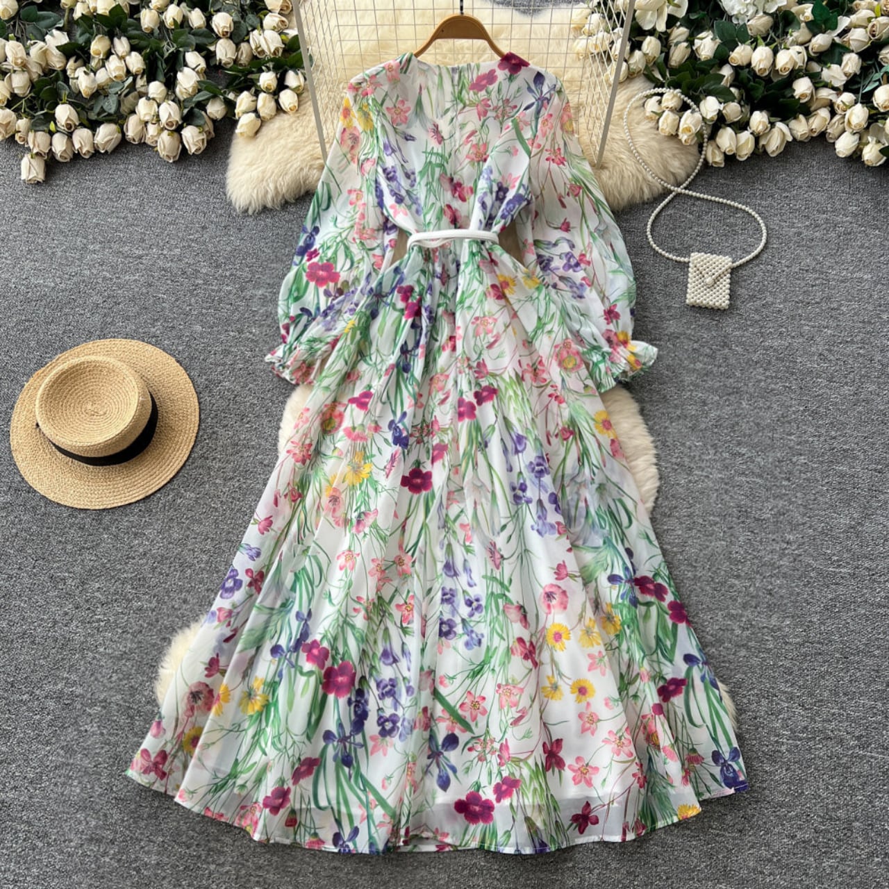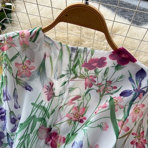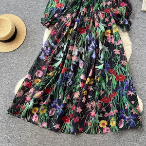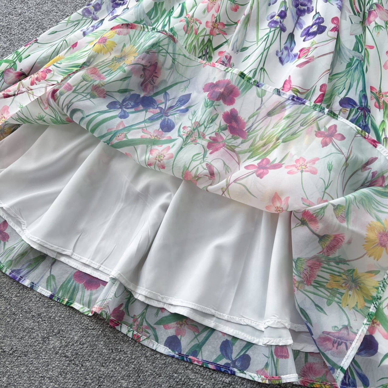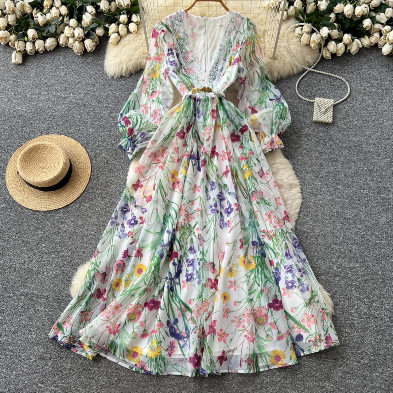 繊細なレース切替と華やかなフラワープリントが調和した、上品な存在感を放つ一着です。
