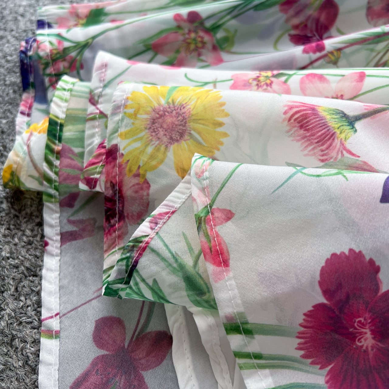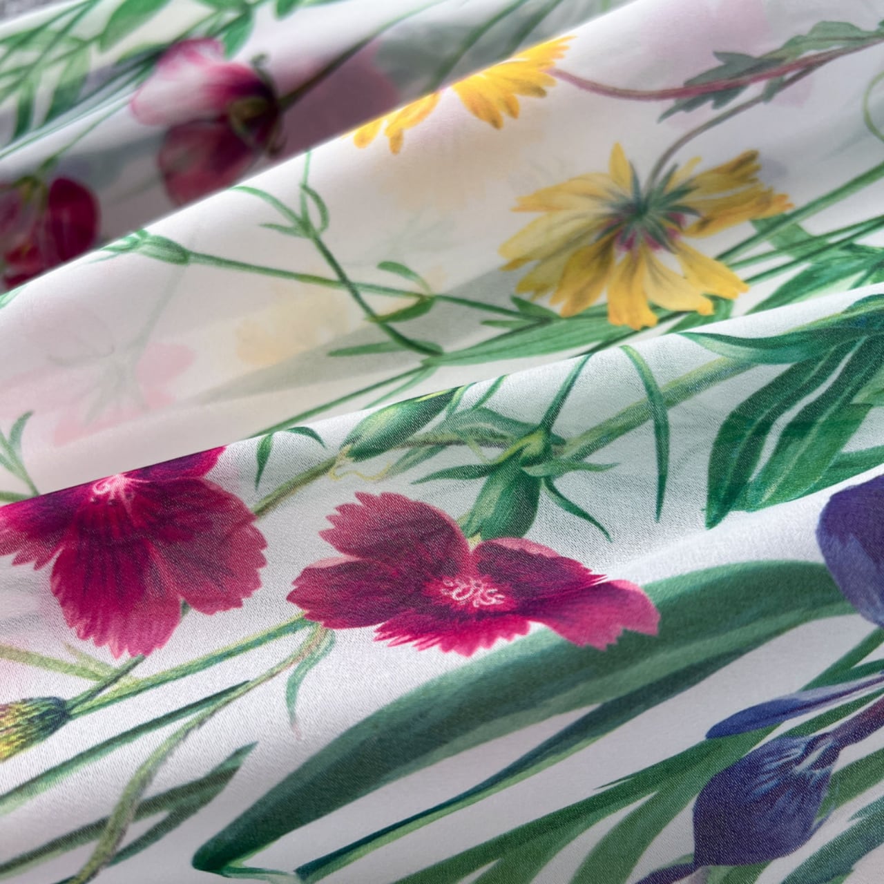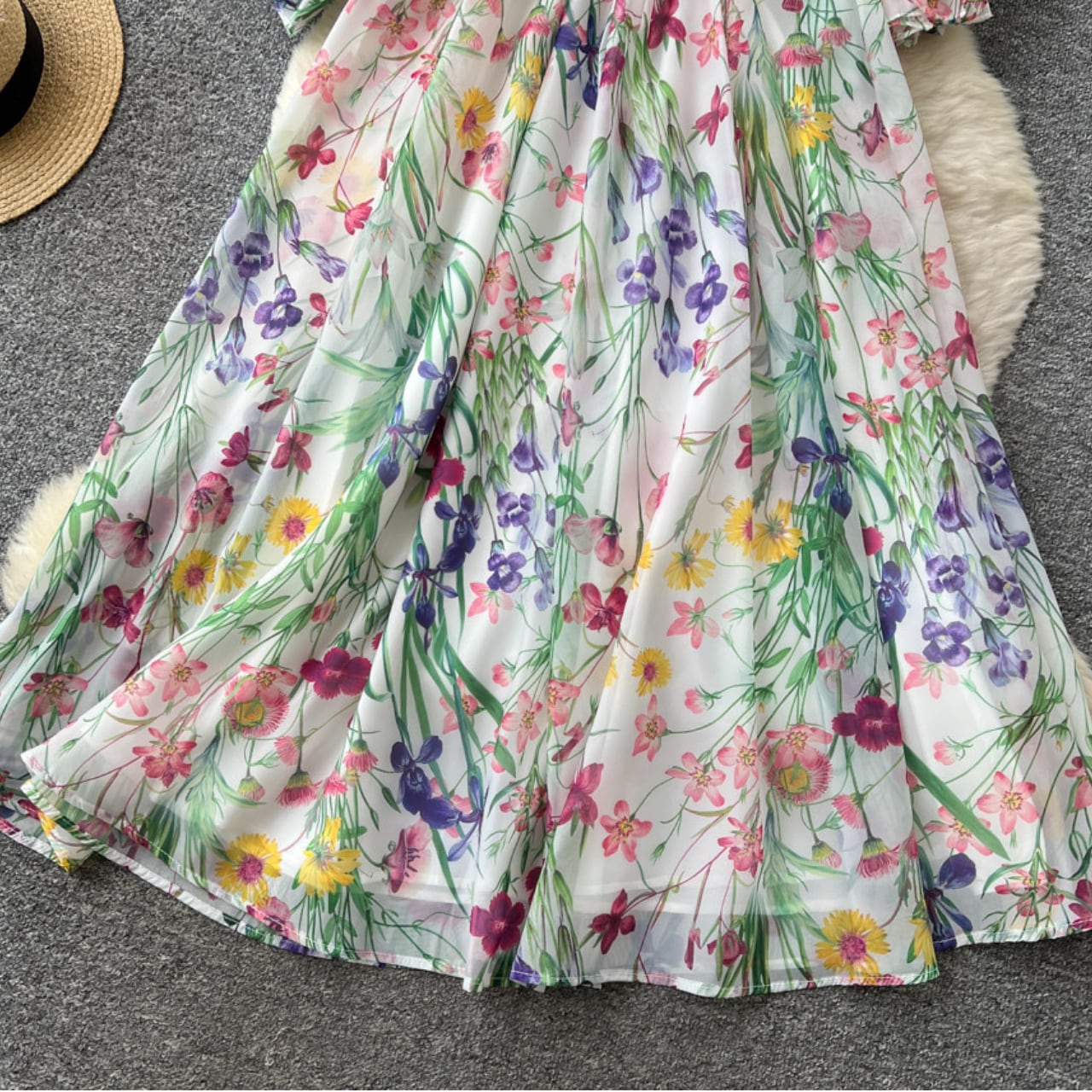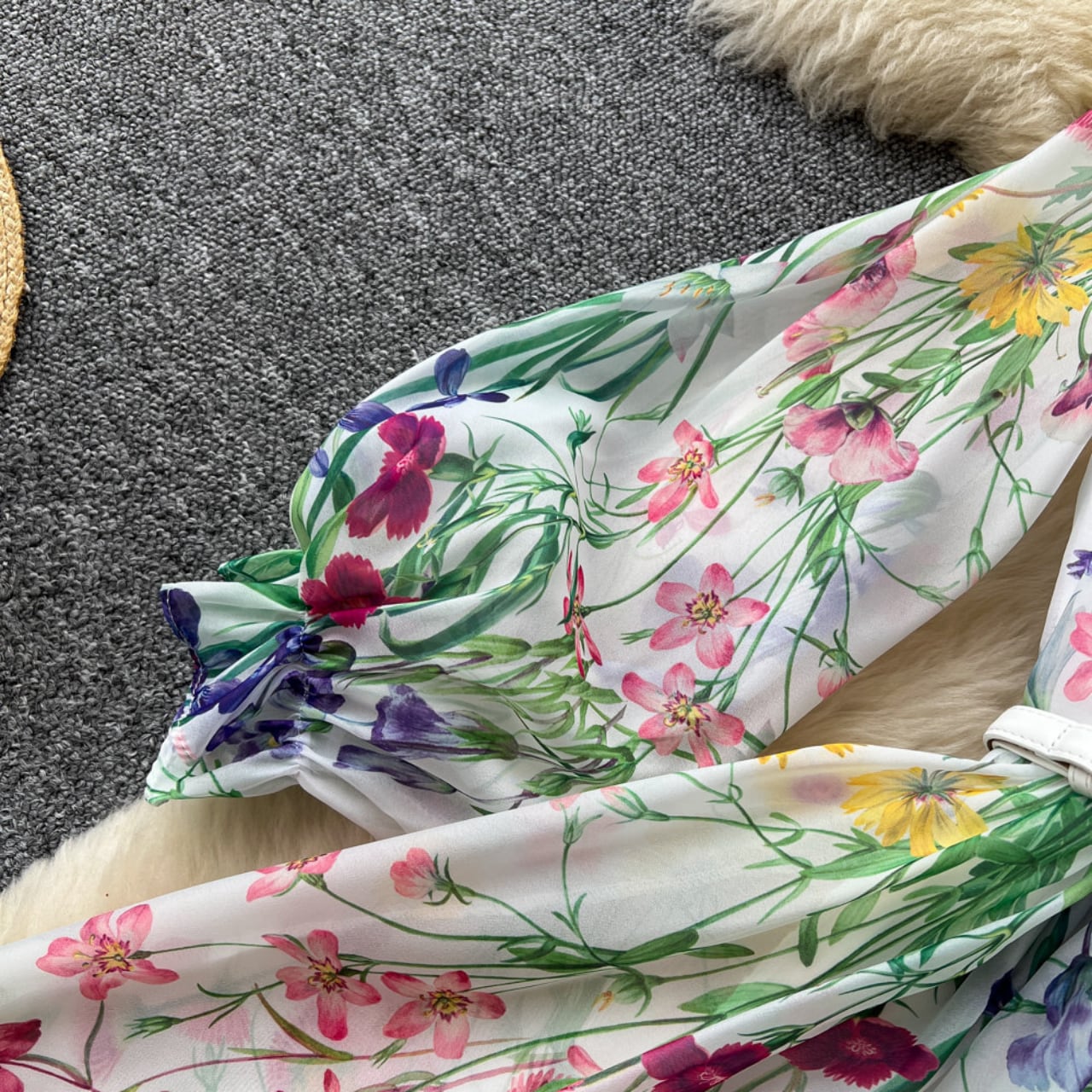 繊細なレース切替と華やかなフラワープリントが調和した、上品な存在感を放つ一着です。