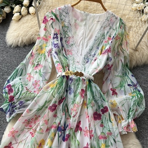 レース切替Vネックフラワープリントワンピース 2color L2179