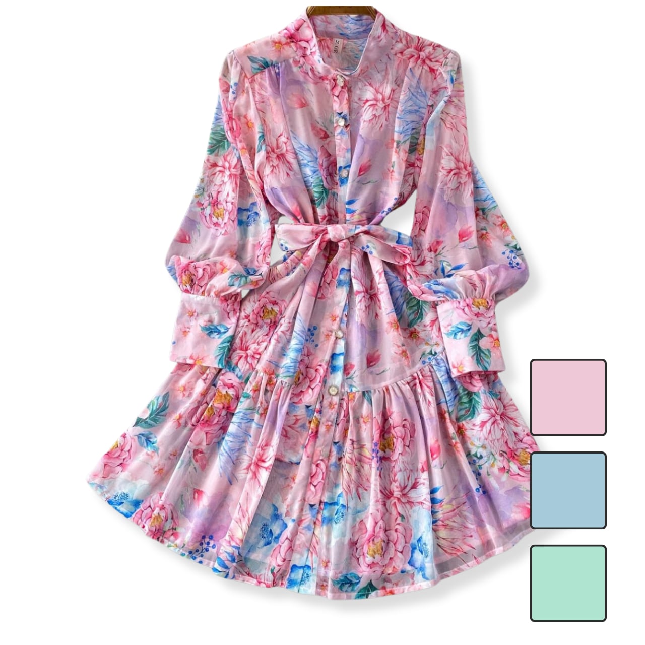 スタンドカラーと繊細な花柄が、可憐で上品な印象を演出する一着。
