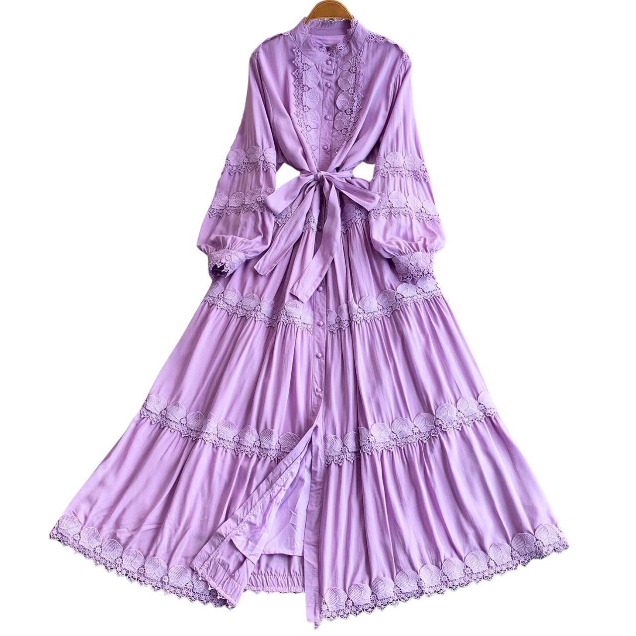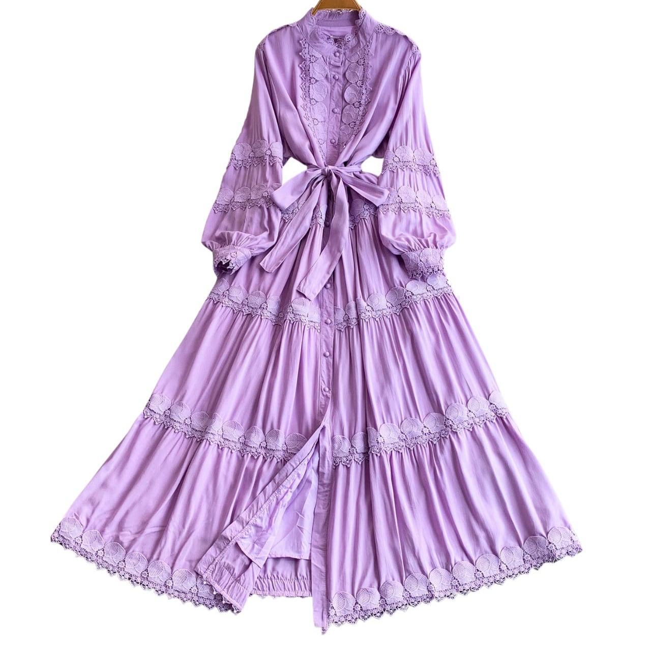繊細なレース切替が縦ラインを強調し、上品で華やかな印象を演出する一着。