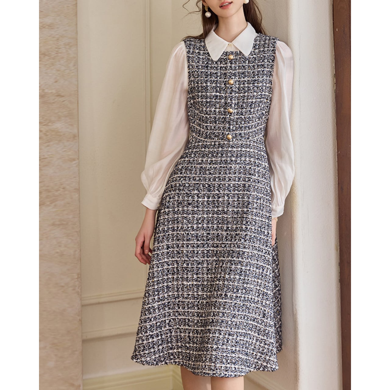 シアースリーブツイードフレアワンピース L2205